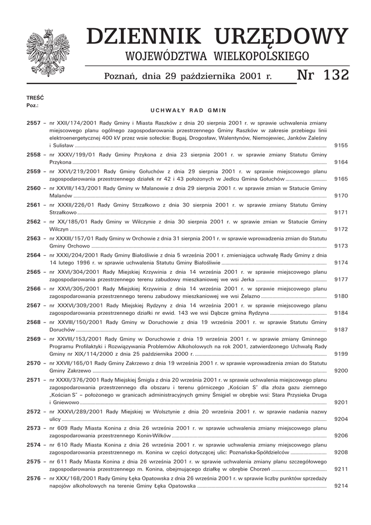 DZIENNIK URZÊDOWY WOJEWÓDZTWA WIELKOPOLSKIEGO Poznañ, dnia 29 paŸdziernika 2001 r. TREå∆ Poz.: Nr 132 UCHWA£Y RAD GMIN 2557 ñ nr XXII/174/2001 Rady Gminy i Miasta RaszkÛw z dnia 20 sierpnia 2001 r. w sprawie uchwalenia zmiany miejscowego planu ogÛlnego zagospodarowania przestrzennego Gminy RaszkÛw w zakresie przebiegu linii elektroenergetycznej 400 kV przez wsie so≥eckie: Bugaj, Drogos≥aw, WalentynÛw, Niemojewiec, JankÛw Zaleúny i Sulis≥aw ..................................................................................................................................................................................................... 9155 2558 ñ nr XXXV/199/01 Rady Gminy Przykona z dnia 23 sierpnia 2001 r. w sprawie zmiany Statutu Gminy Przykona ....................................................................................................................................................................................................... 9164 2559 ñ nr XXVI/219/2001 Rady Gminy Go≥uchÛw z dnia 29 sierpnia 2001 r. w sprawie miejscowego planu zagospodarowania przestrzennego dzia≥ek nr 42 i 43 po≥oøonych w Jedlcu Gmina Go≥uchÛw ................................ 9165 2560 ñ nr XXVIII/143/2001 Rady Gminy w Malanowie z dnia 29 sierpnia 2001 r. w sprawie zmian w Statucie Gminy MalanÛw ...................................................................................................................................................................................................... 9170 2561 ñ nr XXXII/226/01 Rady Gminy Strza≥kowo z dnia 30 sierpnia 2001 r. w sprawie zmiany Statutu Gminy Strza≥kowo ................................................................................................................................................................................................... 9171 2562 ñ nr XX/185/01 Rady Gminy w Wilczynie z dnia 30 sierpnia 2001 r. w sprawie zmian w Statucie Gminy Wilczyn ......................................................................................................................................................................................................... 9172 2563 ñ nr XXXIII/157/01 Rady Gminy w Orchowie z dnia 31 sierpnia 2001 r. w sprawie wprowadzenia zmian do Statutu Gminy Orchowo ........................................................................................................................................................................................ 9173 2564 ñ nr XXXI/204/2001 Rady Gminy Bia≥oúliwie z dnia 5 wrzeúnia 2001 r. zmieniajπca uchwa≥Í Rady Gminy z dnia 14 lutego 1996 r. w sprawie uchwalenia Statutu Gminy Bia≥oúliwie .................................................................................. 9174 2565 ñ nr XXVI/304/2001 Rady Miejskiej Krzywinia z dnia 14 wrzeúnia 2001 r. w sprawie miejscowego planu zagospodarowania przestrzennego terenu zabudowy mieszkaniowej we wsi Jerka ....................................................... 9177 2566 ñ nr XXVI/305/2001 Rady Miejskiej Krzywinia z dnia 14 wrzeúnia 2001 r. w sprawie miejscowego planu zagospodarowania przestrzennego terenu zabudowy mieszkaniowej we wsi Øelazno ................................................... 9180 2567 ñ nr XXXVI/309/2001 Rady Miejskiej Rydzyny z dnia 14 wrzeúnia 2001 r. w sprawie miejscowego planu zagospodarowania przestrzennego dzia≥ki nr ewid. 143 we wsi Dπbcze gmina Rydzyna ............................................ 9184 2568 ñ nr XXVIII/150/2001 Rady Gminy w Doruchowie z dnia 19 wrzeúnia 2001 r. w sprawie Statutu Gminy DoruchÛw .................................................................................................................................................................................................... 9187 2569 ñ nr XXVIII/153/2001 Rady Gminy w Doruchowie z dnia 19 wrzeúnia 2001 r. w sprawie zmiany Gminnego Programu Profilaktyki i Rozwiπzywania ProblemÛw Alkoholowych na rok 2001, zatwierdzonego Uchwa≥π Rady Gminy nr XIX/114/2000 z dnia 25 paüdziernika 2000 r. ....................................................................................................... 9199 2570 ñ nr XXVII/165/01 Rady Gminy Zakrzewo z dnia 19 wrzeúnia 2001 r. w sprawie wprowadzenia zmian do Statutu Gminy Zakrzewo ....................................................................................................................................................................................... 9200 2571 ñ nr XXXII/376/2001 Rady Miejskiej åmigla z dnia 20 wrzeúnia 2001 r. w sprawie uchwalenia miejscowego planu zagospodarowania przestrzennego dla obszaru i terenu gÛrniczego ìKoúcian Sî dla z≥oøa gazu ziemnego ìKoúcian Sî ñ po≥oøonego w granicach administracyjnych gminy åmigiel w obrÍbie wsi: Stara Przysieka Druga i Gniewowo ................................................................................................................................................................................................. 9201 2572 ñ nr XXXVI/289/2001 Rady Miejskiej w Wolsztynie z dnia 20 wrzeúnia 2001 r. w sprawie nadania nazwy ulicy ............................................................................................................................................................................................................... 9204 2573 ñ nr 609 Rady Miasta Konina z dnia 26 wrzeúnia 2001 r. w sprawie uchwalenia zmiany miejscowego planu zagospodarowania przestrzennego Konin-WilkÛw ......................................................................................................................... 9206 2574 ñ nr 610 Rady Miasta Konina z dnia 26 wrzeúnia 2001 r. w sprawie uchwalenia zmiany miejscowego planu zagospodarowania przestrzennego m. Konina w czÍúci dotyczπcej ulic: PoznaÒska-SpÛ≥dzielcÛw ............................ 9208 2575 ñ nr 611 Rady Miasta Konina z dnia 26 wrzeúnia 2001 r. w sprawie uchwalenia zmiany planu szczeg