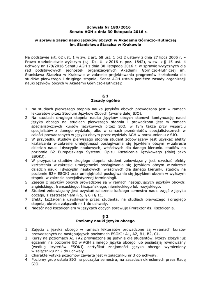 Uchwała Nr 180/2016 Senatu AGH z dnia 30 listopada 2016 r. w sprawie zasad nauki języków obcych w Akademii Górniczo-Hutniczej im. Stanisława Staszica w Krakowie Na podstawie art. 62 ust. 1 w zw. z art. 68 ust. 1 pkt 2 ustawy z dnia 27 lipca 2005 r. – Prawo o szkolnictwie wyższym (t.j. Dz. U. z 2016 r. poz. 1842), w zw. z § 15 ust. 4 uchwały nr 179/2016 Senatu AGH z dnia 30 listopada 2016 r. w sprawie wytycznych dla rad podstawowych jednostek organizacyjnych Akademii Górniczo-Hutniczej im. Stanisława Staszica w Krakowie w zakresie projektowania programów kształcenia dla studiów pierwszego i drugiego stopnia, Senat AGH ustala poniższe zasady organizacji nauki języków obcych w Akademii Górniczo-Hutniczej: §1 Zasady ogólne 1. Na studiach pierwszego stopnia nauka języków obcych prowadzona jest w ramach lektoratów przez Studium Języków Obcych (zwane dalej SJO). 2. Na studiach drugiego stopnia nauka języków obcych stanowi kontynuację nauki języka obcego na studiach pierwszego stopnia i prowadzona jest w ramach specjalistycznych kursów językowych przez SJO, w tym także przy wsparciu specjalistów z danego wydziału, albo w ramach przedmiotów specjalistycznych w całości prowadzonych w języku obcym przez wydziały AGH w porozumieniu z SJO. 3. W przypadku studiów pierwszego stopnia student zobowiązany jest uzyskać efekty kształcenia w zakresie umiejętności posługiwania się językiem obcym w zakresie dziedzin nauki i dyscyplin naukowych, właściwych dla danego kierunku studiów na poziomie B2 Europejskiego Systemu Opisu Kształcenia Językowego (dalej jako ESOKJ). 4. W przypadku studiów drugiego stopnia student zobowiązany jest uzyskać efekty kształcenia w zakresie umiejętności posługiwania się językiem obcym w zakresie dziedzin nauki i dyscyplin naukowych, właściwych dla danego kierunku studiów na poziomie B2+ ESOKJ oraz umiejętności posługiwania się językiem obcym w wyższym stopniu w zakresie specjalistycznej terminologii. 5. Zajęcia z języków obcych prowadzone są w ramach następujących języków obcych: angielskiego, francuskiego, hiszpańskiego, niemieckiego lub rosyjskiego. 6. Student zobowiązany jest uzyskać zaliczenie każdego semestru nauki zajęć z języka obcego, z zastrzeżeniem § 5, § 6 i § 11. 7. Efekty kształcenia uzyskiwane przez studenta, na studiach pierwszego i drugiego stopnia, określa załącznik nr 1 do uchwały. 8. Nadzór nad kształceniem w językach obcych sprawuje Prorektor ds. Kształcenia. §2 Poziomy nauki języka obcego 1. Zajęcia z języka obcego w ramach lektoratów prowadzone są w ramach kursów prowadzonych na następujących poziomach ESOKJ: A1, A2, B1, B2, C1. 2. Kursy na poziomach A1 i A2 prowadzone są jedynie dla studentów, którzy złożyli już egzamin na poziomie B2 w AGH z innego języka obcego lub posiadają równoważny (według kryteriów ESOKJ) certyfikat znajomości języka obcego wymieniony w załączniku nr 2 do uchwały. 3. Charakterystyka poziomów zawarta jest w załączniku nr 3 do uchwały. 4. Poziomy grup ustala SJO na początku semestru, na zasadach określonych przez Radę SJO. §3 Studia pierwszego stopnia 1. Łączny wymiar godzinowy obowiązkowych zajęć z języka obcego na studiach pierwszego stopnia: 1) stacjonarnych wynosi 135 godzin; 2) niestacjonarnych wynosi 75-135 godzin, w zależności od decyzji Rady Wydziału. 2. Na studiach stacjonarnych pierwszego stopnia zajęcia z języków obcych rozpoczynają się od drugiego semestru studiów i trwają 3 semestry: 1) 1 semestr 30 godzin; 2) 2 semestr 45 godzin; 3) 3 semestr 60 godzin. 3. Na studiach niestacjonarnych pierwszego stopnia zajęcia z języka obcego mogą rozpoczynać się od pierwszego semestru studiów i trwają 3 lub 4 semestry. Rozkład godzinowy zajęć na poszczególnych semestrach jest uzależniony od decyzji Rady Wydziału. 4. Przysługującą liczbę godzin zajęć z języka obcego student może wykorzystać na naukę: 1) jednego języka obcego, stanowiącego kontynuację języka obcego zdawanego na egzaminie maturalnym albo 2) dwóch różnych języków obcych, w przypadku, o którym mowa w § 5 i § 6. 5. Student powinien zostać poinformowany na stronie swojego Wydziału oraz w bazie Syllabus AGH o rodzaju języka obcego, zalecanego dla danego kierunku studiów, przed rozpoczęciem studiów. §4 Egzamin z języka obcego na studiach pierwszego stopnia 1. Na studiach pierwszego stopnia obowiązuje wymóg złożenia egzaminu z języka obcego na poziomie B2 w rozumieniu ESOKJ. 2. Za zaliczenie zajęć z języka obcego na studiach pierwszego stopnia student uzyskuje 5 punktów ECTS, które przypisywane są po realizacji pełnej liczby godzin oraz złożeniu egzaminu, o którym mowa w ust. 1, z wynikiem pozytywnym na poziomie B2, z zastrzeżeniem § 5 i § 6. 3. Ocena końcowa z lektoratu ustalana jest na podstawie średniej arytmetycznej wszystkich ocen z zaliczeń poszczególnych semestrów oraz pozytywnej oceny z egzaminu. 4. W przypadku studiów stacjonarnych egzamin końcowy z lektoratu przeprowadzany jest w czwartym semestrze studiów, centralnie dla całej Uczelni. 5. Warunkiem dopuszczenia do egzaminu z języka obcego jest uzyskanie zaliczeń ze wszystkich semestrów. 6. Szczegółowy opis egzaminu na poziomie B2 jest zawarty w załączniku nr 4 do uchwały. 7. Egzamin składa się z części pisemnej oraz z części ustnej. 8. Na studiach stacjonarnych harmonogram egzaminów zawierający trzy daty terminu podstawowego oraz dwa terminy poprawkowe ustala Kierownik SJO i ogłasza studentom nie później niż na 3 tygodnie przed rozpoczęciem sesji egzaminacyjnej. 9. Zapisy na egzamin na studiach stacjonarnych dokonywane są nie później niż na 7 dni roboczych przed terminem egzaminu. 10. Na studiach stacjonarnych egzamin w terminie podstawowym odbywa się w sesji letniej na czwartym semestrze studiów. Część pisemna odbywa się w dniu roboczym letniej sesji egzaminacyjnej, tj. mię