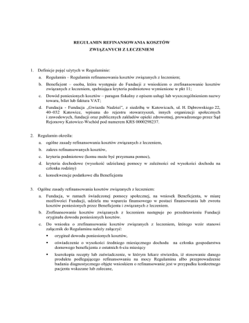 REGULAMIN REFINANSOWANIA KOSZTÓW ZWIĄZANYCH Z LECZENIEM 1. Definicje pojęć użytych w Regulaminie: a. Regulamin – Regulamin refinansowania kosztów związanych z leczeniem; b. Beneficjent – osoba, która występuje do Fundacji z wnioskiem o zrefinansowanie kosztów związanych z leczeniem, spełniająca kryteria podmiotowe wymienione w pkt 11; c. Dowód poniesionych kosztów – paragon fiskalny z opisem usługi lub wyszczególnieniem nazwy towaru, bilet lub faktura VAT; d. Fundacja - Fundacja „Gwiazda Nadziei”, z siedzibą w Katowicach, ul. H. Dąbrowskiego 22, 40–032 Katowice, wpisana do rejestru stowarzyszeń, innych organizacji społecznych i zawodowych, fundacji oraz publicznych zakładów opieki zdrowotnej, prowadzonego przez Sąd Rejonowy Katowice-Wschód pod numerem KRS 0000298237. 2. Regulamin określa: a. ogólne zasady refinansowania kosztów związanych z leczeniem, b. zakres refinansowanych kosztów, c. kryteria podmiotowe (komu może być przyznana pomoc), d. kryteria dochodowe (wysokość udzielanej pomocy w zależności od wysokości dochodu na członka rodziny) e. konsekwencje podatkowe dla Beneficjenta 3. Ogólne zasady refinansowania kosztów związanych z leczeniem: a. Fundacja, w ramach świadczonej pomocy społecznej, na wniosek Beneficjenta, w miarę możliwości Fundacji, udziela mu wsparcia finansowego w postaci finansowania lub zwrotu kosztów poniesionych przez Beneficjenta i związanych z leczeniem. b. Zrefinansowanie kosztów związanych z leczeniem następuje po przedstawieniu Fundacji oryginału dowodu poniesionych kosztów. c. Do wniosku o zrefinansowanie kosztów związanych z leczeniem, którego wzór stanowi załącznik do Regulaminu należy załączyć: oryginał dowodu poniesionych kosztów, oświadczenie o wysokości średniego miesięcznego dochodu domowego beneficjenta z ostatnich 6-ciu miesięcy kserokopia recepty lub zaświadczenie, w którym lekarz stwierdza, iż stosowanie danego produktu podlegającego refinansowaniu na mocy Regulaminu albo przeprowadzenie badania diagnostycznego objęte wnioskiem o refinansowanie jest w przypadku konkretnego pacjenta wskazane lub zalecane, na członka gospodarstwa d. Fundacja refinansuje koszty związane z leczeniem poniesione nie wcześniej niż na 3 miesiące przed złożeniem wniosku do Fundacji lub nadaniem wniosku wraz z załącznikami w placówce pocztowej operatora publicznego w przypadku złożenia wniosku za pośrednictwem poczty. e. Fundacja zastrzega sobie prawo żądania przedstawienia dodatkowych dokumentów, w sytuacji gdy przedstawiona dokumentacja nie będzie stanowiła wystarczającej podstawy do stwierdzenia konieczności udzielenia pomocy Beneficjentowi. f. Fundacja zastrzega sobie prawo odmowy zrefinansowania kosztów związanych z leczeniem w szczególnie uzasadnionych przypadkach, pomimo spełnienia wszystkich określonych w Regulaminie kryteriów podmiotowych i przedmiotowych. g. Finansowanie kosztów związanych z leczeniem następuje po rozpatrzeniu i akceptacji przez Zarząd Fundacji pisemnego wniosku o sfinansowanie. h. Wniosek o sfinansowanie winien zawierać załączniki wymienione w pkt. 3 lit. c 4. Zakres refinansowanych kosztów a. Maksymalna wysokość kosztów, o których refinansowanie może ubiegać się Beneficjent wynosi 450 zł brutto w danym roku kalendarzowym. b. Beneficjent może wnioskować o refundację kosztów związanych z leczeniem składając kilka wniosków, jednakże suma refundowanej kwoty w trakcie roku kalendarzowego nie powinna przekroczyć kwoty wymienionej w pkt. 4 lit. a. 5. Limit kwotowy wymieniony w pkt 4 lit. a niniejszego regulaminu nie ma zastosowania w przypadku pomocy udzielonej beneficjentowi w ramach kwot zebranych przez Fundację lub przekazanych Fundacji na leczenie konkretnego Beneficjenta a. w trakcie zbiórki publicznej, b. w postaci darowizn c. w postaci przekazanego 1% podatku dochodowego od osób fizycznych 6. W przypadku pozyskania przez Fundację środków finansowych na wsparcie chorych z konkretnym schorzeniem Fundacja może wprowadzić dla tej grupy chorych Uchwałą Zarządu odmienne limity rocznego wsparcia, o którym mowa w pkt 4 lit. a, 7. Fundacja refunduje, na zasadach określonych w Regulaminie, wyłącznie koszty: a. badań diagnostycznych, b. produktów leczniczych c. środków pielęgnacyjnych i opatrunkowych (w tym: lecznicze kremy, płyny, pasty, mydła, itp.), d. odżywek wspomagających leczenie i rekonwalescencję, e. witamin, f. pampersów, mat i podkładów dla osób obłożnie chorych, g. łóżek i materacy dla osób obłożnie chorych, h. szczepionek, i. składników diety niezbędnej do stosowania w celu poprawy bądź utrzymania aktualnego stanu zdrowia, j. pobytu opiekunów prawnych nieletniego Beneficjenta w przyszpitalnym hotelu na czas pobytu Beneficjenta w placówce medycznej, k. zabiegów medycznych, l. zabiegów rehabilitacyjnych i kuracji, w tym również kosztów pobytu i podróży do placówek wykonujących wyżej wymienione zabiegi i kuracje (wyłącznie ze środków zebranych ze wskazaniem na konkretnego podopiecznego), m. konsultacji medycznych, n. zakupu, konserwacji i naprawy sprzętu rehabilitacyjnego i medycznego; o. przejazdu osób chorych, w razie potrzeby wraz z opiekunami (w tym między innymi: kosztów paliwa, opłat parkingowych, biletów komunikacji publicznej) do placówek opieki medycznej w celu leczenia bądź przeprowadzenia badań kontrolnych; p. pobytu w placówkach opieki medycznej opiekunów towarzyszących osobie chorej (przykładowo kosztów pobytu opiekuna w hotelu przyszpitalnym) ze szczególnym uwzględnieniem rodziców niepełnoletnich dzieci i opiekunów osób upośledzonych; q. finansowanie wydatków poniesionych w związku z koniecznością zapewnienia specjalnej opieki i pielęgnacji w okresie po operacji / zabiegu / rekonwalescencji 8. Wnioski o refundację kosztów podróży Fundacja rozpatruje pod warunkiem dołączenia dowodu odbycia konsultacji medy