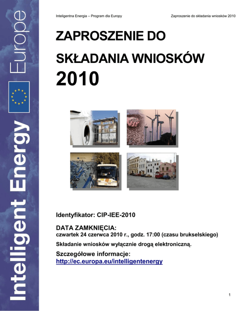 Inteligentna Energia – Program dla Europy Zaproszenie do składania wniosków 2010 ZAPROSZENIE DO SKŁADANIA WNIOSKÓW 2010 Identyfikator: CIP-IEE-2010 DATA ZAMKNIĘCIA: czwartek 24 czerwca 2010 r., godz. 17:00 (czasu brukselskiego) Składanie wniosków wyłącznie drogą elektroniczną. Szczegółowe informacje: http://ec.europa.eu/intelligentenergy 1 Inteligentna Energia – Program dla Europy Zaproszenie do składania wniosków 2010 ZAPROSZENIE DO SKŁADANIA WNIOSKÓW 2010 NA DZIAŁANIA W RAMACH PROGRAMU „INTELIGENTNA ENERGIA – PROGRAM DLA EUROPY” Identyfikator: CIP-IEE-2010 INTELIGENTNA ENERGIA – PROGRAM DLA EUROPY .................................................... 3 BUDŻET, PROGI DOFINANSOWANIA I KWALIFIKACJA KOSZTÓW ............................... 4 KRYTERIA KWALIFIKACJI ................................................................................................. 5 1. 2. 3. Które organizacje i państwa spełniają wymogi? ................................................................................. 5 Z ilu partnerów musi składać się konsorcjum projektu? ..................................................................... 6 Działania i priorytety............................................................................................................................ 6 Składanie wniosku .............................................................................................................................. 6 Podstawy wykluczenia ........................................................................................................................ 6 Kary administracyjne i finansowe ....................................................................................................... 7 3.1 3.2 3.3 3.4 3.5 3.6 4. KRYTERIA WYBORU .......................................................................................................... 8 Zdolność finansowa składającego wniosek ........................................................................................ 8 Zdolność techniczna składającego wniosek ....................................................................................... 8 4.1 4.2 5. 6. 7. 8. 9. 10. KRYTERIA PRZYZNAWANIA DOTACJI ............................................................................. 8 OGÓLNE WARUNKI PRZYZNAWANIA DOTACJI .............................................................. 9 SKŁADANIE WNIOSKÓW ................................................................................................. 10 DODATKOWE INFORMACJE ............................................................................................ 10 HARMONOGRAM PROGRAMU ........................................................................................ 10 PRIORYTETY I RODZAJE DZIAŁAŃ NA ROK 2010 ......................................................... 11 10.1 10.2 10.3 10.4 Efektywność energetyczna i racjonalne wykorzystanie zasobów (SAVE) ................................... 11 Nowe i odnawialne źródła energii (ALTENER)............................................................................. 11 Energia w transporcie (STEER) ................................................................................................... 12 Inicjatywy zintegrowane ................................................................................................................ 13 2 Inteligentna Energia – Program dla Europy 1. Zaproszenie do składania wniosków 2010 INTELIGENTNA ENERGIA – PROGRAM DLA EUROPY Celem Programu Inteligentna Energia – Program dla Europy jest zapewnienie bezpiecznej, zrównoważonej 1 i konkurencyjnej energetyki dla Europy poprzez prowadzenie działań : sprzyjających zwiększeniu efektywności energetycznej i racjonalnemu korzystaniu z zasobów energetycznych; promujących nowe i odnawialne źródła energii i wspierających dywersyfikację źródeł energii; promujących zwiększenie efektywności energetycznej i korzystanie z nowych i odnawialnych źródeł energii w transporcie. 2 Program przede wszystkim wnosi wkład w Politykę energetyczną Europy , obejmującą plan działania UE 3 na rzecz efektywności energetycznej oraz Dyrektywę dotyczącą promocji wykorzystania energii ze źródeł 4 odnawialnych . Inteligentna Energia – Program dla Europy oparty jest na doświadczeniu zdobytym w trakcie realizacji 5 poprzedniego Programu Inteligentna Energia - Europa (2003-2006) . Program ten stał się głównym instrumentem UE służącym do zwalczania pozatechnologicznych barier, utrudniających rozpowszechnienie efektywności energetycznej i upowszechnienie wykorzystania nowych i odnawialnych źródeł energii. Od roku 2007 Inteligentna Energia – Program dla Europy ujęty jest w ogólnym Programie Ramowym na rzecz 6 Konkurencyjności i Innowacji (CIP) z myślą o wspieraniu osiągania celów polityki energetycznej UE i wdrażania Strategii Lizbońskiej. Program zarządzany jest przez Agencję Wykonawczą ds. Konkurencyjności i Innowacji (EACI, wcześniej znaną pod nazwą Agencji Wykonawczej ds. Inteligentnej Energii), zgodnie z uprawnieniami nadanymi przez Komisję Europejską. 7 Inteligentna Energia – Program dla Europy ma na celu : a) wprowadzenie elementów koniecznych do poprawy zrównoważonego rozwoju oraz potencjału miast i regionów, jak i przygotowania środków prawnych potrzebnych do realizacji związanych z tym celów strategicznych; opracowanie środków i instrumentów uzupełniających, monitorujących i służących do oceny wpływu środków przyjętych przez UE i jej kraje członkowskie w obszarach, do których odnosi się Program. b) zwiększenie nakładów inwestycyjnych w państwach członkowskich na nowe i profesjonalnie działające technologie związane z efektywnością energetyczną, odnawialnymi źródłami energii i dywersyfikacją jej źródeł, również w transporcie. Cel ten ma zostać osiągnięty poprzez rozpowszechnienie na rynku, rozpoznanych już w