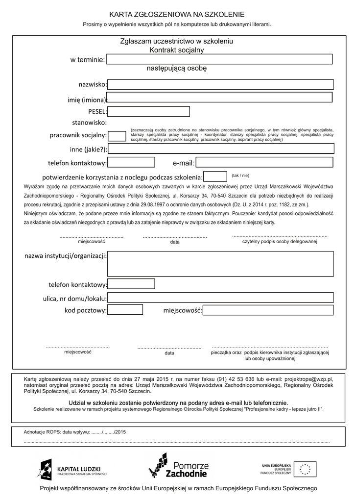 KARTA ZGŁOSZENIOWA NA SZKOLENIE Prosimy o wypełnienie wszystkich pól na komputerze lub drukowanymi literami. Zgłaszam uczestnictwo w szkoleniu Kontrakt socjalny w terminie: następującą osobę (zaznaczają osoby zatrudnione na stanowisku pracownika socjalnego, w tym również główny specjalista, starszy specjalista pracy socjalnej  koordynator, starszy specjalista pracy socjalnej, specjalista pracy socjalnej, starszy pracownik socjalny, pracownik socjalny, aspirant pracy socjalnej) email: (tak / nie) Wyrażam zgodę na przetwarzanie moich danych osobowych zawartych w karcie zgłoszeniowej przez Urząd Marszałkowski Województwa Zachodniopomorskiego  Regionalny Ośrodek Polityki Społecznej, ul. Korsarzy 34, 70540 Szczecin dla potrzeb niezbędnych do realizacji procesu rekrutacj, zgodnie z przepisami ustawy z dnia 29.08.1997 o ochronie danych osobowych (Dz. U. z 2014 r. poz. 1182, ze zm.). Niniejszym oświadczam, że podane przeze mnie informacje są zgodne ze stanem faktycznym. Pouczenie: kandydat ponosi odpowiedzialność za składanie oświadczeń niezgodnych z prawdą lub za zatajenie nieprawdy w związaku ze składaniem niniejszej karty. ........................................... miejscowość ........................................... miejscowość ........................................... data ........................................... data ................................................................ czytelny podpis osoby delegowanej .............................................................................. pieczątka oraz podpis kierownika instytucji zgłaszającej lub osoby upoważnionej Kartę zgłoszeniową należy przesłać do dnia 27 maja 2015 r. na numer faksu (91) 42 53 636 lub email: [email protected], natomiast oryginał przesłać pocztą na adres: Urząd Marszałkowski Województwa Zachodniopomorskiego, Regionalny Ośrodek Polityki Społecznej, ul. Korsarzy 34, 70540 Szczecin. Udział w szkoleniu zostanie potwierdzony na podany adres email lub telefonicznie. Szkolenie realizowane w ramach projektu systemowego Regionalnego Ośrodka Polityki Społecznej "Profesjonalne kadry  lepsze jutro II". Adnotacje ROPS: data wpływu: ......../......../2015 ....................................................................................................................................................................................................................................... Projekt współfinansowany ze środków Unii Europejskiej w ramach Europejskiego Funduszu Społecznego