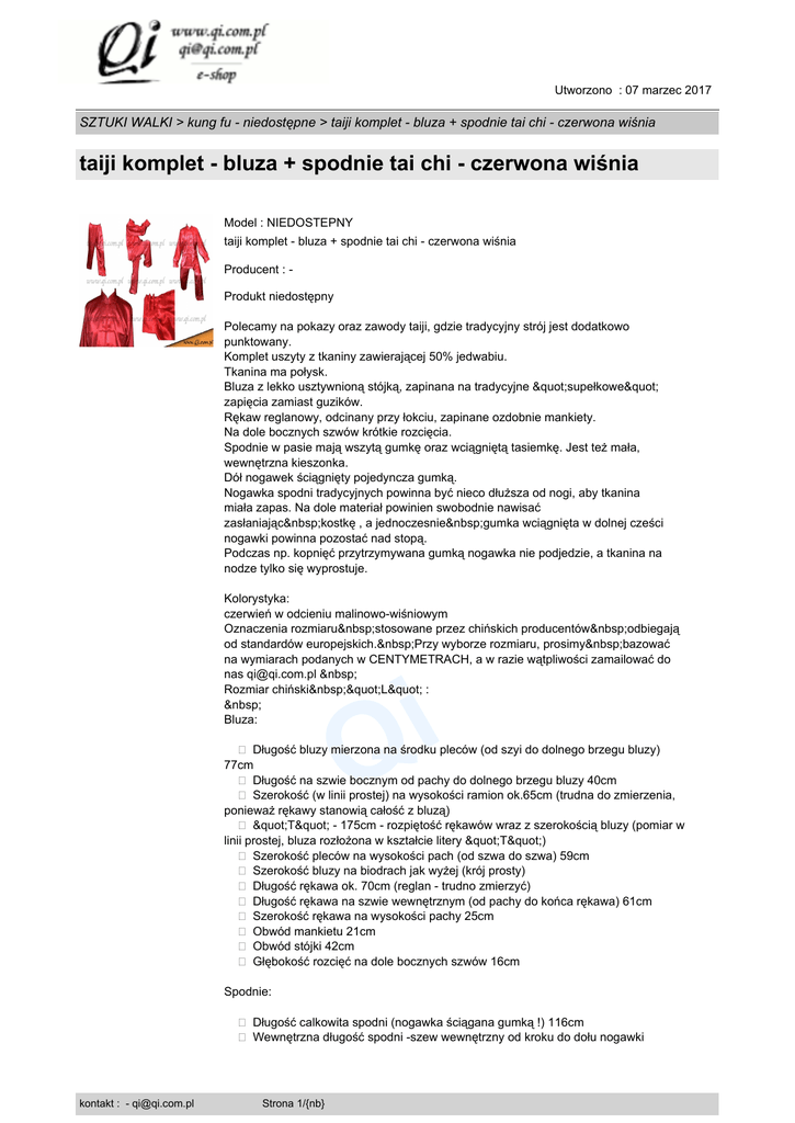 Utworzono : 07 marzec 2017 SZTUKI WALKI > kung fu - niedostępne > taiji komplet - bluza + spodnie tai chi - czerwona wiśnia taiji komplet - bluza + spodnie tai chi - czerwona wiśnia Model : NIEDOSTEPNY taiji komplet - bluza + spodnie tai chi - czerwona wiśnia Producent : Produkt niedostępny Polecamy na pokazy oraz zawody taiji, gdzie tradycyjny strój jest dodatkowo punktowany. Komplet uszyty z tkaniny zawierającej 50% jedwabiu. Tkanina ma połysk. Bluza z lekko usztywnioną stójką, zapinana na tradycyjne "supełkowe" zapięcia zamiast guzików. Rękaw reglanowy, odcinany przy łokciu, zapinane ozdobnie mankiety. Na dole bocznych szwów krótkie rozcięcia. Spodnie w pasie mają wszytą gumkę oraz wciągniętą tasiemkę. Jest też mała, wewnętrzna kieszonka. Dół nogawek ściągnięty pojedyncza gumką. Nogawka spodni tradycyjnych powinna być nieco dłuższa od nogi, aby tkanina miała zapas. Na dole materiał powinien swobodnie nawisać zasłaniając kostkę , a jednoczesnie gumka wciągnięta w dolnej cześci nogawki powinna pozostać nad stopą. Podczas np. kopnięć przytrzymywana gumką nogawka nie podjedzie, a tkanina na nodze tylko się wyprostuje. Kolorystyka: czerwień w odcieniu malinowo-wiśniowym Oznaczenia rozmiaru stosowane przez chińskich producentów odbiegają od standardów europejskich. Przy wyborze rozmiaru, prosimy bazować na wymiarach podanych w CENTYMETRACH, a w razie wątpliwości zamailować do nas [email protected] Rozmiar chiński "L" : Bluza: i Q � Długość bluzy mierzona na środku pleców (od szyi do dolnego brzegu bluzy) 77cm � Długość na szwie bocznym od pachy do dolnego brzegu bluzy 40cm � Szerokość (w linii prostej) na wysokości ramion ok.65cm (trudna do zmierzenia, ponieważ rękawy stanowią całość z bluzą) � "T" - 175cm - rozpiętość rękawów wraz z szerokością bluzy (pomiar w linii prostej, bluza rozłożona w kształcie litery "T") � Szerokość pleców na wysokości pach (od szwa do szwa) 59cm � Szerokość bluzy na biodrach jak wyżej (krój prosty) � Długość rękawa ok. 70cm (reglan - trudno zmierzyć) � Długość rękawa na szwie wewnętrznym (od pachy do końca rękawa) 61cm � Szerokość rękawa na wysokości pachy 25cm � Obwód mankietu 21cm � Obwód stójki 42cm � Głębokość rozcięć na dole bocznych szwów 16cm Spodnie: � Długość calkowita spodni (nogawka ściągana gumką !) 116cm � Wewnętrzna długość spodni -szew wewnętrzny od kroku do dołu nogawki kontakt : - [email protected] Strona 1/{nb} Utworzono : 07 marzec 2017 SZTUKI WALKI > kung fu - niedostępne > taiji komplet - bluza + spodnie tai chi - czerwona wiśnia taiji komplet - bluza + spodnie tai chi - czerwona wiśnia - 83cm � Pas na gumce, obwód od 58 do 76cm. Wszyta tasiemka umożliwia dodatkowe ściągnięcie pasa. � Szerokość w biodrach 60cm (zalecany max. obwód do 112cm) � Szerokość nogawki na wysokości uda 35cm � Szerokość nogawki na dole (przed gumką) 26cm Producent zaleca pranie ręczne w letniej wodzie (do 40 stopni C). Cena : 0,00 zł Brutto ( 0,00 zł Netto) Dostępność: Produkt dostępny w naszym sklepie od 20 czerwiec 2009 i Q kontakt : - [email protected] Strona 2/{nb}