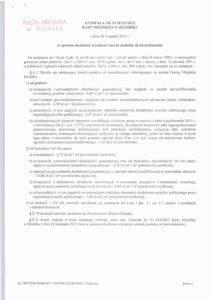 RADA M I L ~ L \ z ~ w Kiodzku UCllWALA NR XV11/121/2015 RADY MIEJSKIEJ W KLODZKU z dnia 26 listopada 20 15 r. w sprawie okreilenis wysokoici stawelc podatku od nieruchomoSci Na podstawie art. 18 ust. 2 pkt. 8, art.40 ust. I ,art.4 I ust. I i art.42 ustawy z dnia 8 marca 1990 r. o samorzqdzie gminnym (tekst jednolity: Dz.U. z 20 15 r. poz. 15 15 z pbin. zm.) i art. 5 ust. 1 ustawy z dnia 12 stycznia 1991 r. o podatkach i oplatach lokalnych (tekst jednolity: Dz.U. z 2014 r. poz. 849 z p6zn. zm.) zarqdza siq co nastepuje: 8 1. 1. Okreila siq nastqpujqce stawki podatku od nieruchoriloici obowiqzujqce na terenie Gminy Miejskiej Klodzko: a)zwir)zanych zprowadzeniem dziaialnoici gospodarczej, bez wzgledu na sposob zakwalifikowania w ewidencji gruntow i budynkbw - 0,89 zl od 1 111' powierzchni, b) pod wodami powierzchniowymi stojqcyrni lub woda~nipowierzchniowymi ptynqcymi jezior i zbiornik6w sztucznych - 4,518 zl od I ha powierzchni, c) pozostalych, w tym zajqtych na prowadzcnie odplatnej statutowej dziaialnoici poiytku publicznego przez organizacje poiytku publicznego - 0,47 zt od I mpowierzchni, d) niezabudowanych objqtych obszarem rewitalizacji, o ktorym mowa w ustawie z dnia 9 paidziernika 2015 r. o rewitalizacji (Dz.U. poz. 1777), i potozonych na terenach, dla ktorych miejscowy plan zagospodarowania przestrzennego przewiduje przeznaczenie pod zabudowe mieszkaniowq. uslugowq albo zabudowg o przeznaczeniu mieszanym obejniu.jqcyn~wylqcznie te rodzaje zabudowy, jeieli od dnia wejicia w 2ycie tego planu w odniesieniu do tych grunt6w uplynal okres 4 lat, a w tym czasie nie zakoliczono budowy zgodnie z przepisami prawa budowlanego - 3 zl od 1 mZ powierzchni;. 2) od budynkow lub ich czqici: a) mieszkalnych - 0,75 zl od 1 mZpowierzchni uiytkowe.j, b) zwiqzanych z prowadzeniem dzialalnoici gospodarcze-j oraz od budynk6w mieszkalnych lub ich czeici zajqtych na prowadzenie dziatalnoici gospodarczej - 2 1.87 zt od I m2 powierzchni uiytkowej, c) zajqtych na prowadzenie dziaialnoici gospodarczej w zakresie obrotu kwalifikowanym materialem siewnym - 10,68 zl od I m2 powierzchni uiytkowej, d) zwiqzanych z udzielaniem iwiadczeli zdrowotnycli w rozumieniu przepisow o dzialalnoici leczniczej, zajqtych przez podmioty i~dzielajqcetych Swiadczeli - 4.65 zl od I m2 powierzchni uiytkowej, e) od pozostalych. w tym zajqtych na prowadzenie odplatnej statutowej dziatalnoici poiytku publicznego przez organizacje poiytku publicznego - 7,68 zl od I m2 powierzchni uiytkowej; 3)od budowli - 2% ich wartoici okreilonej na podstawie art. 4 ust. I pkt. 3 i ust. 3-7 ustawy o podatkach i oplatach lokalnych. 5 2. Wykonanie uchwafy powierza siq Burmistrzowi Miasta Klodzka. 5 3. Z dniem wejicia w iycie niniejszej ~~chwaly,traci moc Uchwala Nr XL/454/2013 Rady Miejskiej w Klodzku z dnia 28 listopada 2013 roku w sprawie okrcilenia wysokoici stawek podatku od nieruchomoici. Id: CB87CE9E-OABD-4D37-88F4-BIA75CB3ABDA. I'odpisany Strona 1 § 4. Uchwala wchodzi w zycie po uptywie 14 dni od dnia ogloszenia w Dzienniku Urzedowym Wojew6dztwa Dolnoilqskiego, nie wczeiniej jednak nii z dniem I stycznia 20 16 r. \/ (-7% Tomasz ~ a b s k i Id: CB87CE9E-OABD-4D37-88F4-B IA75CB3ABDA. Podpisany Strona 2 Uzasadnienie Gbrne granice stawek podatkow i opiat lokalnych na 2016 rok zostaty okreilone w Obwieszczeniu Ministra Finansow z dnia 5 sierpnia 20 15 roku w sprawie gornych granic stawek kwotowych podatkbw i oplat lokalnych w 20 16 r. (M.P. z 20 15 r., poz. 735) na podstawie dyspozycji wynikajqcej z art. 20 ust.2 ustawy z dnia 12 stycznia 1991 roku o podatkach i opiatach lokalnych ( t.j. Dz.U. z 2014 r. poz. 849 z poin. zm.). Stawki obowiqzujqce w danym roku podatkowym ulegajq corocznie zmianie na nastgpny rok podatkowy w stopniu odpowiadajqcym wskainikowi cen towarow i uslug konsumpcyjnych w okresie pierwszego p6lrocza roku, wkt6rym stawki ulegaja zmianie, w stosunku do analogicznego okresu roku poprzedniego i sq zaokqglane w gbrq do peinych groszy. Wskainik cen ustalony w komunikacie Prezesa Glbwnego Urzqdu Statystycznego z dnia 15 lipca 20 15 r. w sprawie wskainika cen towarow i usiug konsumpcyjnych w I pohoczu 2015 r. wynosi 98,8 %, co oznacza spadek cen (deflacjq) o 1,2 %. (M.P. z dnia 24 lipca 2015 r. poz.640). W zwiqzku z powyiszym Minister Finansow pomniejszyt gorne granice stawek kwotowych o 1,2% na kolejny rok podatkowy, zaokrqglajqc je w gorq do pelnych groszy. W uchwale uwzglqdniono zrniany dotycqce wprowadzenia nowych okreilen dla niektorych stawek podatkowych wynikajqcych z przepisow prawnych, ktdre bedq obowiqzywaly od pocqtku 2016 roku. Na podstawie ustawy z dnia 25 czerwca 20 15 r. o zmianie ustawy o samorzqdzie gminnym oraz niektbrych innych ustaw (Dz.U. z 2015 r. poz.1045) zmieniono brzmienie stawki podatkowej od gruntow, o ktdrej mowa w art. 5 ust.1 pkt 1 1it.b ustawy o podatkach i oplatach lokalnych, w ten sposob. ze zamiast.: ,,pod jeziorarni, zajqtych na zbiorniki wodne retencyjne lub elektrowni wodnych", wprowadzono: ,,pod wodami powierzchniowymi stojqcymi lub wodami powierzchniowymi ptynqcymi jezior i zbiornikow sztucznych". Ponadto, ustawq z dnia 9 paidziernika 20 15 r. o rewitalizacji (Dz.U. z 2015 r, poz. 1777) wprowadzono nowq stawkq dla gruntow niezabudowanych objqtym obszarenl rewitalizacji, o ktorym mowa w tej ustawie, kt6rq szczegotowo okreilono w 1 ust. 1 pkt 1 1it.d uchwaiy. Gorne granice dla ww. stawek o nowym brzmieniu zostaly okreilone w aktach prawnych, na mocy kt6rych weszly w zycie. W uchwale okreilono stawki podatkowe na poziomie ogtoszonym w obwieszczeniu Ministra Finans6w, za wyjqtkiem jednej stawki, o ktorej mowa w (j 1 ~1st.1pkt.2 lit. b uchwaly, a mianowicie: ,,od budynkow lub ich czqici z w i p n y c h z prowadzeniem dziaialnoici gospodarczej oraz od budynkow mieszkalnych lub ich czqBci zajetych na prowadzenie dzialalnoici gospodarczej". ktora pozostaia na poziomie niezmienionym w stosunku do obowiqzujqcej stawki na terenie gniiny w roku biezqcym i jest niisza o 0,99 zl w stosunku do stawki podanej w ob
