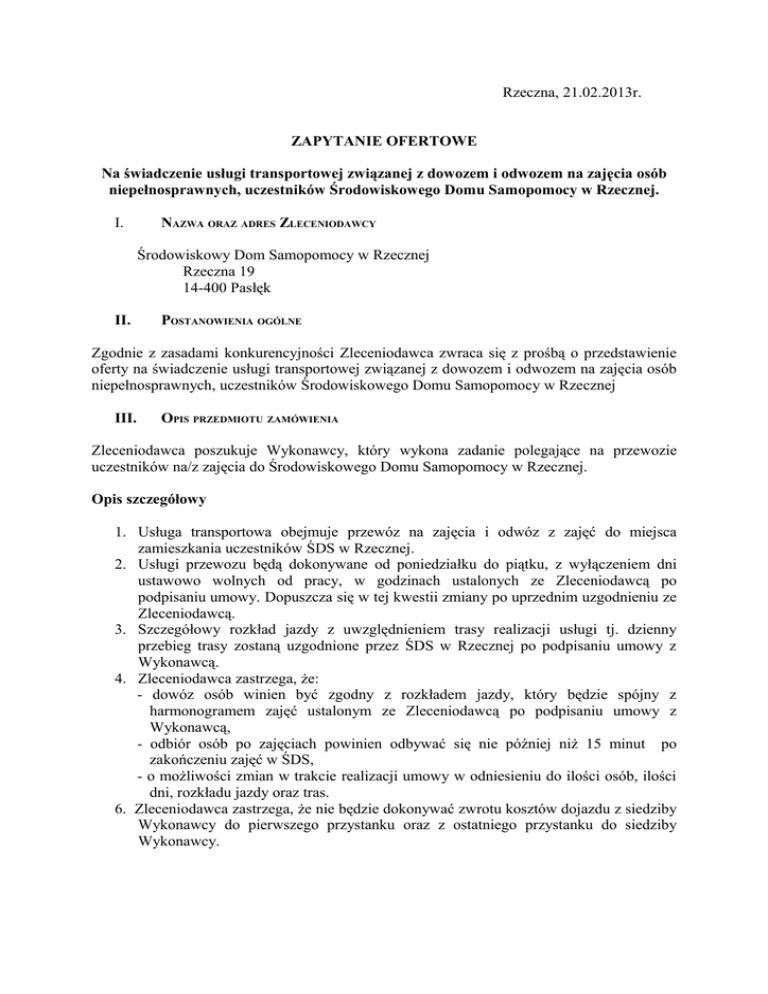 Rzeczna, 21.02.2013r. ZAPYTANIE OFERTOWE Na świadczenie usługi transportowej związanej z dowozem i odwozem na zajęcia osób niepełnosprawnych, uczestników Środowiskowego Domu Samopomocy w Rzecznej. I. NAZWA ORAZ ADRES ZLECENIODAWCY Środowiskowy Dom Samopomocy w Rzecznej Rzeczna 19 14-400 Pasłęk II. POSTANOWIENIA OGÓLNE Zgodnie z zasadami konkurencyjności Zleceniodawca zwraca się z prośbą o przedstawienie oferty na świadczenie usługi transportowej związanej z dowozem i odwozem na zajęcia osób niepełnosprawnych, uczestników Środowiskowego Domu Samopomocy w Rzecznej III. OPIS PRZEDMIOTU ZAMÓWIENIA Zleceniodawca poszukuje Wykonawcy, który wykona zadanie polegające na przewozie uczestników na/z zajęcia do Środowiskowego Domu Samopomocy w Rzecznej. Opis szczegółowy 1. Usługa transportowa obejmuje przewóz na zajęcia i odwóz z zajęć do miejsca zamieszkania uczestników ŚDS w Rzecznej. 2. Usługi przewozu będą dokonywane od poniedziałku do piątku, z wyłączeniem dni ustawowo wolnych od pracy, w godzinach ustalonych ze Zleceniodawcą po podpisaniu umowy. Dopuszcza się w tej kwestii zmiany po uprzednim uzgodnieniu ze Zleceniodawcą. 3. Szczegółowy rozkład jazdy z uwzględnieniem trasy realizacji usługi tj. dzienny przebieg trasy zostaną uzgodnione przez ŚDS w Rzecznej po podpisaniu umowy z Wykonawcą. 4. Zleceniodawca zastrzega, że: - dowóz osób winien być zgodny z rozkładem jazdy, który będzie spójny z harmonogramem zajęć ustalonym ze Zleceniodawcą po podpisaniu umowy z Wykonawcą, - odbiór osób po zajęciach powinien odbywać się nie później niż 15 minut po zakończeniu zajęć w ŚDS, - o możliwości zmian w trakcie realizacji umowy w odniesieniu do ilości osób, ilości dni, rozkładu jazdy oraz tras. 6. Zleceniodawca zastrzega, że nie będzie dokonywać zwrotu kosztów dojazdu z siedziby Wykonawcy do pierwszego przystanku oraz z ostatniego przystanku do siedziby Wykonawcy. IV. MIEJSCE REALIZACJI ZAJĘĆ: Środowiskowy Dom Samopomocy Rzeczna 19. V. TERMIN REALIZACJI ZAMÓWIENIA: Od III 2013 r. do wyczerpania środków finansowych określonych w pkt VII.4., z zastrzeżeniem, że ostateczne dzienne daty oraz trasa realizacji usługi zostaną ustalone indywidualnie z Wykonawcą po zawarciu umowy w sprawie zamówienia. VI. WYMAGANIA DOTYCZĄCE SPOSOBU REALIZACJI ZAMÓWIENIA. 1. Wykonawca winien posiadać licencję na przewóz drogowy osób. 2. Wykonawca zapewni pojazd – bus nie mniejszy niż do przewozu 12 osób, przeznaczony do przewozu osób niepełnosprawnych, który powinien być sprawny technicznie i dopuszczony do ruchu po drogach publicznych według obowiązujących przepisów w przewozach pasażerskich. 3. Wykonawca winien posiadać dodatkowo 1 pojazd rezerwowy, w razie awarii pojazdu realizującego usługę. 4. Wykonawca zapewni osobę prowadzącą pojazd posiadającą ważne uprawnienia. 5. Wykonawca zobowiązany jest do oferty przedłożyć kserokopię dokumentu potwierdzającego sprawność pojazdu tj. ważne badanie techniczne. VII. ZASADY WYNAGRODZENIA. 1. Wynagrodzenie będzie płatne w ratach miesięcznych po wykonaniu usługi w wysokości zależnej od ilości przejechanych kilometrów i dni w danym miesiącu. 2. Wykonawca będzie składał faktury VAT w siedzibie Zleceniodawcy w terminie do 10-tego dnia każdego miesiąca. W fakturze ma być wymieniona: ilość kilometrów, trasy, stawka podatku VAT oraz łączna cena z podatkiem VAT. 3. Wynagrodzenie będzie płatne w terminie 14 dni od daty przedłożenia w siedzibie Zleceniodawcy prawidłowo wystawionej faktury, przelewem na rachunek bankowy Wykonawcy podany na fakturze. 4. Zamawiający informuje, iż na realizację przedmiotu zamówienia dysponuje kwotą 30 000 zł brutto. VIII. KRYTERIUM WYBORU OFERTY NAJKORZYSTNIEJSZEJ Kryterium oceny stanowi najniższa cena. IX. MIEJSCE I SPOSÓB SKŁADANIA OFERT. 1. Oferty należ składać w Środowiskowym Domu Samopomocy w Rzecznej, Rzeczna 19 14-400 Pasłęk, w terminie do dnia 27.02.2013 r. do godziny 13.00 (data wpływu do placówki) 2. Oferty należy składać na drukach stanowiących załącznik nr 1. 3. Oferta winna obejmować cenę za 1 km brutto. 4. Do oferty należy dołączyć kserokopię dokumentu potwierdzającego sprawność pojazdu tj. ważne badanie techniczne. X. UDZIELENIE ZAMÓWIENIA 1. Zamówienie zostanie udzielone Wykonawcy, który przedstawi ofertę na usługę z najniższą ceną. 2. Podpisanie umowy na wykonanie zadania nastąpi w miejscu i terminie określonym przez Zleceniodawcę. 3. Zamawiający zastrzega, że płatności. Kierownik ŚDS w Rzecznej Alicja Karulewska Załącznik nr 1 ……………………………….. (Pieczęć Oferenta) ……………………….. (miejscowość, data) FORMULARZ OFERENTOWY WYKONOAWCY na usługę transportową związaną z dowozem i odwozem na zajęcia osób niepełnosprawnych, uczestników Środowiskowego Domu Samopomocy w Rzecznej 1. Zleceniodawca: Środowiskowy Dom Samopomocy w Rzecznej Rzeczna 19 14-400 Pasłęk REGON 281464026 NIP 578 311 14 96 2. Wykonawca: Nazwa ………………………………………………………………………….. Adres …………………………………………………………………………... REGON …………………………… NIP ………………………….. Numer telefonu……………………………… 3. W odpowiedzi na w/w zapytanie ofertowe z dnia ………………. oferujemy wykonanie przedmiotu zamówienia za cenę: CENA BRUTTO – za 1 km ……………………………..zł (słownie: ……………………………………………………………)