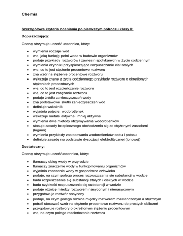 Chemia Szczegółowe kryteria oceniania po pierwszym półroczu klasy II: Dopuszczający: Ocenę otrzymuje uczeń/ uczennica, który: wymienia rodzaje wód wie, jaką funkcję pełni woda w budowie organizmów podaje przykłady roztworów i zawiesin spotykanych w życiu codziennym wymienia czynniki przyspieszające rozpuszczanie ciał stałych wie, co to jest stężenie procentowe roztworu zna wzór na stężenie procentowe roztworu wskazuje znane z życia codziennego przykłady roztworu o określonych stężeniach procentowych wie, co to jest rozcieńczanie roztworu wie, co to jest zatężanie roztworu podaje źródła zanieczyszczeń wody zna podstawowe skutki zanieczyszczeń wód definiuje wskaźnik wyjaśnia pojęcie: wodorotlenek wskazuje metale aktywne i mniej aktywne wymienia dwie metody otrzymywania wodorotlenków stosuje zasady bezpiecznego obchodzenia się ze stężonymi zasadami (ługami) wymienia przykłady zastosowania wodorotlenków sodu i potasu definiuje zasadę na podstawie dysocjacji elektrolitycznej (jonowej) Dostateczny: Ocenę otrzymuje uczeń/uczennica, który: tłumaczy obieg wody w przyrodzie tłumaczy znaczenie wody w funkcjonowaniu organizmów wyjaśnia znaczenie wody w gospodarce człowieka podaje, na czym polega proces rozpuszczania się substancji w wodzie bada rozpuszczanie się substancji stałych i ciekłych w wodzie bada szybkość rozpuszczania się substancji w wodzie podaje różnicę między roztworem nasyconym i nienasyconym przygotowuje roztwór nasycony podaje, na czym polega różnica między roztworem rozcieńczonym a stężonym potrafi stosować wzór na stężenie procentowe roztworu do prostych obliczeń przygotowuje roztwory o określonym stężeniu procentowym wie, na czym polega rozcieńczanie roztworu podaje sposoby zatężania roztworów tłumaczy, w jaki sposób można poznać, że woda jest zanieczyszczona wymienia rodzaje wskaźników podaje przykłady tlenków metali reagujących z wodą pisze ogólny wzór wodorotlenku oraz wzory wodorotlenków wybranych metali nazywa wodorotlenki na podstawie wzoru pisze równania reakcji tlenków metali z wodą pisze równania reakcji metali z wodą podaje zasady bezpiecznego obchodzenia się z aktywnymi metalami i zachowuje ostrożność w pracy z nimi opisuje właściwości wodorotlenków sodu, potasu, wapnia i magnezu tłumaczy dysocjację elektrolityczną (jonową) zasad tłumaczy, czym różni się wodorotlenek od zasady Dobry: Ocenę otrzymuje uczeń/uczennica, który: wyjaśnia, jakie znaczenie dla przyrody ma nietypowa gęstość wody wykrywa wodę w produktach pochodzenia roślinnego i w niektórych minerałach tłumaczy, jaki wpływ na rozpuszczanie substancji stałych ma polarna budowa wody wskazuje różnice we właściwościach roztworów i zawiesin wyjaśnia, na czym polega różnica między roztworem właściwym a roztworem koloidalnym tłumaczy, co to jest rozpuszczalność substancji odczytuje wartość rozpuszczalności substancji z wykresu rozpuszczalności oblicza stężenie procentowe roztworu, znając masę substancji rozpuszczonej i rozpuszczalnika (lub roztworu) oblicza masę substancji rozpuszczonej w określonej masie roztworu o znanym stężeniu procentowym oblicza masę rozpuszczalnika potrzebną do przygotowania roztworu o określonym stężeniu procentowym oblicza ile wody należy dodać do danego roztworu w celu rozcieńczenia go do wymaganego stężenia procentowego oblicza masę substancji, którą należy dodać do danego roztworu w celu zatężenia go do określonego stężenia procentowego oblicza, ile wody należy odparować z danego roztworu w celu zatężenia go do określonego stężenia procentowego omawia zagrożenia środowiska przyrodniczego spowodowane skażeniem wód omawia sposoby zapobiegania zanieczyszczeniom wód sprawdza doświadczalnie działanie wody na tlenki metali zna zabarwienie wskaźników w wodzie i w zasadach sprawdza doświadczalnie działanie wody na metale bada właściwości wybranych wodorotlenków interpretuje przewodzenie prądu elektrycznego przez zasady pisze równania dysocjacji elektrolitycznej (jonowej) przykładowych zasad pisze ogólne równanie dysocjacji elektrolitycznej (jonowej) zasad Bardzo dobry: Ocenę otrzymuje uczeń/uczennica, który: uzasadnia potrzebę oszczędnego gospodarowania wodą i proponuje sposoby oszczędzania oblicza procentową zawartość wody w produktach spożywczych na podstawie przeprowadzonych samodzielnie badań wyjaśnia, co to jest emulsja otrzymuje emulsję i podaje przykłady emulsji spotykanych w życiu codziennym wyjaśnia, co to jest koloid podaje przykłady roztworów koloidalnych spotykanych w życiu codziennym korzystając z wykresu rozpuszczalności, oblicza rozpuszczalność substancji w określonej masie wody wyjaśnia, od czego zależy rozpuszczalność gazów w wodzie omawia znaczenie rozpuszczania się gazów w wodzie dla organizmów oblicza stężenie procentowe roztworu, znając masę lub objętość i gęstość substancji rozpuszczonej i masę rozpuszczalnika (lub roztworu) oblicza masę lub objętość substancji rozpuszczonej w określonej masie lub objętości roztworu o znanym stężeniu procentowym oblicza gęstość rozpuszczalnika(o znanej gęstości) potrzebną do przygotowania roztworu o określonym stężeniu procentowym przygotowuje roztwór o określonym stężeniu procentowym przez zmieszanie dwóch roztworów o danych stężeniach oblicza masy lub objętości roztworów o znanych stężeniach procentowych potrzebne do przygotowania określonej masy roztworu o wymaganym stężeniu wyjaśnia, jak działa oczyszczalnia ścieków tłumaczy, w jaki sposób uzdatnia się wodę przedstawia za pomocą modeli przebieg reakcji tlenków metali z wodą potrafi zidentyfikować produkty reakcji aktywnych metali z wodą tłumaczy, w jakich postaciach można spotkać wodorotlenek wapnia i jakie on ma zastosowanie przedstawia za pomocą modeli przebieg dysocjacji elektrolityczne