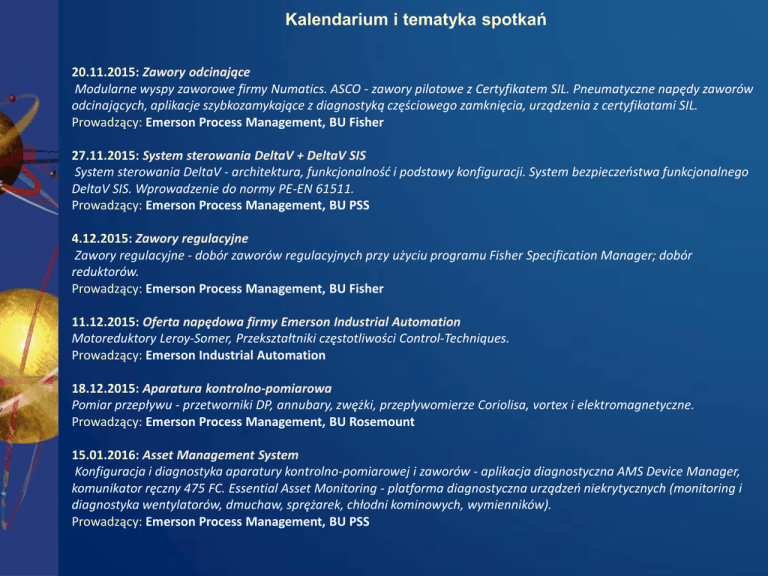 Kalendarium i tematyka spotkań 20.11.2015: Zawory odcinające Modularne wyspy zaworowe firmy Numatics. ASCO - zawory pilotowe z Certyfikatem SIL. Pneumatyczne napędy zaworów odcinających, aplikacje szybkozamykające z diagnostyką częściowego zamknięcia, urządzenia z certyfikatami SIL. Prowadzący: Emerson Process Management, BU Fisher 27.11.2015: System sterowania DeltaV + DeltaV SIS System sterowania DeltaV - architektura, funkcjonalność i podstawy konfiguracji. System bezpieczeństwa funkcjonalnego DeltaV SIS. Wprowadzenie do normy PE-EN 61511. Prowadzący: Emerson Process Management, BU PSS 4.12.2015: Zawory regulacyjne Zawory regulacyjne - dobór zaworów regulacyjnych przy użyciu programu Fisher Specification Manager; dobór reduktorów. Prowadzący: Emerson Process Management, BU Fisher 11.12.2015: Oferta napędowa firmy Emerson Industrial Automation Motoreduktory Leroy-Somer, Przekształtniki częstotliwości Control-Techniques. Prowadzący: Emerson Industrial Automation 18.12.2015: Aparatura kontrolno-pomiarowa Pomiar przepływu - przetworniki DP, annubary, zwężki, przepływomierze Coriolisa, vortex i elektromagnetyczne. Prowadzący: Emerson Process Management, BU Rosemount 15.01.2016: Asset Management System Konfiguracja i diagnostyka aparatury kontrolno-pomiarowej i zaworów - aplikacja diagnostyczna AMS Device Manager, komunikator ręczny 475 FC. Essential Asset Monitoring - platforma diagnostyczna urządzeń niekrytycznych (monitoring i diagnostyka wentylatorów, dmuchaw, sprężarek, chłodni kominowych, wymienników). Prowadzący: Emerson Process Management, BU PSS 22.01.2016: Analityka wodna, gazowa, pomiary fizyko- chemiczne Analityka w energetyce zawodowej. Prowadzący: Emerson Process Management, BU Rosemount Analytics 29.01.2016: Asset Management System AMS MHM - platforma dla oceny stanu technicznego maszyn mechanicznych. Diagnostyka maszyn wirujących - systemy ciągłe oraz system przenośny. Analizator przenośny CSI 2140 - warsztaty. Prowadzący: Emerson Process Management, BU PSS / Reliability 5.02.2016: Aparatura kontrolno-pomiarowa Bezprzewodowa aparatura kontrolno-pomiarowa w przemyśle - topologia sieci, konfiguracja, aplikacje. Prowadzący: Emerson Process Management, BU Rosemount 4.03.2016: Przygotowanie sprężonego powietrza / Zawory odcinające Blok 1: Modułowe systemy przygotowania sprężonego powietrza – seria 652 i 342. Blok 2: Elektryczne oraz elektrohydrauliczne napędy zaworów odcinających oraz regulacyjnych. Prowadzący: Emerson Process Management, BU Fisher / ASCO Numatics 11.03.2016: System sterowania DeltaV + DeltaV SIS System sterowania DeltaV - architektura, funkcjonalność i podstawy konfiguracji. System bezpieczeństwa funkcjonalnego DeltaV SIS. Wprowadzenie do normy PE-EN 61511. Prowadzący: Emerson Process Management, BU PSS 18.03.2016: Zawory regulacyjne Zawory regulacyjne - warszataty z kalibracja i diagnostyki uszkodzeń zaworów przy użyciu oprogramowania Valvelink. Prowadzący: Emerson Process Management, BU Fisher 1.04.2016: Oferta napędowa firmy Emerson Industrial Automation Motoreduktory Leroy-Somer, Przekształtniki częstotliwości Control-Techniques. Prowadzący: Emerson Industrial Automation 8.04.2016: Aparatura kontrolno-pomiarowa Pomiary poziomu – przegląd metod pomiarowych, aplikacje. Prowadzący: Emerson Process Management, BU Rosemount 15.04.2016: Analityka wodna, gazowa, pomiary fizyko- chemiczne Analityka procesowa w przemyśle. Prowadzący: Emerson Process Management, BU Rosemount Analytics 22.04.2016: Wyspy zaworowe / Reduktory Fisher Blok 1: Modułowe wyspy zaworowe – G3 + 501, 2005, 503. Blok 2: Reduktory Fisher, tank blanketing. Prowadzący: Emerson Process Management, BU Fisher / ASCO Numatics 13.05.2016: System sterowania DeltaV + DeltaV SIS Warsztaty - projektowanie/programowanie systemu sterowania DeltaV oraz DeltaV SIS. Diagnostyka systemu z wykorzystaniem narzędzi systemowych. Systemowe narzędzia dla optymalizacji procesu. Symulatory. System szkolenia operatorów OTS. Dystrybucja informacji do systemów zewnętrznych. Prowadzący: Emerson Process Management, BU PSS 20.05.2016: Zawory regulacyjne Zawory regulacyjne - trudne aplikacje: kawitacja, flashing, hałas, schładzacze pary. Prowadzący: Emerson Process Management, BU Fisher 03.06.2016: Asset Management System AMS MHM - platforma dla oceny stanu technicznego maszyn mechanicznych. Diagnostyka maszyn wirujących - systemy ciągłe oraz system przenośny. Analizator przenośny CSI 2140 - warsztaty. Prowadzący: Emerson Process Management, BU PSS / Reliability 10.06.2016: Aparatura kontrolno-pomiarowa Pomiary ciśnienia i temperatury. Prowadzący: Emerson Process Management, BU Rosemount