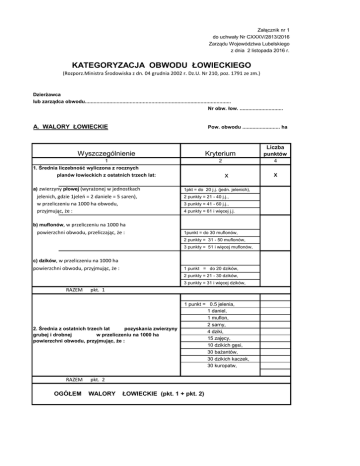 Załącznik nr 1 do uchwały Nr CXXXV/2813/2016 Zarządu Województwa Lubelskiego z dnia 2 listopada 2016 r. KATEGORYZACJA OBWODU ŁOWIECKIEGO (Rozporz.Ministra Środowiska z dn. 04 grudnia 2002 r. Dz.U. Nr 210, poz. 1791 ze zm.) Dzierżawca lub zarządca obwodu..................................................................................................... Nr obw. łow. .............................. A. WALORY ŁOWIECKIE Pow. obwodu .......................... ha Wyszczególnienie Kryterium Liczba punktów 1 2 4 1. Średnia liczebność wyliczona z rocznych planów łowieckich z ostatnich trzech lat: a) zwierzyny płowej (wyrażonej w jednostkach jelenich, gdzie 1jeleń = 2 daniele = 5 saren), w przeliczeniu na 1000 ha obwodu, przyjmując, że : x 1pkt = do 20 j.j. (jedn. jelenich), 2 punkty = 21 - 40 j.j., 3 punkty = 41 - 60 j.j., 4 punkty = 61 i więcej j.j. b) muflonów, w przeliczeniu na 1000 ha powierzchni obwodu, przeliczając, że : 1punkt = do 30 muflonów, 2 punkty = 31 - 50 muflonów, 3 punkty = 51 i więcej muflonów, c) dzików, w przeliczeniu na 1000 ha powierzchni obwodu, przyjmując, że : 1 punkt = do 20 dzików, 2 punkty = 21 - 30 dzików, 3 punkty = 31 i więcej dzików, RAZEM pkt. 1 2. Średnia z ostatnich trzech lat pozyskania zwierzyny grubej i drobnej w przeliczeniu na 1000 ha powierzchni obwodu, przyjmując, że : RAZEM OGÓŁEM 1 punkt = 0.5 jelenia, 1 daniel, 1 muflon, 2 sarny, 4 dziki, 15 zajęcy, 10 dzikich gęsi, 30 bażantów, 30 dzikich kaczek, 30 kuropatw, pkt. 2 WALORY ŁOWIECKIE (pkt. 1 + pkt. 2) X B. Lp. 1 Czynniki dodatnio wpływające na środowisko bytowania zwierzyny i walory łowieckie obwodu. Wyszczególnienie Liczba Przyznano punktów punktów 1 2 3 Kryterium Powierzchnia obwodu 3000 - 4000 ha 4001 - 5000 ha powyżej 5001 ha 2 Lesistość obwodu powyżej 60% jeden kompleks leśny w zależności od wielkości : 2 3 4 5 do 500 ha 501 - 1000 ha 1001 - 2000 ha powyżej 2000 ha dwa kompleksy i więcej, przy czym: 4 3 2 1 1-4 1-3 0-1 2 3 2 3 4 2-3 0-1 0-3 0-2 0-2 dwa kompleksy trzy kompleksy cztery kompleksy powyżej czterech kompleksów Lesistość obwodu 40 - 60 % jeden kompleks leśny dwa kompleksy i więcej Lesistość obwodu poniżej 40 % do 20 % 21 - 30 % 31 - 40 % 3 Udział siedlisk boru świeżego, 10 - 20 % boru mieszanego świeżego, 21 - 30 % 31 % i powyżej boru mieszanego, 4 Łąki śródleśne i przyleśne 5 Obecność naturalnych wodopojów obwody leśne i terenów bagiennych obwody polne dobrze zagospodarowane słabo zagospodarowane 6 Obecność ostoi zwierząt obwody polne i leśne RAZEM PRZYZNANO PUNKTÓW C. Lp. 1 Czynniki ujemnie wpływające na środowisko bytowania zwierzyny i walorów łowieckich obwodu. Wyszczególnienie Kryterium obwód leśny obwód polny Brak ciągłości obwodu spowodowany przez ogrodzenia (w polu i lesie), Liczba Przyznano punktów punktów 1-4 1-5 lokalizację osiedli, wsi i miast 2 Wielkość sieci dróg publicznych o intensywnym ruchu samochodowym 3 Penetracja obwodu przez ludzi niezwiązanych z prowadzeniem obwód leśny obwód polny obwód leśny obwód polny 1-3 0-3 1-4 1-2 obwód polny 0-3 gospodarki leśnej i rolnej 4 Powierzchnia pól uprawnych zagrożona szkodami łowieckimi, przyległa do lasu RAZEM PRZYZNANO PUNKTÓW SUMARYCZNA PUNKTACJA OBWODU ( A + B - C ) = USTALONA KATEGORIA OBWODU : Data sporządzenia : ................................................................................ Podpisy Zespołu: 1. Przedstawiciel Zarządu Województwa 2. Przedstawiciel Dyrektora RDLP 3. Przedstawiciel PZŁ 3. Przedstawiciel Dzierżawcy/Zarządcy obwodu ................................................. ................................................. ................................................. ................................................. Strona 2 z 2