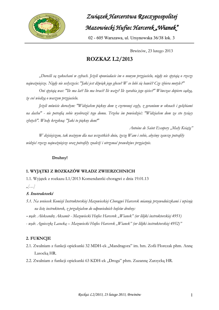 Związek Harcerstwa Rzeczypospolitej Mazowiecki Hufiec Harcerek „Wianek” 02 - 605 Warszawa, ul. Ursynowska 36/38 lok. 3 Brwinów, 23 lutego 2013 ROZKAZ L2/2013 „Dorośli są zakochani w cyfrach. Jeżeli opowiadacie im o nowym przyjacielu, nigdy nie spytają o rzeczy najważniejsze. Nigdy nie usłyszycie: "Jaki jest dźwięk jego głosu? W co lubi się bawić? Czy zbiera motyle?" Oni spytają was: "Ile ma lat? Ilu ma braci? Ile waży? Ile zarabia jego ojciec?" Wówczas dopiero sądzą, że coś wiedzą o waszym przyjacielu. Jeżeli mówicie dorosłym: "Widziałem piękny dom z czerwonej cegły, z geranium w oknach i gołębiami na dachu" - nie potrafią sobie wyobrazić tego domu. Trzeba im powiedzieć: "Widziałem dom za sto tysięcy złotych". Wtedy krzykną: "Jaki to piękny dom!" Antoine de Saint Exupery „Mały Książę” W dzisiejszym, tak ważnym dla nas wszystkich dniu, życzę Wam i sobie, abyśmy zawsze potrafiły widzieć rzeczy najważniejsze oraz potrafiły znaleźć i utrzymać prawdziwe przyjaźnie. Druhny! 1. WYJĄTKI Z ROZKAZÓW WŁADZ ZWIERZCHNICH 1.1. Wyjątek z rozkazu L1/2013 Komendantki chorągwi z dnia 19.01.13 „[…] 5. Instruktorki 5.1. Na wniosek Komisji Instruktorskiej Mazowieckiej Chorągwi Harcerek mianuję przewodniczkami i wpisuję na listę instruktorek, z przydziałem do odpowiednich hufców druhny: - wędr. Aleksandrę Aksamit - Mazowiecki Hufiec Harcerek „Wianek” (nr lilijki instruktorskiej 4951) - wędr. Agnieszkę Lasocką – Mazowiecki Hufiec Harcerek „Wianek” (nr lilijki instruktorskiej 4952)” 2. FUKNCJE 2.1. Zwalniam z funkcji opiekunki 32 MDH-ek „Mandragora” im. hm. Zofii Florczak phm. Annę Lasocką HR. 2.2. Zwalniam z funkcji opiekunki 63 KDH-ek „Droga” phm. Zuzannę Zarzycką HR. Rozkaz L2/2013, 23 lutego 2013, Brwinów 1 Związek Harcerstwa Rzeczypospolitej Mazowiecki Hufiec Harcerek „Wianek” 02 - 605 Warszawa, ul. Ursynowska 36/38 lok. 3 3. STOPNIE 3.1. Na wniosek kapituły wędrowniczki „Dziewięćsił” otwieram próbę na stopień wędrowniczki druhnom: sam. Weronice Plonie i sam. Katarzynie Piendras. 3.2 Na wniosek kapituły wędrowniczki „Dziewięćsił” zamykam próbę i przyznaję stopnień samarytanki trop. Annie Różyckiej. 4. SPRAWNOŚCI 4.1. Otwieram próby na sprawności Gaździna, Ciastkarka doskonała, Bibliofilka trop. Indze Więch. 4.2. Zamykam próby i przyznaję sprawności Znawczyni Biblii i Alpinistka sam. Paulinie Wiszniewskiej. 4.3. Zamykam próby i przyznaję sprawności Ogrodniczka, Czterolistna Koniczyna i Jan Paweł sam. Agnieszce Stachlewskiej. 5. PLANY PRACY 5.1. Zatwierdzam do realizacji plan pracy na rok harcerki 2012/2013 32 MDH-ek „Korona” im. św. Jadwigi Królowej Polski. 6. WYNIKI GRY 6.1. Podaję wyniki dzisiejszej gry patroli: III miejsce – „Mój brat niedźwiedź” 32 p. II miejsce – „Alicja w Krainie Czarów” 34 p. I miejsce – „Zakochany Kundel” – 37,5 p. CZUWAJ! hufcowa MHH-ek „Wianek” phm. Małgorzata Czubaszek HR 2 Rozkaz L2/2013, 23 lutego 2013, Brwinów