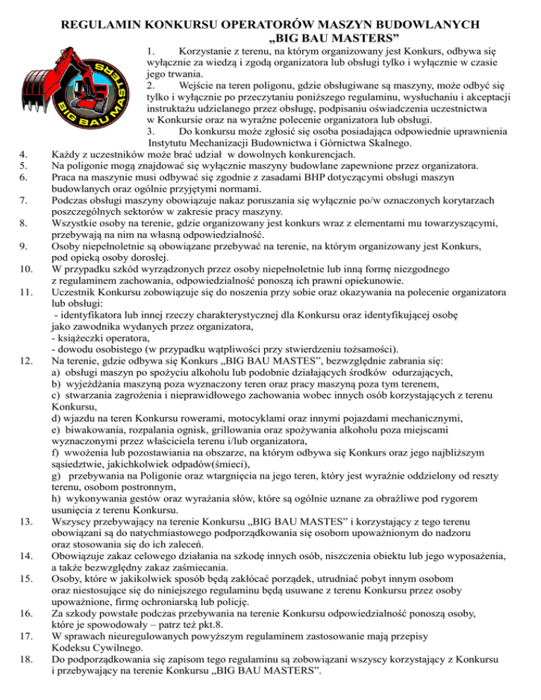 REGULAMIN KONKURSU OPERATORÓW MASZYN BUDOWLANYCH „BIG BAU MASTERS” 4. 5. 6. 7. 8. 9. 10. 11. 12. 13. 14. 15. 16. 17. 18. 1. Korzystanie z terenu, na którym organizowany jest Konkurs, odbywa się wyłącznie za wiedzą i zgodą organizatora lub obsługi tylko i wyłącznie w czasie jego trwania. 2. Wejście na teren poligonu, gdzie obsługiwane są maszyny, może odbyć się tylko i wyłącznie po przeczytaniu poniższego regulaminu, wysłuchaniu i akceptacji instruktażu udzielanego przez obsługę, podpisaniu oświadczenia uczestnictwa w Konkursie oraz na wyraźne polecenie organizatora lub obsługi. 3. Do konkursu może zgłosić się osoba posiadająca odpowiednie uprawnienia Instytutu Mechanizacji Budownictwa i Górnictwa Skalnego. Każdy z uczestników może brać udział w dowolnych konkurencjach. Na poligonie mogą znajdować się wyłącznie maszyny budowlane zapewnione przez organizatora. Praca na maszynie musi odbywać się zgodnie z zasadami BHP dotyczącymi obsługi maszyn budowlanych oraz ogólnie przyjętymi normami. Podczas obsługi maszyny obowiązuje nakaz poruszania się wyłącznie po/w oznaczonych korytarzach poszczególnych sektorów w zakresie pracy maszyny. Wszystkie osoby na terenie, gdzie organizowany jest konkurs wraz z elementami mu towarzyszącymi, przebywają na nim na własną odpowiedzialność. Osoby niepełnoletnie są obowiązane przebywać na terenie, na którym organizowany jest Konkurs, pod opieką osoby dorosłej. W przypadku szkód wyrządzonych przez osoby niepełnoletnie lub inną formę niezgodnego z regulaminem zachowania, odpowiedzialność ponoszą ich prawni opiekunowie. Uczestnik Konkursu zobowiązuje się do noszenia przy sobie oraz okazywania na polecenie organizatora lub obsługi: - identyfikatora lub innej rzeczy charakterystycznej dla Konkursu oraz identyfikującej osobę jako zawodnika wydanych przez organizatora, - książeczki operatora, - dowodu osobistego (w przypadku wątpliwości przy stwierdzeniu tożsamości). Na terenie, gdzie odbywa się Konkurs „BIG BAU MASTES”, bezwzględnie zabrania się: a) obsługi maszyn po spożyciu alkoholu lub podobnie działających środków odurzających, b) wyjeżdżania maszyną poza wyznaczony teren oraz pracy maszyną poza tym terenem, c) stwarzania zagrożenia i nieprawidłowego zachowania wobec innych osób korzystających z terenu Konkursu, d) wjazdu na teren Konkursu rowerami, motocyklami oraz innymi pojazdami mechanicznymi, e) biwakowania, rozpalania ognisk, grillowania oraz spożywania alkoholu poza miejscami wyznaczonymi przez właściciela terenu i/lub organizatora, f) wwożenia lub pozostawiania na obszarze, na którym odbywa się Konkurs oraz jego najbliższym sąsiedztwie, jakichkolwiek odpadów(śmieci), g) przebywania na Poligonie oraz wtargnięcia na jego teren, który jest wyraźnie oddzielony od reszty terenu, osobom postronnym, h) wykonywania gestów oraz wyrażania słów, które są ogólnie uznane za obraźliwe pod rygorem usunięcia z terenu Konkursu. Wszyscy przebywający na terenie Konkursu „BIG BAU MASTES” i korzystający z tego terenu obowiązani są do natychmiastowego podporządkowania się osobom upoważnionym do nadzoru oraz stosowania się do ich zaleceń. Obowiązuje zakaz celowego działania na szkodę innych osób, niszczenia obiektu lub jego wyposażenia, a także bezwzględny zakaz zaśmiecania. Osoby, które w jakikolwiek sposób będą zakłócać porządek, utrudniać pobyt innym osobom oraz niestosujące się do niniejszego regulaminu będą usuwane z terenu Konkursu przez osoby upoważnione, firmę ochroniarską lub policję. Za szkody powstałe podczas przebywania na terenie Konkursu odpowiedzialność ponoszą osoby, które je spowodowały – patrz też pkt.8. W sprawach nieuregulowanych powyższym regulaminem zastosowanie mają przepisy Kodeksu Cywilnego. Do podporządkowania się zapisom tego regulaminu są zobowiązani wszyscy korzystający z Konkursu i przebywający na terenie Konkursu „BIG BAU MASTERS”.