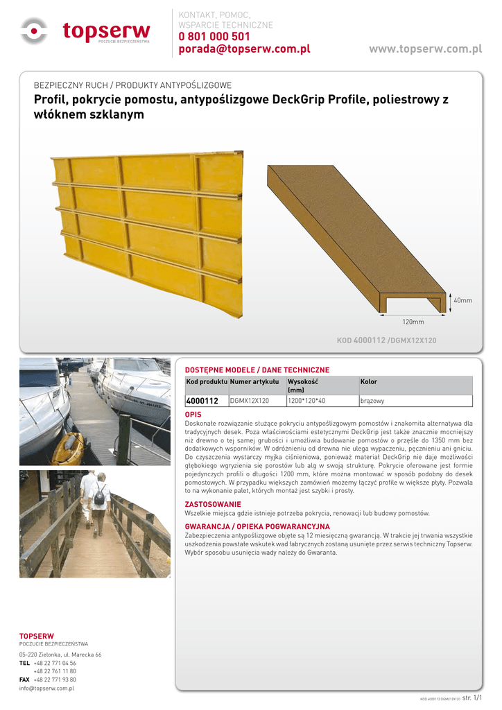 KONTAKT, POMOC, WSPARCIE TECHNICZNE 0 801 000 501 [email protected] www.topserw.com.pl BEZPIECZNY RUCH / PRODUKTY ANTYPOŚLIZGOWE Profil, pokrycie pomostu, antypoślizgowe DeckGrip Profile, poliestrowy z włóknem szklanym 40mm 120mm KOD 4000112 /DGMX12X120 DOSTĘPNE MODELE / DANE TECHNICZNE Kod produktu Numer artykułu Wysokość (mm) Kolor 4000112 1200*120*40 brązowy DGMX12X120 OPIS Doskonałe rozwiązanie służące pokryciu antypoślizgowym pomostów i znakomita alternatywa dla tradycyjnych desek. Poza właściwościami estetycznymi DeckGrip jest także znacznie mocniejszy niż drewno o tej samej grubości i umożliwia budowanie pomostów o przęśle do 1350 mm bez dodatkowych wsporników. W odróżnieniu od drewna nie ulega wypaczeniu, pęcznieniu ani gniciu. Do czyszczenia wystarczy myjka ciśnieniowa, ponieważ materiał DeckGrip nie daje możliwości głębokiego wgryzienia się porostów lub alg w swoją strukturę. Pokrycie oferowane jest formie pojedynczych profili o długości 1200 mm, które można montować w sposób podobny do desek pomostowych. W przypadku większych zamówień możemy łączyć profile w większe płyty. Pozwala to na wykonanie palet, których montaż jest szybki i prosty. ZASTOSOWANIE Wszelkie miejsca gdzie istnieje potrzeba pokrycia, renowacji lub budowy pomostów. GWARANCJA / OPIEKA POGWARANCYJNA Zabezpieczenia antypoślizgowe objęte są 12 miesięczną gwarancją. W trakcie jej trwania wszystkie uszkodzenia powstałe wskutek wad fabrycznych zostaną usunięte przez serwis techniczny Topserw. Wybór sposobu usunięcia wady należy do Gwaranta. TOPSERW POCZUCIE BEZPIECZEŃSTWA 05-220 Zielonka, ul. Marecka 66 TEL +48 22 771 04 56 +48 22 761 11 80 FAX +48 22 771 93 80 [email protected] KOD 4000112 DGMX12X120 str. 1/1