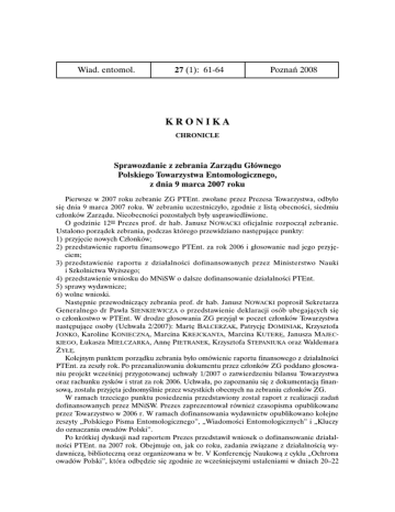Wiad. entomol. 27 (1): 61-64 Poznań 2008 KRONIKA CHRONICLE Sprawozdanie z zebrania Zarządu Głównego Polskiego Towarzystwa Entomologicznego, z dnia 9 marca 2007 roku Pierwsze w 2007 roku zebranie ZG PTEnt. zwołane przez Prezesa Towarzystwa, odbyło się dnia 9 marca 2007 roku. W zebraniu uczestniczyło, zgodnie z listą obecności, siedmiu członków Zarządu. Nieobecności pozostałych były usprawiedliwione. O godzinie 1200 Prezes prof. dr hab. Janusz NOWACKI oficjalnie rozpoczął zebranie. Ustalono porządek zebrania, podczas którego przewidziano następujące punkty: 1) przyjęcie nowych Członków; 2) przedstawienie raportu finansowego PTEnt. za rok 2006 i głosowanie nad jego przyjęciem; 3) przedstawienie raportu z działalności dofinansowanych przez Ministerstwo Nauki i Szkolnictwa Wyższego; 4) przedstawienie wniosku do MNiSW o dalsze dofinansowanie działalności PTEnt. 5) sprawy wydawnicze; 6) wolne wnioski. Następnie przewodniczący zebrania prof. dr hab. Janusz NOWACKI poprosił Sekretarza Generalnego dr Pawła S IENKIEWICZA o przedstawienie deklaracji osób ubegających się o członkostwo w PTEnt. W drodze głosowania ZG przyjął w poczet członków Towarzystwa następujące osoby (Uchwała 2/2007): Martę BALCERZAK, Patrycję DOMINIAK, Krzysztofa JONKO, Karoline KONIECZNĄ, Marcina KREJCKANTA, Marcina KUTERĘ, Janusza MAJECKIEGO, Łukasza MIELCZARKA, Annę PIETRANEK, Krzysztofa STEPANIUKA oraz Waldemara ŻYŁĘ. Kolejnym punktem porządku zebrania było omówienie raportu finansowego z działalności PTEnt. za zeszły rok. Po przeanalizowaniu dokumentu przez członków ZG poddano głosowaniu projekt wcześniej przygotowanej uchwały 1/2007 o zatwierdzeniu bilansu Towarzystwa oraz rachunku zysków i strat za rok 2006. Uchwała, po zapoznaniu się z dokumentacją finansową, została przyjęta jednomyślnie przez wszystkich obecnych na zebraniu członków ZG. W ramach trzeciego punktu posiedzenia przedstawiony został raport z realizacji zadań dofinansowanych przez MNiSW. Prezes zaprezentował również czasopisma opublikowane przez Towarzystwo w 2006 r. W ramach dofinansowania wydawnictw opublikowano kolejne zeszyty „Polskiego Pisma Entomologicznego”, „Wiadomości Entomologicznych” i „Kluczy do oznaczania owadów Polski”. Po krótkiej dyskusji nad raportem Prezes przedstawił wniosek o dofinansowanie działalności PTEnt. na 2007 rok. Obejmuje on, jak co roku, zadania związane z działalnością wydawniczą, biblioteczną oraz organizowana w br. V Konferencję Naukową z cyklu „Ochrona owadów Polski”, która odbędzie się zgodnie ze wcześniejszymi ustaleniami w dniach 20–22 62 KRONIKA września, w Poznaniu. W ramach działalności bibliotecznej planuje się również rozpoczęcie skanowania niedostępnych już w sprzedaży zeszytów „Kluczy do oznaczania owadów Polski” w celu umieszczenia ich na stronach internetowych PTEnt. Omawiając sprawy wydawnicze poruszono kwestię związane z nową kategoryzacją czasopism naukowych. Prezes poinformował zebranych o sporządzonych i wysłanych do Ministerstwa Nauki i Szkolnictwa Wyższego ankietach zgłoszeniowych „Polskiego Pisma Entomologicznego” i „Wiadomości Entomologicznych”. Wg informacji z Ministerstwa lista czasopism z przydzielonymi punkami powinna zostać upubliczniona około 30 czerwca 2007r. W odniesieniu do „Polskiego Pisma Entomologicznego” Prezes prof. dr hab. Janusz NOWACKI zaproponował aby główny tytuł czasopisma był w wersji anglojęzycznej natomiast podtytuł w języku polskim. Podobnie nazwa wydawcy powinna być zmieniona na wersję anglojęzyczną. Miało by to duże znaczenie dla postrzegania naszego czasopisma w świecie jako w pełni anglojęzycznego. Usunięta by została również pewna niekonsekwencja w tytule sugerująca obcokrajowcom, że jest to czasopismo wydawane w języku tzw. „niekongresowym”. Po krótkiej dyskusji nad zasadnością tej zmiany zarządzono głosowanie nad jej przyjęciem. W wyniku jednomyślnego głosowania przyjęto Uchwałę 3/2007 wprowadzającą proponowane zmiany. W czasie dyskusji nad czasopismami PTEnt. wyniknął jeszcze jeden problem, polegający na określeniu jasnych zasad dofinansowania przez autorów druku prac na łamach „Polskiego Pisma Entomologicznego”. Wobec trudnej sytuacji związanej z finansowaniem druku w/w czasopisma, zaproponowano wprowadzenie odpłatności jaką ponosili by Autorzy w wysokości 50% kosztów druku nie wliczając w to kosztów druku kolorowego, który byłby rozliczany osobno wg dotychczasowych zasad. Po głosowaniu, jednomyślnie ( siedem głosów za przy siedmiu głosujących) przyjęto proponowane zmiany (Uchwała 4/2007). Kolejny punkt zebrania ZG PTEnt. dotyczył wolnych wniosków. Podjęto dyskusję nad uporządkowaniem spraw związanych z funkcjonowaniem oddziałów. Zadecydowano, że w ramach kolejnej próby uaktywnienia oddziałów zostanie rozesłane pismo zobowiązujące w/w jednostki do przeprowadzenia zebrania sprawozdawczo-wyborczego i przesłania protokołu z tego zebrania do ZG PTEnt. Na tej podstawie ZG podejmie decyzję o formalnym rozwiązaniu oddziałów nieaktywnych. Dr Wojciech KUBASIK poruszył kwestię uzupełnienia deklaracji dla kandydatów na członków PTEnt. o punkt, w którym deklarowało by się przynależność do oddziału. Propozycja ta została zaakceptowana. Prof. dr hab. Tadeusz BARCZAK zwrócił też uwagę na potrzebę ograniczenia możliwości wydruku z plików PDF zamieszczanych na stronach internetowych Towarzystwa, a zawierających treści aktualnych wydawnictw. Taka dostępność tych materiałów nie sprzyja interesom Towarzystwa. Uczestnicy zebrania zgodzili się z tym głosem i zmiana taka zostanie wprowadzona. Prof. dr hab. Janusz NOWACKI, Prezes PTEnt. zaproponował aby członkowie ZG zastanowili się do następnego zebrania nad osobami, które należało by przy okazji XLVI Zjazdu Towarzystwa utytułować honorowym członkostwem. W 