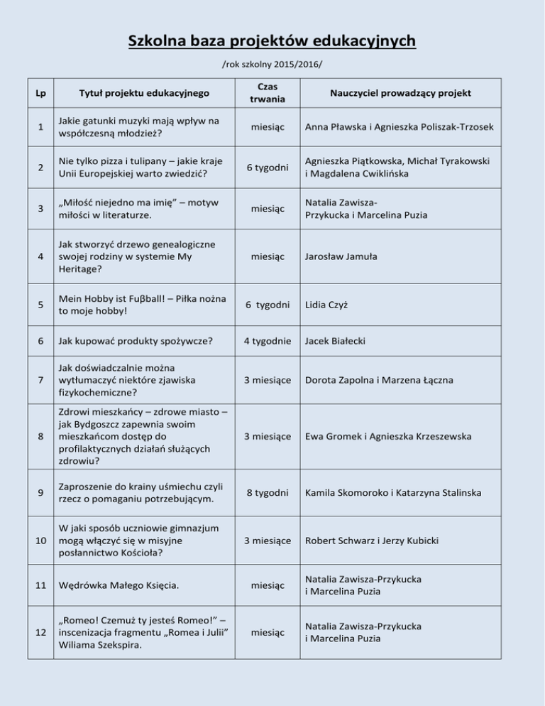 Szkolna baza projektów edukacyjnych /rok szkolny 2015/2016/ Lp Tytuł projektu edukacyjnego Czas trwania Nauczyciel prowadzący projekt 1 Jakie gatunki muzyki mają wpływ na współczesną młodzież? miesiąc Anna Pławska i Agnieszka Poliszak-Trzosek 2 Nie tylko pizza i tulipany – jakie kraje Unii Europejskiej warto zwiedzid? 6 tygodni Agnieszka Piątkowska, Michał Tyrakowski i Magdalena Cwiklioska 3 „Miłośd niejedno ma imię” – motyw miłości w literaturze. miesiąc Natalia ZawiszaPrzykucka i Marcelina Puzia 4 Jak stworzyd drzewo genealogiczne swojej rodziny w systemie My Heritage? miesiąc Jarosław Jamuła 5 Mein Hobby ist Fuβball! – Piłka nożna to moje hobby! 6 tygodni Lidia Czyż 6 Jak kupowad produkty spożywcze? 4 tygodnie Jacek Białecki 7 Jak doświadczalnie można wytłumaczyd niektóre zjawiska fizykochemiczne? 3 miesiące Dorota Zapolna i Marzena Łączna 8 Zdrowi mieszkaocy – zdrowe miasto – jak Bydgoszcz zapewnia swoim mieszkaocom dostęp do profilaktycznych działao służących zdrowiu? 3 miesiące Ewa Gromek i Agnieszka Krzeszewska 9 Zaproszenie do krainy uśmiechu czyli rzecz o pomaganiu potrzebującym. 8 tygodni Kamila Skomoroko i Katarzyna Stalinska 10 W jaki sposób uczniowie gimnazjum mogą włączyd się w misyjne posłannictwo Kościoła? 3 miesiące Robert Schwarz i Jerzy Kubicki 11 Wędrówka Małego Księcia. miesiąc Natalia Zawisza-Przykucka i Marcelina Puzia 12 „Romeo! Czemuż ty jesteś Romeo!” – inscenizacja fragmentu „Romea i Julii” Wiliama Szekspira. miesiąc Natalia Zawisza-Przykucka i Marcelina Puzia