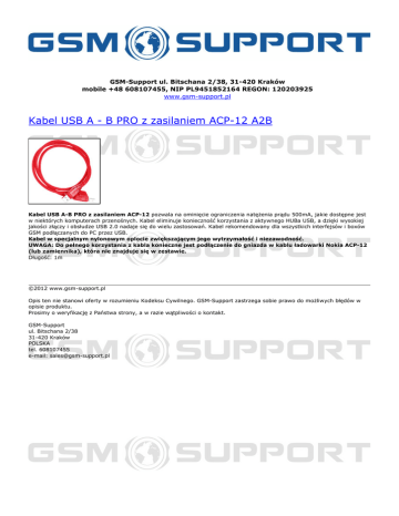 GSM-Support ul. Bitschana 2/38, 31-420 Kraków mobile +48 608107455, NIP PL9451852164 REGON: 120203925 www.gsm-support.pl Kabel USB A - B PRO z zasilaniem ACP-12 A2B Kabel USB A-B PRO z zasilaniem ACP-12 pozwala na ominięcie ograniczenia natężenia prądu 500mA, jakie dostępne jest w niektórych komputerach przenośnych. Kabel eliminuje konieczność korzystania z aktywnego HUBa USB, a dzięki wysokiej jakości złączy i obsłudze USB 2.0 nadaje się do wielu zastosowań. Kabel rekomendowany dla wszystkich interfejsów i boxów GSM podłączanych do PC przez USB. Kabel w specjalnym nylonowym oplocie zwiększającym jego wytrzymałość i niezawodność. UWAGA: Do pełnego korzystania z kabla konieczne jest podłączenie do gniazda w kablu ładowarki Nokia ACP-12 (lub zamiennika), która nie znajduje się w zestawie. Długość: 1m ©2012 www.gsm-support.pl Opis ten nie stanowi oferty w rozumieniu Kodeksu Cywilnego. GSM-Support zastrzega sobie prawo do możliwych błędów w opisie produktu. Prosimy o weryfikację z Państwa strony, a w razie wątpliwości o kontakt. GSM-Support ul. Bitschana 2/38 31-420 Kraków POLSKA tel. 608107455 e-mail: [email protected] Powered by TCPDF (www.tcpdf.org)