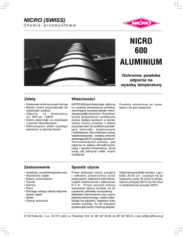 NICRO 600 ALUMINIUM Ochronna powłoka odporna na wysoką temperaturę Zalety Właściwości • Doskonała ochrona przed korozją • Bardzo dobra przyczepność do większości podłoży • Odporny na temperatury od − 500C do + 6000C • Dobra odporność na chemikalia i czynniki atmosferyczne • Mikroskopijne płatki czystego aluminium w płynnej formie NICRO 600 jest doskonałą, odporną na wysoką temperaturę powłoką, zawierającą wysokiej jakości mikro− skopijne płatki aluminium. W podwyż− szonej temperaturze syntetyczna żywica, będąca spoiwem, w wyniku reakcji tworzy powłokę o dobrej przyczepności do podłoża posiada− jącą własności antykorozyjne i hydrofobowe. Nicro 600 jest mocną, wysokowytrzymałą warstwą ochronną zawierającą 95,5% czystego aluminium. Termoutwardzona warstwa jest odporna na wpływy atmosferyczne, niską i wysoką temperaturę, słoną wodę, olej, benzynę i wiele innych substancji. Zastosowanie Sposób użycia • • • • • • • Przed aplikacją należy oczyścić i odtłuścić powierzchnię przez piaskowanie. Jeśli jest to niemożliwe, czyścić mechanicznie i odtłuszczać K−3 S. Przed użyciem dobrze wymieszać płynny produkt, aż do uzyskania jednolitej konsystencji. Nakładać równomiernie przy użyciu pistoletu lakierniczego, wałka malar− skiego lub pędzlem. Nakładać tylko cienkie warstwy. Po 60 minutach powłoka jest sucha, można ją dotykać. Instalacje wysokotemperaturowe Wymienniki ciepła Bojlery przemysłowe Tłumiki Kominy Piece Różnego rodzaju układy odprowa− dzania spalin • Silniki • Osłony termiczne Powłoka aluminiowa po utwar− dzeniu nie jest toksyczna. Optymalną twardość warstwy o gru− bości 20−25 µm uzyskuje się po wygrzaniu przez 30 minut w tempe− raturze powyżej 2500C lub 60 minut w temperaturze powyżej 2000C. GT 85 Polska Sp. z o.o., 20−731 Lublin, ul. Poznańska 10/3, tel. 081 527 84 85, fax 081 527 86 22, e−mail: gt85pl gt85.com.pl Dane techniczne NICRO 600 Aluminium Własności fizykochemiczne Postać Kolor Zapach Lepkość Gęstość (200C) Temperatura zapłonu Optymalna grubość warstwy płyn srebrzysty zapach własny 11 s (kubek Forda 100 ml) 1,07 g/cm3 +350C 75 µm Czas utwardzania [godz.] Stopień 1 Stopień 5 Gotowość do dalszego lakierowania 0,5 2 2 Wydajność Wilgotna powłoka o grubości 50 µm/m2 83 g/m2 Stan po utwardzeniu Test adhezji Elastyczność Test w kąpieli solnej /300 godzin Odporność na temperaturę Porowatość Przewodność elektryczna Wytrzymałość (adhezja) 0 1 mm wynik bardzo dobry −500C do +6000C nie porowaty 4 x 103 1,3 N/mm2 Czynniki ekologiczne Klasyfikacja toksyczności Posiada atest PZH Sposób utylizacji Xn Substancja szkodliwa R20/21/22 − 40 Zgodnie z Ustawą o odpadach Dz. U. Nr 96 poz. 592 z 1997 r. wraz z późniejszymi zmianami. Opakowania Puszka Kanister 1 kg 5 kg Importer: NICRO (SWISS) AG CH−9469 Haag SG Tel. +41 81 / 750 36 80 Fax +41 81 / 750 36 90 GT 85 Polska Sp. z o.o. 20−731 Lublin, ul. Poznańska 10/3 Tel. 081 / 527 84 85 Fax 081 / 527 86 22 Dane zawarte w tym arkuszu mają charakter informacyjny i zostały zebrane według najlepszej wiedzy i dotychczasowego doświadczenia. Nie możemy przejmować żadnej odpowiedzialności za rezultaty u osób trzecich, gdyż warunki i stosowane metody znajdują się poza naszą kontrolą.
