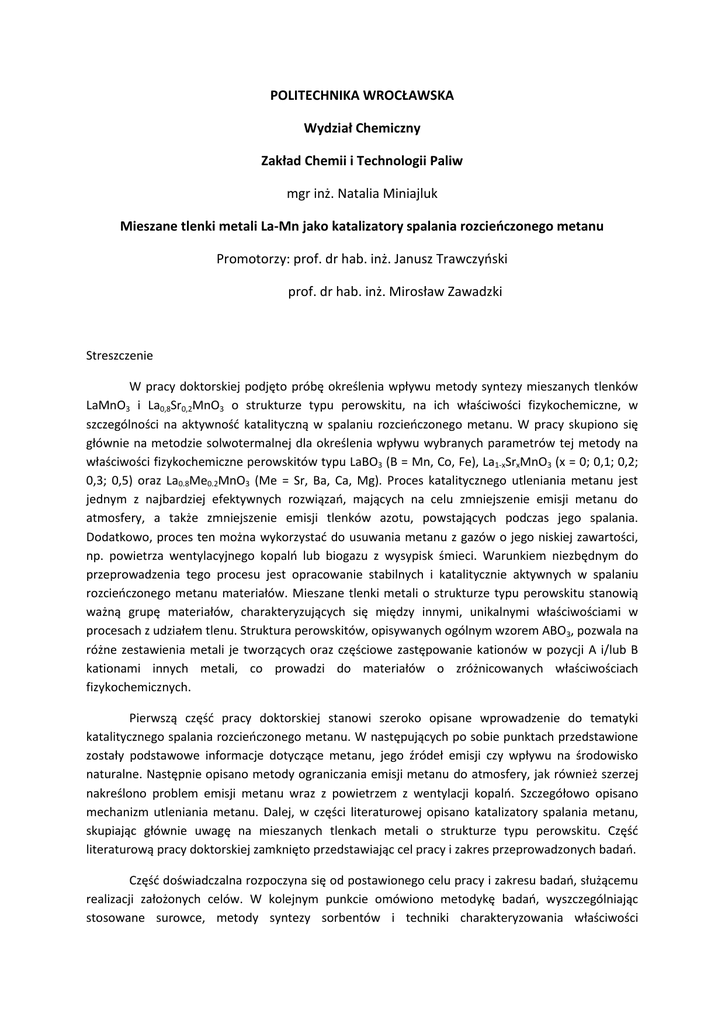 POLITECHNIKA WROCŁAWSKA Wydział Chemiczny Zakład Chemii i Technologii Paliw mgr inż. Natalia Miniajluk Mieszane tlenki metali La-Mn jako katalizatory spalania rozcieńczonego metanu Promotorzy: prof. dr hab. inż. Janusz Trawczyński prof. dr hab. inż. Mirosław Zawadzki Streszczenie W pracy doktorskiej podjęto próbę określenia wpływu metody syntezy mieszanych tlenków LaMnO3 i La0,8Sr0,2MnO3 o strukturze typu perowskitu, na ich właściwości fizykochemiczne, w szczególności na aktywność katalityczną w spalaniu rozcieńczonego metanu. W pracy skupiono się głównie na metodzie solwotermalnej dla określenia wpływu wybranych parametrów tej metody na właściwości fizykochemiczne perowskitów typu LaBO3 (B = Mn, Co, Fe), La1-xSrxMnO3 (x = 0; 0,1; 0,2; 0,3; 0,5) oraz La0.8Me0.2MnO3 (Me = Sr, Ba, Ca, Mg). Proces katalitycznego utleniania metanu jest jednym z najbardziej efektywnych rozwiązań, mających na celu zmniejszenie emisji metanu do atmosfery, a także zmniejszenie emisji tlenków azotu, powstających podczas jego spalania. Dodatkowo, proces ten można wykorzystać do usuwania metanu z gazów o jego niskiej zawartości, np. powietrza wentylacyjnego kopalń lub biogazu z wysypisk śmieci. Warunkiem niezbędnym do przeprowadzenia tego procesu jest opracowanie stabilnych i katalitycznie aktywnych w spalaniu rozcieńczonego metanu materiałów. Mieszane tlenki metali o strukturze typu perowskitu stanowią ważną grupę materiałów, charakteryzujących się między innymi, unikalnymi właściwościami w procesach z udziałem tlenu. Struktura perowskitów, opisywanych ogólnym wzorem ABO3, pozwala na różne zestawienia metali je tworzących oraz częściowe zastępowanie kationów w pozycji A i/lub B kationami innych metali, co prowadzi do materiałów o zróżnicowanych właściwościach fizykochemicznych. Pierwszą część pracy doktorskiej stanowi szeroko opisane wprowadzenie do tematyki katalitycznego spalania rozcieńczonego metanu. W następujących po sobie punktach przedstawione zostały podstawowe informacje dotyczące metanu, jego źródeł emisji czy wpływu na środowisko naturalne. Następnie opisano metody ograniczania emisji metanu do atmosfery, jak również szerzej nakreślono problem emisji metanu wraz z powietrzem z wentylacji kopalń. Szczegółowo opisano mechanizm utleniania metanu. Dalej, w części literaturowej opisano katalizatory spalania metanu, skupiając głównie uwagę na mieszanych tlenkach metali o strukturze typu perowskitu. Część literaturową pracy doktorskiej zamknięto przedstawiając cel pracy i zakres przeprowadzonych badań. Część doświadczalna rozpoczyna się od postawionego celu pracy i zakresu badań, służącemu realizacji założonych celów. W kolejnym punkcie omówiono metodykę badań, wyszczególniając stosowane surowce, metody syntezy sorbentów i techniki charakteryzowania właściwości fizykochemicznych, takie jak: analiza rentgenograficzna, sorpcja azotu, mikroskopia skaningowa oraz transmisyjna, pomiar właściwości kwasowo-zasadowych, temperaturowo programowana redukcja wodorem, temperaturowo programowana desorpcja tlenu i dwutlenku węgla, analiza powierzchni metodą spektroskopii fotoelektronów rentgenowskich oraz testy spalania rozcieńczonego metanu. Dalszą część pracy doktorskiej stanowią wyniki badań i ich dyskusja, które podzielono na dwa rozdziały. W pierwszym rozdziale przedstawiono i przedyskutowano wyniki badań wpływu warunków i metody syntezy mieszanych tlenków LaMnO3 i La0,8Sr0,2MnO3 wytwarzanych technikami: zol-żel, spalania chemicznego, solwotermalną oraz pirolizy par. Z kolei drugi rozdział, składający się z czterech podrozdziałów, dotyczy mieszanych tlenków o strukturze perowskitu wytwarzanych metodą solwotermalną oraz zawiera wyniki badań dotyczących wpływu poszczególnych parametrów syntezy solwotermalnej na właściwości fizykochemiczne tych materiałów. Każdy z powyższych rozdziałów dotyczących wyników badań zamknięto podsumowaniem uzyskanych wyników. Ostatnią część pracy stanowią wnioski w oparciu o postawione w pracy cele i założenia. Praca kończy się wypisem przytoczonej literatury, jak również przedstawieniem dorobku i osiągnięć naukowych.