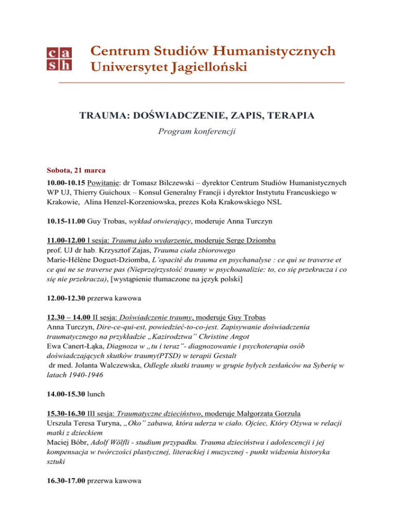 Centrum Studiów Humanistycznych Uniwersytet Jagielloński ________________________________________________________________________ TRAUMA: DOŚWIADCZENIE, ZAPIS, TERAPIA Program konferencji Sobota, 21 marca 10.00-10.15 Powitanie: dr Tomasz Bilczewski – dyrektor Centrum Studiów Humanistycznych WP UJ, Thierry Guichoux – Konsul Generalny Francji i dyrektor Instytutu Francuskiego w Krakowie, Alina Henzel-Korzeniowska, prezes Koła Krakowskiego NSL 10.15-11.00 Guy Trobas, wykład otwierający, moderuje Anna Turczyn 11.00-12.00 I sesja: Trauma jako wydarzenie, moderuje Serge Dziomba prof. UJ dr hab. Krzysztof Zajas, Trauma ciała zbiorowego Marie-Hélène Doguet-Dziomba, L’opacité du trauma en psychanalyse : ce qui se traverse et ce qui ne se traverse pas (Nieprzejrzystość traumy w psychoanalizie: to, co się przekracza i co się nie przekracza), [wystąpienie tłumaczone na język polski] 12.00-12.30 przerwa kawowa 12.30 – 14.00 II sesja: Doświadczenie traumy, moderuje Guy Trobas Anna Turczyn, Dire-ce-qui-est, powiedzieć-to-co-jest. Zapisywanie doświadczenia traumatycznego na przykładzie „Kazirodztwa” Christine Angot Ewa Canert-Łąka, Diagnoza w „tu i teraz”- diagnozowanie i psychoterapia osób doświadczających skutków traumy(PTSD) w terapii Gestalt dr med. Jolanta Walczewska, Odległe skutki traumy w grupie byłych zesłańców na Syberię w latach 1940-1946 14.00-15.30 lunch 15.30-16.30 III sesja: Traumatyczne dzieciństwo, moderuje Małgorzata Gorzula Urszula Teresa Turyna, „Oko” zabawa, która uderza w ciało. Ojciec, Który Ożywa w relacji matki z dzieckiem Maciej Bóbr, Adolf Wölfli - studium przypadku. Trauma dzieciństwa i adolescencji i jej kompensacja w twórczości plastycznej, literackiej i muzycznej - punkt widzenia historyka sztuki 16.30-17.00 przerwa kawowa 17.00-19.00 Panel dyskusyjny, moderuje Alina Henzel-Korzeniowska i dr hab. Jarosław Fazan Udział biorą: dr Edyta Gawron, dr Roma Sendyka, dr hab. med. Krzysztof Rutkowski, Serge Dziomba, Dariusz Christophe Szymor Niedziela, 22 marca 2015 10.30-12.00 IV sesja: (Nie)uchwytność traumy, moderuje Marie-Hélène Doguet-Dziomba Alina Henzel-Korzeniowska, Pod pręgierzem normy - trauma współczesnego człowieka. Refleksja zilustrowana fragmentem pracy klinicznej z perspektywy psychoanalizy lacanowskiej Ewa Karmińska, T.I.R. Katarzyna Trzeciak, Malte – Rodin, widmowy materializm i życie jako trauma 12.00-12.30 przerwa kawowa 12.30-14.00 V sesja: Wyjście z traumy? moderuje Ewa Canert-Łąka dr Anna Marchewka, Oczyszczenie. Zmazywanie założycielskiej traumy na wybranych przykładach z młodej prozy polskiej Anetta Mackiewicz, Interwencja kryzysowa w sytuacji traumy – refleksje Milena Karlińska-Nehrebecka, Odzyskana dusza ukraińskich ochotników 14.00-14.15 przerwa 14.15 – 15.00 Konkluzja: Serge Dziomba * ___________________________________________________________________________
