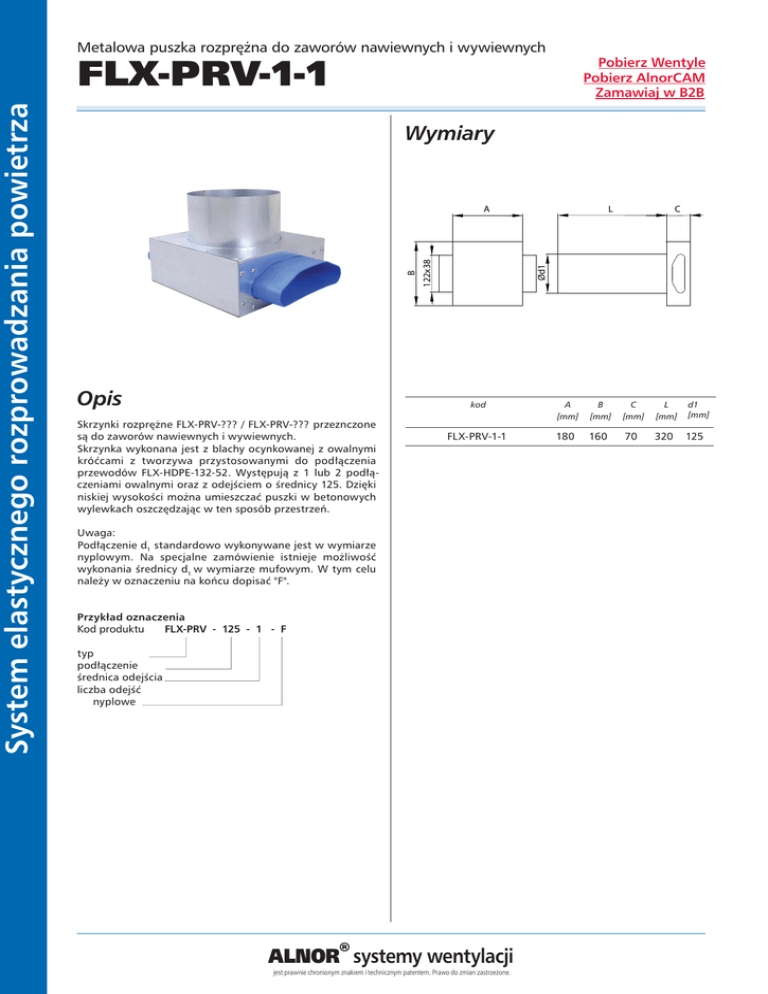FLX-PRV-1-1 Pobierz Wentyle Pobierz AlnorCAM Zamawiaj w B2B Wymiary Opis Skrzynki rozprężne FLX-PRV-??? / FLX-PRV-??? przeznczone są do zaworów nawiewnych i wywiewnych. Skrzynka wykonana jest z blachy ocynkowanej z owalnymi króćcami z tworzywa przystosowanymi do podłączenia przewodów FLX-HDPE-132-52. Występują z 1 lub 2 podłączeniami owalnymi oraz z odejściem o średnicy 125. Dzięki niskiej wysokości można umieszczać puszki w betonowych wylewkach oszczędzając w ten sposób przestrzeń. L C Ød1 B A 122x38 System elastycznego rozprowadzania powietrza Metalowa puszka rozprężna do zaworów nawiewnych i wywiewnych kod A [mm] B [mm] C [mm] L [mm] d1 [mm] FLX-PRV-1-1 180 160 70 320 125 Uwaga: Podłączenie d1 standardowo wykonywane jest w wymiarze nyplowym. Na specjalne zamówienie istnieje możliwość wykonania średnicy d1 w wymiarze mufowym. W tym celu należy w oznaczeniu na końcu dopisać "F". Przykład oznaczenia Kod produktu FLX-PRV - 125 - 1 - F typ podłączenie średnica odejścia liczba odejść nyplowe ALNOR® systemy wentylacji jest prawnie chronionym znakiem i technicznym patentem. Prawo do zmian zastrzeżone.