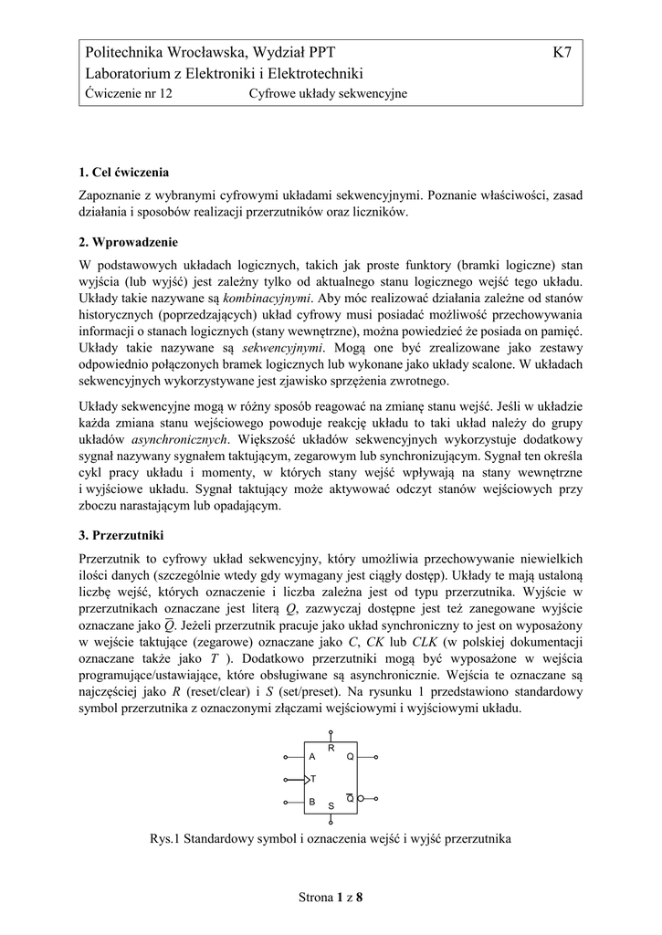 Politechnika Wrocławska, Wydział PPT Laboratorium z Elektroniki i Elektrotechniki Ćwiczenie nr 12 K7 Cyfrowe układy sekwencyjne 1. Cel ćwiczenia Zapoznanie z wybranymi cyfrowymi układami sekwencyjnymi. Poznanie właściwości, zasad działania i sposobów realizacji przerzutników oraz liczników. 2. Wprowadzenie W podstawowych układach logicznych, takich jak proste funktory (bramki logiczne) stan wyjścia (lub wyjść) jest zależny tylko od aktualnego stanu logicznego wejść tego układu. Układy takie nazywane są kombinacyjnymi. Aby móc realizować działania zależne od stanów historycznych (poprzedzających) układ cyfrowy musi posiadać możliwość przechowywania informacji o stanach logicznych (stany wewnętrzne), można powiedzieć że posiada on pamięć. Układy takie nazywane są sekwencyjnymi. Mogą one być zrealizowane jako zestawy odpowiednio połączonych bramek logicznych lub wykonane jako układy scalone. W układach sekwencyjnych wykorzystywane jest zjawisko sprzężenia zwrotnego. Układy sekwencyjne mogą w różny sposób reagować na zmianę stanu wejść. Jeśli w układzie każda zmiana stanu wejściowego powoduje reakcję układu to taki układ należy do grupy układów asynchronicznych. Większość układów sekwencyjnych wykorzystuje dodatkowy sygnał nazywany sygnałem taktującym, zegarowym lub synchronizującym. Sygnał ten określa cykl pracy układu i momenty, w których stany wejść wpływają na stany wewnętrzne i wyjściowe układu. Sygnał taktujący może aktywować odczyt stanów wejściowych przy zboczu narastającym lub opadającym. 3. Przerzutniki Przerzutnik to cyfrowy układ sekwencyjny, który umożliwia przechowywanie niewielkich ilości danych (szczególnie wtedy gdy wymagany jest ciągły dostęp). Układy te mają ustaloną liczbę wejść, których oznaczenie i liczba zależna jest od typu przerzutnika. Wyjście w przerzutnikach oznaczane jest literą Q, zazwyczaj dostępne jest też zanegowane wyjście ̅ . Jeżeli przerzutnik pracuje jako układ synchroniczny to jest on wyposażony oznaczane jako Q w wejście taktujące (zegarowe) oznaczane jako C, CK lub CLK (w polskiej dokumentacji oznaczane także jako T ). Dodatkowo przerzutniki mogą być wyposażone w wejścia programujące/ustawiające, które obsługiwane są asynchronicznie. Wejścia te oznaczane są najczęściej jako R (reset/clear) i S (set/preset). Na rysunku 1 przedstawiono standardowy symbol przerzutnika z oznaczonymi złączami wejściowymi i wyjściowymi układu. A R Q T B S Q Rys.1 Standardowy symbol i oznaczenia wejść i wyjść przerzutnika Strona 1 z 8 Politechnika Wrocławska, Wydział PPT Laboratorium z Elektroniki i Elektrotechniki Ćwiczenie nr 12 K7 Cyfrowe układy sekwencyjne Przerzutnik może posiadać jednocześnie wejścia statyczne (np. wejścia danych) i dynamiczne (np. taktujące), które są oznaczane trójkątem. Jeśli wejście ma aktywny stan niski (negacja wejścia) to jest ono oznaczane okręgiem, takie oznaczenie zaprezentowano przy wejściu A na rysunku 1. Sygnał taktujący może wyzwalać układ przy zboczu narastającym i jest to oznaczone samym trójkątem przy wejściu taktującym (tak jak na rysunku 1 przy wejściu T ) lub odczyt danych wejściowych może mieć miejsce przy zboczu opadającym sygnału taktującego i jest to oznaczane dodatkowym okręgiem przy trójkącie. 4. Rodzaje przerzutników Zasadę działania przerzutnika można opisać za pomocą tablicy prawdy, tablicy przejść, tablicy wzbudzeń lub wykresu czasowego. Metody te są równoważne i na podstawie jednej z nich można odtworzyć pozostałe. W trakcie realizacji tego ćwiczenia dla uproszenia interpretacji działania układów będziemy posługiwać się przede wszystkim tablicami prawdy i wykresami czasowymi. Tablica prawdy, zwana także tablicą wartości funkcji lub tablicą stanów, określa stany na wejściach informacyjnych (danych) przed wyzwoleniem układu (jeśli układ jest synchroniczny, to jest on wyzwalany sygnałem taktującym) i stany wyjść po wyzwoleniu układu. Ten sposób jest powszechnie stosowany przy ilustracji zasady działania podstawowych bramek logicznych. a) przerzutnik RS Najprostszy przerzutnik asynchroniczny można zrealizować korzystając z dwóch dwuwejściowych bramek NOR lub NAND. Dzięki wykorzystaniu sprzężenia zwrotnego możliwe jest zapamiętanie stanów wyjściowych. Układ ten posiada dwa wejścia programujące: ̅ (w tabeli zerujące R (reset) i ustawiające S (set) oraz dwa dopełniające się wyjścia Q oraz Q prawdy oznaczone jako !Q). Na rysunku 2 przedstawiono przerzutnik RS zbudowany z bramek NOR, jego symbol graficzny, tablicę prawdy i wykres czasowy. a) R R Q S Q Q S c) b) Q d) S R Q 0 0 bez zmian 0 1 0 1 1 0 1 0 1 1 S 0 0 1 1 R 0 1 0 1 Q bz 0 1 Z !Q bz 1 0 Z !Q zabroniony Rys.2 Przerzutnik RS: a) realizacja z bramek NOR, b) symbol graficzny, c) tablica prawdy, d) wykres czasowy Strona 2 z 8 Politechnika Wrocławska, Wydział PPT Laboratorium z Elektroniki i Elektrotechniki Ćwiczenie nr 12 K7 Cyfrowe układy sekwencyjne Zgodnie z przedstawioną tablicą prawdy stan 1 na wejściu S powoduje ustawienie na wyjściu Q stanu 1. Ustawienie wyjścia Q w stan 0 następuje po wprowadzeniu wejścia R w stan 1. Jeżeli oba wejścia mają stan 0 to stan wyjść nie zmienia się, czyli poprzedni stan wyjść jest utrzymany (oznaczono to na rysunku 2 jako „bez zmian” lub „bz”). W takiej sytuacji przerzutnik realizuje funkcję pamiętania. Przedstawiony przerzutnik posiada jednak istotną wadę. Podanie logicznego stanu 1 na dowolne wejście bramki NOR skutkuje stanem logicznym 0 na wyjściu bramki. Z tego powodu ̅ w przypadku gdy oba wejścia R i S jednocześnie będą ustawione na stan 1, wyjścia Q oraz Q będą miały taki sam stan równy 0. Taka sytuacja stoi w sprzeczności z założeniem, że oba wyjścia są względem siebie zanegowane. Stan ten jest nazywany stanem zabronionym i oznaczony jest n
