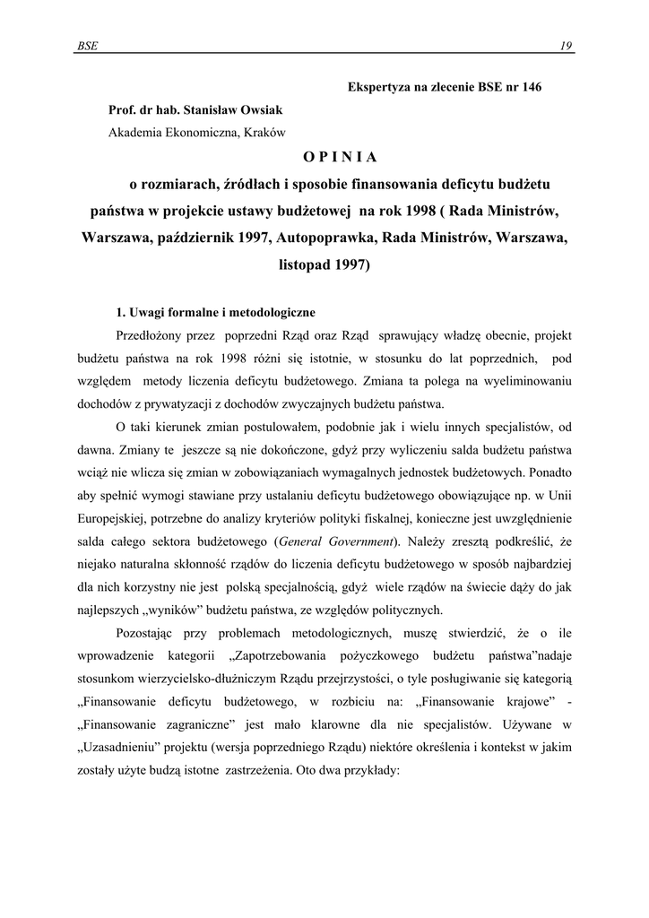 BSE 19 Ekspertyza na zlecenie BSE nr 146 Prof. dr hab. Stanisław Owsiak Akademia Ekonomiczna, Kraków OPINIA o rozmiarach, źródłach i sposobie finansowania deficytu budżetu państwa w projekcie ustawy budżetowej na rok 1998 ( Rada Ministrów, Warszawa, październik 1997, Autopoprawka, Rada Ministrów, Warszawa, listopad 1997) 1. Uwagi formalne i metodologiczne Przedłożony przez poprzedni Rząd oraz Rząd sprawujący władzę obecnie, projekt budżetu państwa na rok 1998 różni się istotnie, w stosunku do lat poprzednich, pod względem metody liczenia deficytu budżetowego. Zmiana ta polega na wyeliminowaniu dochodów z prywatyzacji z dochodów zwyczajnych budżetu państwa. O taki kierunek zmian postulowałem, podobnie jak i wielu innych specjalistów, od dawna. Zmiany te jeszcze są nie dokończone, gdyż przy wyliczeniu salda budżetu państwa wciąż nie wlicza się zmian w zobowiązaniach wymagalnych jednostek budżetowych. Ponadto aby spełnić wymogi stawiane przy ustalaniu deficytu budżetowego obowiązujące np. w Unii Europejskiej, potrzebne do analizy kryteriów polityki fiskalnej, konieczne jest uwzględnienie salda całego sektora budżetowego (General Government). Należy zresztą podkreślić, że niejako naturalna skłonność rządów do liczenia deficytu budżetowego w sposób najbardziej dla nich korzystny nie jest polską specjalnością, gdyż wiele rządów na świecie dąży do jak najlepszych „wyników” budżetu państwa, ze względów politycznych. Pozostając przy problemach metodologicznych, muszę stwierdzić, że o ile wprowadzenie kategorii „Zapotrzebowania pożyczkowego budżetu państwa”nadaje stosunkom wierzycielsko-dłużniczym Rządu przejrzystości, o tyle posługiwanie się kategorią „Finansowanie deficytu budżetowego, w rozbiciu na: „Finansowanie krajowe” „Finansowanie zagraniczne” jest mało klarowne dla nie specjalistów. Używane w „Uzasadnieniu” projektu (wersja poprzedniego Rządu) niektóre określenia i kontekst w jakim zostały użyte budzą istotne zastrzeżenia. Oto dwa przykłady: 20 BSE a) nie można - moim zdaniem - za „Finansowanie krajowe” traktować spłaty kredytu „powodziowego” NBP. Aby spłacić ów kredyt trzeba znaleźć środki, a więc właśnie sfinansować tę spłatę kredytu z jakiegoś źródła (s. 414 „Uzasadnienia”), b) nie wiem o co chodzi w stwierdzeniu, że w zakres „Finansowania krajowego” wchodzą pożyczki udzielone dla KUKE (tamże s. 414). Podawanie takich informacji obok informacji prawidłowych, których przykładem jest stwierdzenie, że „Finansowanie krajowe” to min. „przyrost zadłużenia netto w bonach skarbowych”(tamże s. 414), jest nie do przyjęcia. Zaciemnia ono obraz źródeł finansowania deficytu budżetowego, utrudnia ocenę zjawisk zachodzących w tym obszarze. Przecież dane te kierowane są przede wszystkim dla posłów i senatorów, którzy nie muszą się znać na tak dowolnie używanej terminologii finansowej. 2. Rozmiary deficytu budżetowego Deficyt budżetowy w roku 1997 według ustawy budżetowej po zmianach ustalony był w wysokości 12.586 mln zł. Według informacji przedstawionych w „Uzasadnieniu” do projektu ustawy budżetowej opracowanego przez poprzedni Rząd przewidywane wykonanie deficytu budżetu państwa w roku 1997 miało wynieść 9.167 mln zł., natomiast w Autopoprawce obecnego Rządu 8.200 mln. W każdym razie ważne jest podkreślenie, że w roku 1997 deficyt budżetowy będzie istotnie mniejszy od zapisanego w ustawie budżetowej, gdyż o 34.8%. Wprawdzie przedmiotem opinii jest deficyt budżetu państwa na rok 1998, jednak zjawiska, które występowały w tym obszarze w roku poprzednim są ważne dla zrozumienia polityki fiskalnej w ogóle. Na nie zrealizowanie (według przewidywań) deficytu budżetowego w 1997 roku złoży się wiele przyczyn. Zostały one wymienione w „Uzasadnieniu” (s. 14 - 19), stąd też nie ma powodu do wymieniania ich wszystkich w tym miejscu. Warte podkreślenia są natomiast dwie przyczyny: - po pierwsze, wyższe niż zakładała ustawa budżetowa dochody, łącznie z dochodami z prywatyzacji (według prognozy Rządu z listopada br. o około 2.666 mln zł, czyli więcej o 2,3%), - po drugie, trudności w pozyskiwaniu środków dla finansowania deficytu budżetowego. Powstały one ogólnie rzecz biorąc na skutek wzrostu konkurencji na rynkach pożyczkowych (finansowych). Do wzrostu konkurencji przyczynił się m.in. powrót na rynek BSE 21 bonów pieniężnych NBP. Istotny wpływ wywarła też zmiana strategii inwestowania banków komercyjnych, i wreszcie zmniejszająca się rentowność skarbowych papierów wartościowych (SPW). W kontekście tej drugiej przyczyny należy przypomnieć o błędnej moim zdaniem - decyzji zniesienia preferencji podatkowych przy zakupie przez gospodarstwa domowe obligacji skarbowych, co zmniejszyło zainteresowanie ludności lokowaniem w ten instrument finansowy. Do sprawy tej należałoby powrócić i przedstawić rzetelny rachunek strat i korzyści Państwa powstałych na skutek tej decyzji. Można więc powiedzieć, że dzięki dodatkowym dochodom udało się sfinansować pewną część wydatków, co byłoby utrudnione zważywszy fakt, że według przewidywań wydatki budżetu państwa zapisane w ustawie budżetowej zostaną wykonane. Przedstawione powyżej fakty, z konieczności wybrane, nakazują ostrożne podejście do planu dochodów, wydatków oraz, a zwłaszcza możliwości jego sfinansowania. Istnieje tutaj wiele niewiadomych, co dotyczy w szczególności źródeł finansowania deficytu budżetowego. Rząd (Państwo) ma oczywiście uprzywilejowaną pozycję na rynkach finansowych, wynikającą przede wszystkim z minimalnego ryzyka inwestorów, ale problemem pozostaje cena, którą płaci Rząd za pozyskiwane środki na rynkach pożyczkowych. Fakt ten musi być uwzględniony przy decyzjach pożyczkowych Rządu, gdyż w przeciwnym razie P