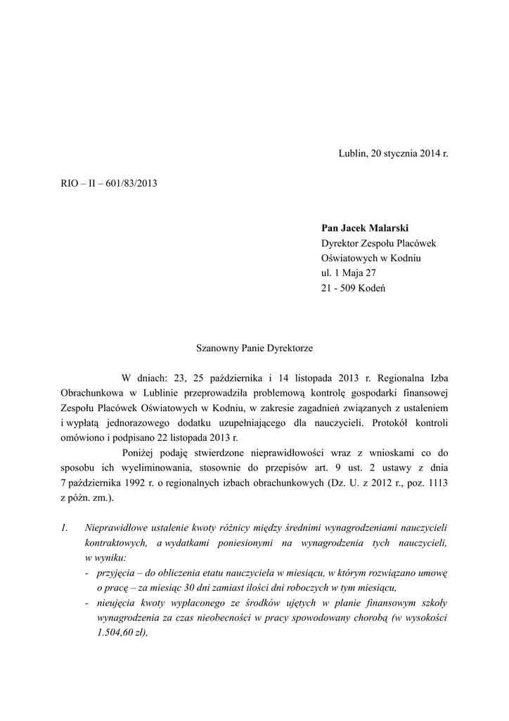 Lublin, 20 stycznia 2014 r. RIO – II – 601/83/2013 Pan Jacek Malarski Dyrektor Zespołu Placówek Oświatowych w Kodniu ul. 1 Maja 27 21 - 509 Kodeń Szanowny Panie Dyrektorze W dniach: 23, 25 października i 14 listopada 2013 r. Regionalna Izba Obrachunkowa w Lublinie przeprowadziła problemową kontrolę gospodarki finansowej Zespołu Placówek Oświatowych w Kodniu, w zakresie zagadnień związanych z ustaleniem i wypłatą jednorazowego dodatku uzupełniającego dla nauczycieli. Protokół kontroli omówiono i podpisano 22 listopada 2013 r. Poniżej podaję stwierdzone nieprawidłowości wraz z wnioskami co do sposobu ich wyeliminowania, stosownie do przepisów art. 9 ust. 2 ustawy z dnia 7 października 1992 r. o regionalnych izbach obrachunkowych (Dz. U. z 2012 r., poz. 1113 z późn. zm.). 1. Nieprawidłowe ustalenie kwoty różnicy między średnimi wynagrodzeniami nauczycieli kontraktowych, a wydatkami poniesionymi na wynagrodzenia tych nauczycieli, w wyniku: - przyjęcia – do obliczenia etatu nauczyciela w miesiącu, w którym rozwiązano umowę o pracę – za miesiąc 30 dni zamiast ilości dni roboczych w tym miesiącu, - nieujęcia kwoty wypłaconego ze środków ujętych w planie finansowym szkoły wynagrodzenia za czas nieobecności w pracy spowodowany chorobą (w wysokości 1.504,60 zł), 2 co skutkowało ustaleniem i wypłatą dodatku uzupełniającego za rok 2012 (w łącznej wysokości 958,48 zł), w sytuacji gdy dodatek ten nie przysługiwał. Nieprawidłowe obliczenie średniorocznej struktury zatrudnienia nauczycieli kontraktowych w 2012 r., w wyniku: - uwzględnienia nauczyciela kontraktowego za cały rok, mimo że uzyskał w tym roku kolejny stopień awansu zawodowego, - pomniejszenia etatu nauczyciela w okresie, w którym wypłacono mu wynagrodzenie ze środków ujętych w planie finansowym szkoły – str. 2 – 4 protokołu. W sprawozdaniu z wysokości średnich wynagrodzeń nauczycieli na poszczególnych stopniach awansu zawodowego w szkołach prowadzonych przez gminę wykazywać wszystkie wydatki poniesione w roku podlegającym analizie z budżetu gminy na wynagrodzenia, w składnikach wskazanych w art. 30 ust. 1 ustawy z dnia 26 stycznia 1982 r. Karta Nauczyciela (Dz. U. z 2006 r. Nr 97, poz. 674 z późn. zm.), zgodnie z przepisami art. 30 a ust. 2 tej ustawy. Średnioroczną strukturę zatrudnienia nauczycieli ustalać na podstawie średniorocznej liczby etatów nauczycieli na poszczególnych stopniach awansu zawodowego, z uwzględnieniem uzyskania przez nauczycieli kolejnych stopni awansu zawodowego w danym roku, stosownie do przepisów § 3 ust. 1 rozporządzenia Ministra Edukacji Narodowej z dnia 13 stycznia 2010 r. w sprawie sposobu opracowywania sprawozdania z wysokości średnich wynagrodzeń nauczycieli na poszczególnych stopniach awansu zawodowego w szkołach prowadzonych przez jednostki samorządu terytorialnego (Dz. U. Nr 6, poz. 35 z późn. zm.), a przy jej ustalaniu: – uwzględniać liczbę etatów nauczycieli w okresach, w których wypłacono im wynagrodzenie ze środków ujętych w planie finansowym szkoły, zgodnie z wymiarem zatrudnienia określonym w umowie o pracę lub w akcie mianowania, zgodnie z przepisami § 3 ust. 6 cytowanego rozporządzenia. W przypadku miesięcy, których nauczyciele nie przepracowali w całości – ze względu np. na nawiązanie lub rozwiązanie stosunku pracy – przyjmować wyłącznie dni robocze z okresu, w jakim nauczyciel był zatrudniony (wymiar etatu przemnażać przez stosunek dni roboczych, które nauczyciel faktycznie przepracował do wszystkich dni roboczych w miesiącu), mając na uwadze, że tylko w sytuacji gdy nauczyciel przez część miesiąca pobierał zasiłek lub inne świadczenie z Zakładu Ubezpieczeń Społecznych (a więc wynagrodzenie nie było wypłacane ze środków ujętych w planie finansowym szkoły), za miesiąc przyjmuje się 30 dni, stosownie do postanowień pkt 1 załącznika Nr 1 do cytowanego rozporządzenia, − nauczycieli, którzy w danym roku uzyskali kolejny stopień awansu zawodowego, uwzględniać odpowiednio na stopniach awansu zawodowego proporcjonalnie do 3 okresu pobierania wynagrodzenia na danym stopniu awansu zawodowego, stosownie do przepisów § 3 ust. 3 rozporządzenia. Skorygować sprawozdanie z wysokości średnich wynagrodzeń nauczycieli, o którym mowa w przepisach art. 30a ust. 4 ustawy Karta Nauczyciela oraz naliczenie jednorazowych dodatków uzupełniających za 2012 r. 2. Nieterminowe wypłacenie nauczycielom jednorazowego dodatku uzupełniającego – str. 4 protokołu. Jednorazowy dodatek uzupełniający wypłacać w terminie do dnia 31 stycznia roku kalendarzowego następującego po roku, dla którego wyliczono kwotę różnicy, o której mowa w art. 30a ust. 2 ustawy Karta Nauczyciela, stosownie do przepisów art. 30a ust. 3 tej ustawy. Jeżeli uważa Pan, że wniosek zawarty w tym wystąpieniu narusza prawo przez błędną jego wykładnię lub niewłaściwe zastosowanie, przysługuje Panu – zgodnie z art. 9 ust. 3 i 4 ustawy o regionalnych izbach obrachunkowych – prawo zgłoszenia zastrzeżeń do Kolegium Regionalnej Izby Obrachunkowej w Lublinie w ciągu 14 dni od otrzymania tego wystąpienia. Jednocześnie informuję, że – stosownie do przepisu art. 9 ust. 3 ustawy o regionalnych izbach obrachunkowych – jest Pan zobowiązany zawiadomić Izbę o wykonaniu wniosków pokontrolnych lub o przyczynach ich niewykonania, w formie pisemnej i elektronicznej (plik w formacie Microsoft Word (*.doc) lub Rich Text Format (*.rtf) na adres: [email protected]), w terminie 30 dni od daty doręczenia Panu tego wystąpienia, mając na uwadze przepisy art. 27 tej ustawy. Jacek Grządka Do wiadomości: Wójt Gminy Kodeń