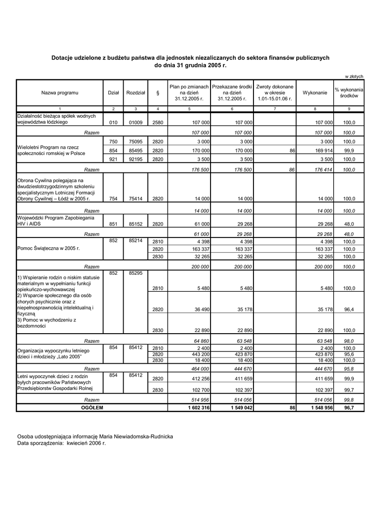 Dotacje udzielone z budżetu państwa dla jednostek niezaliczanych do sektora finansów publicznych do dnia 31 grudnia 2005 r. w złotych Nazwa programu Dział Rozdział § 1 2 3 4 010 01009 2580 750 75095 2820 854 85495 921 92195 Działalność bieżąca spółek wodnych województwa łódzkiego Plan po zmianach Przekazane środki Zwroty dokonane na dzień na dzień w okresie 31.12.2005 r. 31.12.2005 r. 1.01-15.01.06 r. Razem Wojewódzki Program Zapobiegania HIV i AIDS 754 75414 100,0 107 000 107 000 107 000 100,0 3 000 3 000 3 000 100,0 2820 170 000 170 000 2820 3 500 3 500 176 500 176 500 14 000 2820 86 169 914 99,9 3 500 100,0 176 414 100,0 14 000 14 000 100,0 14 000 14 000 14 000 100,0 61 000 29 268 29 268 48,0 86 85152 2820 61 000 29 268 29 268 852 85214 2810 4 398 4 398 4 398 100,0 2820 163 337 163 337 163 337 100,0 2830 32 265 32 265 32 265 100,0 200 000 200 000 200 000 100,0 2810 5 480 5 480 5 480 100,0 2820 36 490 35 178 35 178 96,4 2830 22 890 22 890 22 890 100,0 2810 2820 2830 64 860 2 400 443 200 18 400 63 548 2 400 423 870 18 400 63 548 2 400 423 870 18 400 98,0 100,0 95,6 100,0 464 000 444 670 444 670 95,8 2820 412 256 411 659 411 659 99,9 2830 102 700 102 397 102 397 99,7 514 056 99,8 1 548 956 96,7 Razem 852 48,0 85295 Razem 854 85412 854 85412 Razem Letni wypoczynek dzieci z rodzin byłych pracowników Państwowych Przedsiębiorstw Gospodarki Rolnej 9 851 Pomoc Świąteczna w 2005 r. Organizacja wypoczynku letniego dzieci i młodzieży „Lato 2005” 8 107 000 Razem 1) Wspieranie rodzin o niskim statusie materialnym w wypełnianiu funkcji opiekuńczo-wychowawczej 2) Wsparcie społecznego dla osób chorych psychicznie oraz z niepełnosprawnością intelektualną i fizyczną 3) Pomoc w wychodzeniu z bezdomności 7 107 000 Razem Obrona Cywilna polegająca na dwudziestotrzygodzinnym szkoleniu specjalistycznym Lotniczej Formacji Obrony Cywilnej – Łódź w 2005 r. 6 % wykonania środków 107 000 Razem Wieloletni Program na rzecz społeczności romskiej w Polsce 5 Wykonanie Razem 514 956 514 056 OGÓŁEM 1 602 316 1 549 042 Osoba udostępniająca informację Maria Niewiadomska-Rudnicka Data sporządzenia: kwiecień 2006 r. 86
