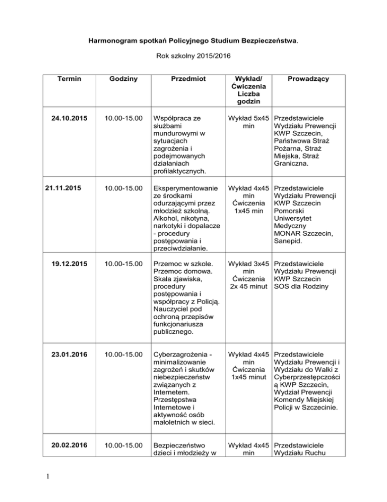 harmonogram_Policyjne Studium Bezpieczeństwa 2015-2016