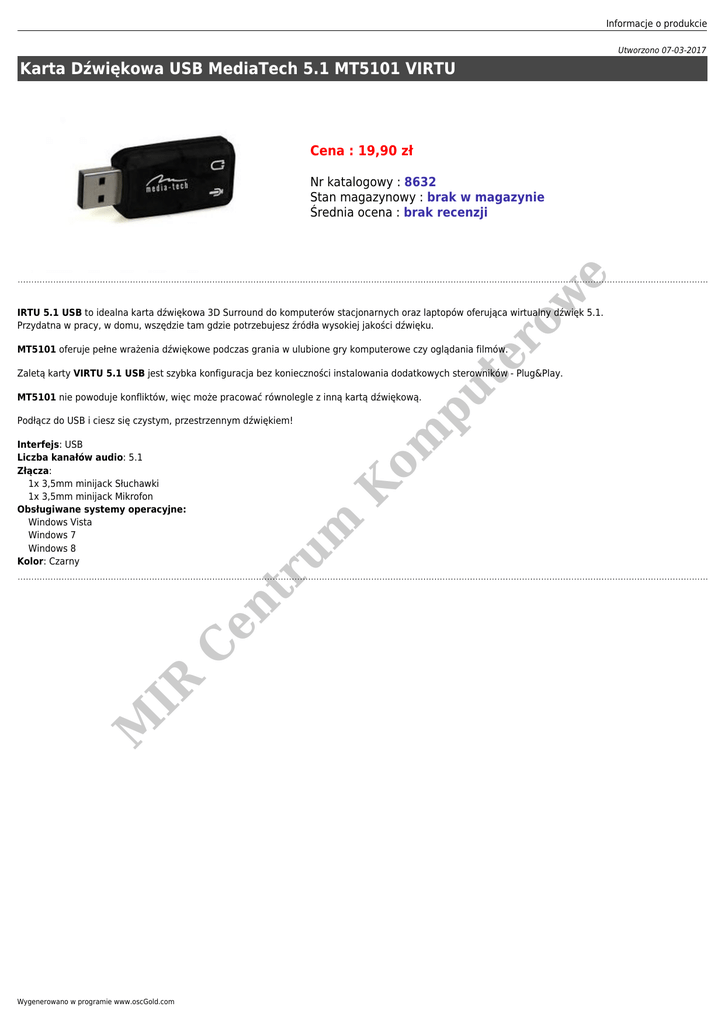 Informacje o produkcie Utworzono 07-03-2017 Karta Dźwiękowa USB MediaTech 5.1 MT5101 VIRTU Cena : 19,90 zł ow e Nr katalogowy : 8632 Stan magazynowy : brak w magazynie Średnia ocena : brak recenzji om pu te r IRTU 5.1 USB to idealna karta dźwiękowa 3D Surround do komputerów stacjonarnych oraz laptopów oferująca wirtualny dźwięk 5.1. Przydatna w pracy, w domu, wszędzie tam gdzie potrzebujesz źródła wysokiej jakości dźwięku. MT5101 oferuje pełne wrażenia dźwiękowe podczas grania w ulubione gry komputerowe czy oglądania filmów. Zaletą karty VIRTU 5.1 USB jest szybka konfiguracja bez konieczności instalowania dodatkowych sterowników - Plug&Play. MT5101 nie powoduje konfliktów, więc może pracować równolegle z inną kartą dźwiękową. M IR um C en tr Interfejs: USB Liczba kanałów audio: 5.1 Złącza: 1x 3,5mm minijack Słuchawki 1x 3,5mm minijack Mikrofon Obsługiwane systemy operacyjne: Windows Vista Windows 7 Windows 8 Kolor: Czarny K Podłącz do USB i ciesz się czystym, przestrzennym dźwiękiem! Wygenerowano w programie www.oscGold.com