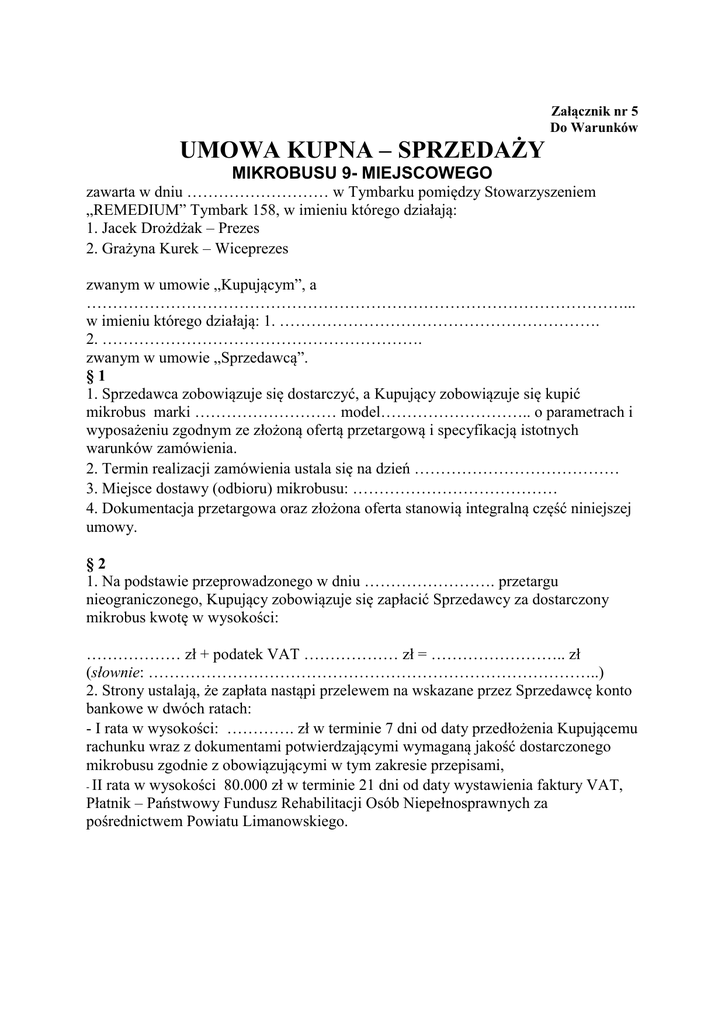 Załącznik nr 5 Do Warunków UMOWA KUPNA – SPRZEDAŻY MIKROBUSU 9- MIEJSCOWEGO zawarta w dniu ……………………… w Tymbarku pomiędzy Stowarzyszeniem „REMEDIUM” Tymbark 158, w imieniu którego działają: 1. Jacek Drożdżak – Prezes 2. Grażyna Kurek – Wiceprezes zwanym w umowie „Kupującym”, a …………………………………………………………………………………………... w imieniu którego działają: 1. ……………………………………………………. 2. ……………………………………………………. zwanym w umowie „Sprzedawcą”. §1 1. Sprzedawca zobowiązuje się dostarczyć, a Kupujący zobowiązuje się kupić mikrobus marki ……………………… model……………………….. o parametrach i wyposażeniu zgodnym ze złożoną ofertą przetargową i specyfikacją istotnych warunków zamówienia. 2. Termin realizacji zamówienia ustala się na dzień ………………………………… 3. Miejsce dostawy (odbioru) mikrobusu: ………………………………… 4. Dokumentacja przetargowa oraz złożona oferta stanowią integralną część niniejszej umowy. §2 1. Na podstawie przeprowadzonego w dniu ……………………. przetargu nieograniczonego, Kupujący zobowiązuje się zapłacić Sprzedawcy za dostarczony mikrobus kwotę w wysokości: ……………… zł + podatek VAT ……………… zł = …………………….. zł (słownie: …………………………………………………………………………..) 2. Strony ustalają, że zapłata nastąpi przelewem na wskazane przez Sprzedawcę konto bankowe w dwóch ratach: - I rata w wysokości: …………. zł w terminie 7 dni od daty przedłożenia Kupującemu rachunku wraz z dokumentami potwierdzającymi wymaganą jakość dostarczonego mikrobusu zgodnie z obowiązującymi w tym zakresie przepisami, - II rata w wysokości 80.000 zł w terminie 21 dni od daty wystawienia faktury VAT, Płatnik – Państwowy Fundusz Rehabilitacji Osób Niepełnosprawnych za pośrednictwem Powiatu Limanowskiego. §3 Na dostarczony autobus Sprzedawca udziela gwarancji na okres: …………. na silnik i podzespoły oraz …….. miesięcy na nadwozie licząc od daty odbioru pojazdu. Szczegółowe warunki gwarancji określa umowa gwarancyjna stanowiąca załącznik do niniejszej umowy. §4 1. Wszelkie zmiany niniejszej umowy wymagają formy pisemnej pod rygorem nieważności. 2. W sprawach nieuregulowanych niniejszą umową mają zastosowania przepisy Kodeksu Cywilnego i Ustawy Prawo Zamówień Publicznych. §5 1. Wszelkie spory wynikłe na tle wykonywania niniejszej umowy strony zobowiązują się rozstrzygać w drodze postępowania reklamacyjnego (polubownego), a po jej wyczerpaniu skierują sprawę do rozstrzygnięcia przez właściwy dla Kupującego Sąd. 2. Postępowanie reklamacyjne polegać będzie na tym, że: a) Kupujący prześle Sprzedawcy pisemne umotywowane roszczenie. b) Sprzedawca jest zobowiązany do ustosunkowania się do złożonego roszczenia w terminie 21 dni od daty jego otrzymania. c) Negatywne rozpatrzenie wniosku przez Sprzedawcę upoważnia Kupującego do wystąpienia na drogę sądową. §6 Z mocy Ustawy Prawo Zamówień Publicznych nieważne są zmiany umowy, które byłyby niekorzystne dla Kupującego i powodowały zmianę złożonej oferty przetargowej, chyba, że konieczność takich zmian wynika z okoliczności, których nie można było przewidzieć w chwili zawarcia umowy. §7 Umowę sporządzono w dwóch jednobrzmiących egzemplarzach po jednym dla każdej ze stron. KUPUJĄCY: 1. .................................. 2. .................................. SPRZEDAWCA: 1. .................................. 2. ..................................
