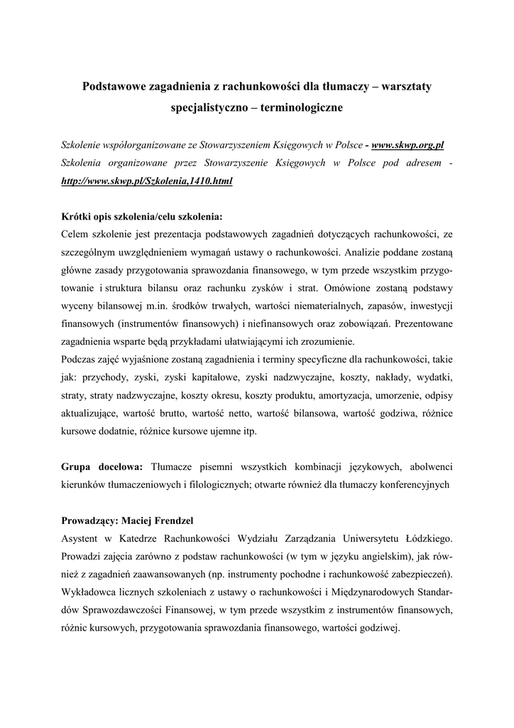 Podstawowe zagadnienia z rachunkowości dla tłumaczy – warsztaty specjalistyczno – terminologiczne Szkolenie współorganizowane ze Stowarzyszeniem Księgowych w Polsce - www.skwp.org.pl Szkolenia organizowane przez Stowarzyszenie Księgowych w Polsce pod adresem http://www.skwp.pl/Szkolenia,1410.html Krótki opis szkolenia/celu szkolenia: Celem szkolenie jest prezentacja podstawowych zagadnień dotyczących rachunkowości, ze szczególnym uwzględnieniem wymagań ustawy o rachunkowości. Analizie poddane zostaną główne zasady przygotowania sprawozdania finansowego, w tym przede wszystkim przygotowanie i struktura bilansu oraz rachunku zysków i strat. Omówione zostaną podstawy wyceny bilansowej m.in. środków trwałych, wartości niematerialnych, zapasów, inwestycji finansowych (instrumentów finansowych) i niefinansowych oraz zobowiązań. Prezentowane zagadnienia wsparte będą przykładami ułatwiającymi ich zrozumienie. Podczas zajęć wyjaśnione zostaną zagadnienia i terminy specyficzne dla rachunkowości, takie jak: przychody, zyski, zyski kapitałowe, zyski nadzwyczajne, koszty, nakłady, wydatki, straty, straty nadzwyczajne, koszty okresu, koszty produktu, amortyzacja, umorzenie, odpisy aktualizujące, wartość brutto, wartość netto, wartość bilansowa, wartość godziwa, róŜnice kursowe dodatnie, róŜnice kursowe ujemne itp. Grupa docelowa: Tłumacze pisemni wszystkich kombinacji językowych, abolwenci kierunków tłumaczeniowych i filologicznych; otwarte równieŜ dla tłumaczy konferencyjnych Prowadzący: Maciej Frendzel Asystent w Katedrze Rachunkowości Wydziału Zarządzania Uniwersytetu Łódzkiego. Prowadzi zajęcia zarówno z podstaw rachunkowości (w tym w języku angielskim), jak równieŜ z zagadnień zaawansowanych (np. instrumenty pochodne i rachunkowość zabezpieczeń). Wykładowca licznych szkoleniach z ustawy o rachunkowości i Międzynarodowych Standardów Sprawozdawczości Finansowej, w tym przede wszystkim z instrumentów finansowych, róŜnic kursowych, przygotowania sprawozdania finansowego, wartości godziwej. Współautor i autor licznych artykułów i ksiąŜek z zakresu rachunkowości krajowej i międzynarodowej m.in.: • Financial accounting. Key problems, examples, exercises. Rachunkowość finansowa. Kluczowe zagadnienia, przykłady, zadania, CCiAE, Łódź 2007; • Międzynarodowe Standardy Sprawozdawczości Finansowe. Zagadnienia kluczowe i rozwiązania praktyczne, SKwP, Warszawa 2006; • Międzynarodowe Standardy Rachunkowości a ustawa o rachunkowości – podobieństwa i róŜnice, SKwP, Warszawa 2005. Uczestniczył w tłumaczeniu i weryfikacji wybranych standardów międzynarodowych MSSF i interpretacji do nich na język polski. Data: 14 marca 2009 (sobota) Godzina: 10:00 – 17:30 (8 godzin dydaktycznych z przerwami) Miejsce: Warszawa, Stowarzyszenie Księgowych w Polsce, Centralny Ośrodek Doskonalenia Zawodowego, ul. Górnośląska 5 Liczba miejsc: 25 Cena: 340 PLN Dla członków STP i KMT: 260 PLN Wszystkie zainteresowane osoby prosimy o wypełnienie formularza (Word) i odesłanie na adres mailowy [email protected] do dnia 10.03.2009 r. Wszystkie osoby uczestniczące w szkoleniu otrzymają certyfikat uczestnictwa wydany przez STP.