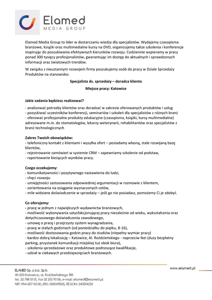 Elamed Media Group to lider w dostarczaniu wiedzy dla specjalistów. Wydajemy czasopisma branżowe, książki oraz multimedialne kursy na DVD, organizujemy także szkolenia i konferencje inspirując do poszukiwania efektywnych kierunków rozwoju. Codziennie wspieramy w pracy ponad 300 tysięcy profesjonalistów, gwarantując im dostęp do aktualnych i sprawdzonych informacji oraz światowych trendów. W związku z nieustannym rozwojem firmy poszukujemy osób do pracy w Dziale Sprzedaży Produktów na stanowisko: Specjalista ds. sprzedaży – doradca klienta Miejsce pracy: Katowice Jakie zadania będziesz realizować? - analizować potrzeby klientów oraz doradzać w zakresie oferowanych produktów i usług - pozyskiwać uczestników konferencji, seminariów i szkoleń dla specjalistów z różnych branż - oferować profesjonalne produkty edukacyjne (czasopisma, książki, kursy multimedialne) adresowane m.in. do stomatologów, lekarzy weterynarii, rehabilitantów oraz specjalistów z branż technologicznych Zakres Twoich obowiązków: - telefoniczny kontakt z klientami i wysyłka ofert – posiadamy własną, stale rozwijaną bazę klientów, - rejestrowanie zamówień w systemie CRM – zapewniamy szkolenie od podstaw, - raportowanie bieżących wyników pracy. Czego oczekujemy: - komunikatywności i pozytywnego nastawienia do ludzi, - chęci rozwoju - umiejętności zastosowania odpowiedniej argumentacji w rozmowie z klientem, - zorientowania na osiąganie wyznaczonych celów, - mile widziane doświadczenie w sprzedaży – jeśli go nie posiadasz, pomożemy Ci je zdobyć. Co oferujemy: - pracę w jednym z największych wydawnictw branżowych, - możliwość wykonywania satysfakcjonującej pracy niezależnie od wieku, wykształcenia oraz dotychczasowego doświadczenia zawodowego, - umowę o pracę i przejrzysty system wynagradzania, - pracę w stałych godzinach (od poniedziałku do piątku, 8-16), - możliwość dostosowania godzin pracy do studiów (niepełny wymiar pracy) - bardzo dobrą lokalizację – Katowice, Al. Roździeńskiego - naprzeciw Ikei (duży bezpłatny parking, przystanek komunikacji miejskiej tuż obok biura), - szkolenia sprzedażowe oraz produktowe podnoszące kwalifikacje, - udział w ciekawych przedsięwzięciach branżowych.