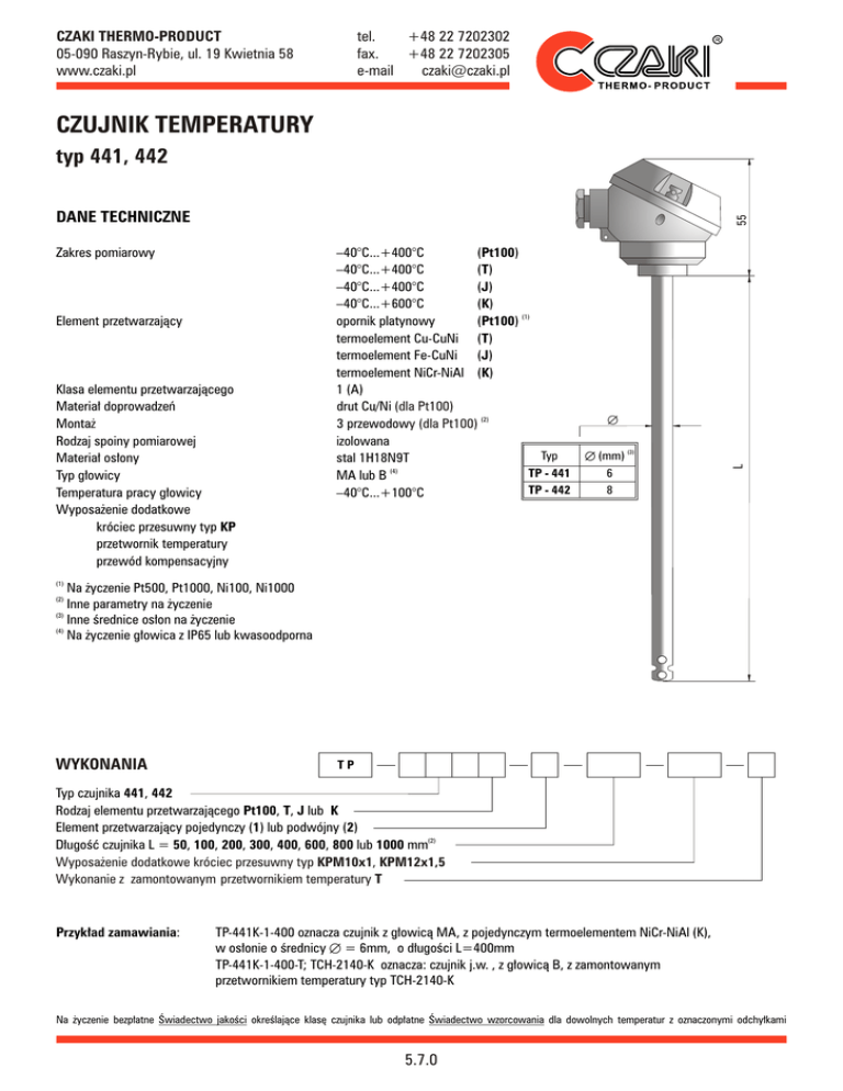 CZAKI THERMO-PRODUCT 05-090 Raszyn-Rybie, ul. 19 Kwietnia 58 www.czaki.pl tel. +48 22 7202302 fax. +48 22 7202305 e-mail [email protected] CZUJNIK TEMPERATURY typ 441, 442 55 DANE TECHNICZNE Element przetwarzający Klasa elementu przetwarzającego Materiał doprowadzeń Montaż Rodzaj spoiny pomiarowej Materiał osłony Typ głowicy Temperatura pracy głowicy Wyposażenie dodatkowe króciec przesuwny typ KP przetwornik temperatury przewód kompensacyjny –40°C...+400°C (Pt100) –40°C...+400°C (T) –40°C...+400°C (J) –40°C...+600°C (K) opornik platynowy (Pt100) (1) termoelement Cu-CuNi (T) termoelement Fe-CuNi (J) termoelement NiCr-NiAl (K) 1 (A) drut Cu/Ni (dla Pt100) 3 przewodowy (dla Pt100) (2) izolowana Typ stal 1H18N9T (4) TP - 441 MA lub B TP - 442 –40°C...+100°C Æ Æ (mm) (3) L Zakres pomiarowy 6 8 (1) Na życzenie Pt500, Pt1000, Ni100, Ni1000 Inne parametry na życzenie (3) Inne średnice osłon na życzenie (4) Na życzenie głowica z IP65 lub kwasoodporna (2) WYKONANIA TP Typ czujnika 441, 442 Rodzaj elementu przetwarzającego Pt100, T, J lub K Element przetwarzający pojedynczy (1) lub podwójny (2) Długość czujnika L = 50, 100, 200, 300, 400, 600, 800 lub 1000 mm(2) Wyposażenie dodatkowe króciec przesuwny typ KPM10x1, KPM12x1,5 Wykonanie z zamontowanym przetwornikiem temperatury T Przykład zamawiania: TP-441K-1-400 oznacza czujnik z głowicą MA, z pojedynczym termoelementem NiCr-NiAl (K), w osłonie o średnicy Æ = 6mm, o długości L=400mm TP-441K-1-400-T; TCH-2140-K oznacza: czujnik j.w. , z głowicą B, z zamontowanym przetwornikiem temperatury typ TCH-2140-K Na życzenie bezpłatne Świadectwo jakości określające klasę czujnika lub odpłatne Świadectwo wzorcowania dla dowolnych temperatur z oznaczonymi odchyłkami 5.7.0