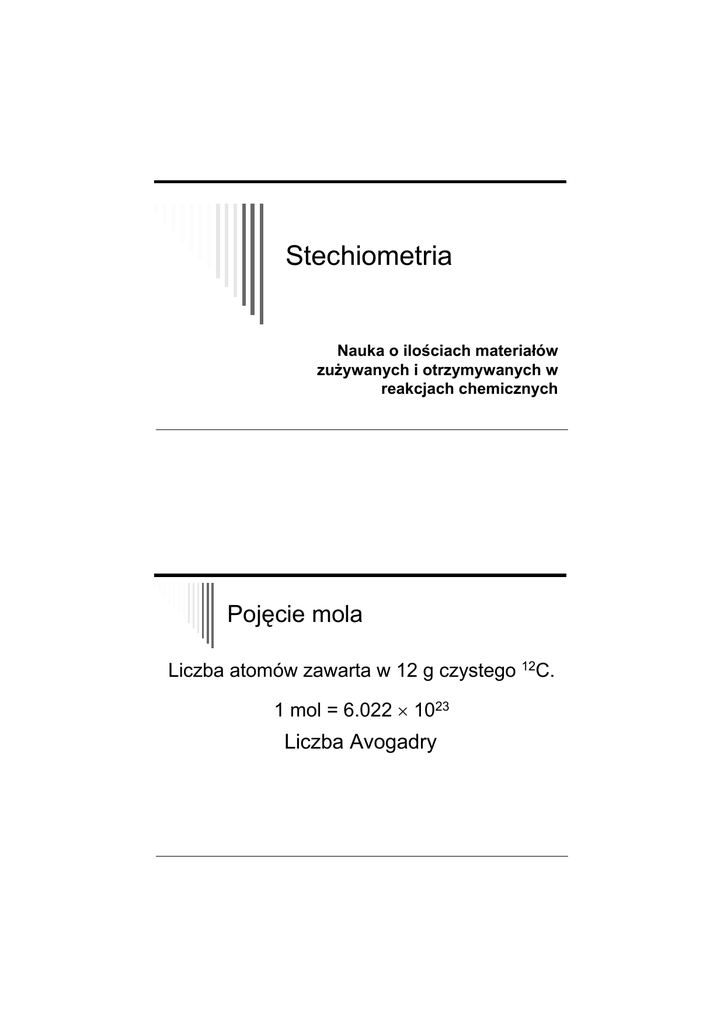 Stechiometria Nauka o ilościach materiałów zużywanych i otrzymywanych w reakcjach chemicznych Pojęcie mola Liczba atomów zawarta w 12 g czystego 12C. 1 mol = 6.022 × 1023 Liczba Avogadry Masa molowa/masa atomowa masa 1 mola związku CO2 = 44.01 g/mol masa jednej cząsteczki CO2 = 44.01 a.j.m. Implikacje definicji mola Przykład 1 Przeliczenie a.j.m. → gram 1 a.j.m. – 1/12 masy 1 atomu 12C masa 1 mola 12C – 12 g/mol 1 mol N=6.022⋅1023 atomów 12C g mol = = 1.99 ⋅ 10−23 g 23 atomów 6.022 ⋅ 10 mol 1 atom ⋅ 12.0 m1 atom 1 a.j.m . = 1 .99 ⋅ 10 − 23 g = 1 .66 ⋅ 10 − 24 g 12 Wyznaczanie liczby Avogadry Prawo Avogadry: dla dowolnego gazu przy p=const i T=const ⇒ V=const i N=const Wyznaczanie liczby Avogadry doświadczenie Rutheforda Ra α licznik Liczba zliczeń Nα= 3.225⋅1018 Neutralizacja α Pomiar V He Objętość He VHe= 0.1200 cm3 T=0oC Wyznaczanie liczby Avogadry C + O2 → CO2 def. mola 12.01 g C (miesz. izotopów) prawo Avogadry O2 O2 spalanie wymrażanie 0.1200 cm3 3.225 ⋅1018 = N 22.400 cm3 pomiar V CO2 Objętość CO2 VCO2= 22.400 cm3 T=0oC N = 6.022 ⋅10 23 Język symboli - atomy Z AX Z – masa atomowa A – liczba atomowa Prepared by Swanson Technologies www.swansontec.com Język symboli - cząsteczki Liczba atomów w cząsteczce homoatomowej O2, S8 w cząsteczce heteroatomowej Ca3(PO4)2 lub Ba(OH)2 Ładunek jonu Ca2+, S2- Wizualizacja cząsteczek H2O freeware http://www.download.com/ACD-ChemSketch-Freeware/3000-2054_4-10591466.html Wizualizacja cząsteczek Skład procentowy związków Udział procentowy masy danego pierwiastka w związku: mass % = mass of element in compound × 100% mass of compound Dla tlenku żelaza (III) (Fe2O3) mass % Fe = 111.69 × 100% = 69.94% 159.69 Wzory empiryczne i rzeczywiste wzór rzeczywisty = (wzór empiryczny)n [n = l. naturalna] wzór rzeczywisty = C6H6 = (CH)6 wzór empiryczny = CH Określanie wzoru empirycznego związku 1. Oprzyj obliczenia na 100 g związku 2. Określ liczbę moli poszcz. pierwiastków w 100 g związku 3. Podziel każdą ilość moli przez najmniejszą spośród nich 4. Pomnóż otrzymane wartości przez liczbę naturalną tak by otrzymać najmniejsze całkowite wartości Określanie wzoru empirycznego związku Przykład Oblicz wzór węglowodoru zawierającego 7.69 % H CxHy - 100 g 7.69 g H oraz 92.31 g C ⇒ H : C = 1.000 : 1.008 ≈ 1 : 1 CH 7.69 g = 7.63 mol g 1.008 mol 92.31g nC = = 7.69 mol g 12.01 mol nH = Związek może być acetylenem C2H2 lub benzenem C6H6 Równania reakcji Opisują przeminę chemiczną związaną z reorganizacją atomów w cząsteczkach Równanie reakcji Reprezentacja reakcji chemicznej: CH4 + H2O → CO + 3H2 substraty produkty prawo zachowania masy Równanie reakcji – jak czytać? CH4 + H2O → CO + 3H2 The equation is balanced. 1 mole of methane reacts with 1 mole of water to produce 1 mole of carbon oxide and 3 moles of hydrogen Równanie reakcji – jak czytać? C2H5OH(g) + 3O2 (g) → 2CO2 (g) + 3H2O(g) Number of reacting atoms and molecules molecule of ethanol reacts with 3 molecules of oxygen to produce 2 molecules of carbon dioxide and molecules of water Number of moles of atoms/molecules of reactants and products 1 mole of ethanol reacts with 3 moles of oxygen to produce 2 moles of carbon dioxide and 3 moles of water Masses of reactants and products 46 g of ethanol reacts with 96 g (3x32 g) of oxygen to produce 88 g (2x44 g) of carbon dioxide and 54 g (3x18 g) of water States of reactants and products Under given conditions gaseous ethanol reacts with gaseous oxygen to produce gaseous Volumes of gaseous reactants and products 1 volume of ethanol reacts with 3 volumes of oxygen to produce 2 volumes of carbon dioxide and 3 volumes of water Obliczenia stechiometryczne 1. 2. 3. 4. 5. Zbilansuj równanie. Konwertuj masy na mole. Ustal stosunki molowe na podst. równania. Użyj ich do obliczenia liczby reagujących moli wg danych. Przelicz mole na g, jeśli potrzeba. Obliczenia stechiometryczne Przykład Ile gramów CO2 otrzymamy utleniając 96.1 g propanu (C3H8) C3H8(g) + 5 O2(g) → 3 CO2(g) + 4 H2O(g) MC3H8 = 44.1 g/mol, MCO2 = 44.0 g/mol nC3H8= 96.1 g/44.1 g/mol = 2.18 mol C3H8(g) : CO2(g) = 1 : 3 nCO2 = 3⋅2.18 = 6.54 mol mCO2 = 44 g/mol ⋅ 6.54 mol = 288 g Substrat limitujący Substrat limitujący jest tym substratem, który w reakcji zużywa się pierwszy ograniczając ilość powstających produktów. Film1 substrat limitujacy.MOV Substrat limitujący Dla reakcji: CH4 + H2O → CO + 3H2 substraty produkty 03_1522 03_1524 No problem, if they are mixed in stoichimetric ratio But, if one reactant is in excess (H2O) not all molecules react 03_1525 Obliczenia stechiometryczne 1. 2. 3. 4. 5. 6. Zbilansuj równanie. Konwertuj masy na mole. Określ, który substrat jest limitujący Ustal stosunki molowe na podst. równania. Użyj ich do obliczenia liczby reagujących moli względem substratu limitującego. Przelicz mole na g, jeśli potrzeba. Obliczenia stechiometryczne Przykład 1 CH4 + 4 S → CS2 + 2 H2S Methane is the main component of marsh gas. Heating methane in presence of sulfur produces carbon disulfide and hydrogen sulfide. Calculate the amount of carbon disulfide when 120 g of methane is reacted with an equal mass of sulfur? data CH4 S CS2 m [g] 120 120 ? M [g/mol] 16.04 32.07 76.15 n = m/M [mol] 120 16.04 = 7.48 120 32.07 = 3.74 stosunek substr. z danych 1 0.5 z równania stech. 1 4 1 rozwiązanie LR n [mol] 3.74 m = n·M [g] H2S 2 3.74 4 = 0.935 0.935·76.15 = 71.2 Obliczenia stechiometryczne Przykład 2 What is the maximum mass of sulfur dioxide that can be produced by the reaction of 95.6 g of carbon disulfide with 110 g of oxygen? CS2 + 3O2 → CO2 + 1 3 76.2 96.5 2 SO2 1 2 nstech, mol 32.0 44.0 64.1 M, g/mol 110 - ? m, g CS2 + 3O2 → CO2 + 2 SO2 1 3 1 2 nstech, mol 76.2 96.5 32.0 110 44.0 - 64.1 ? M, g/mol m, g 1.26 1 3.44 2.73 - - 3.44 - - - - n, mol. /1.26 2 3.44 = 2.29 n, mol 3 2.29 mol ⋅ 64.1 g/mol = 146.78 ≈ 146 g
