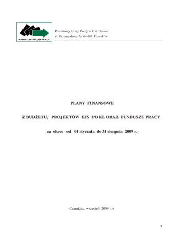 Powiatowy Urz d Pracy w Czarnkowie ul. Przemysłowa 2a, 64-700 Czarnków PPL LA AN NY Y FFIIN NA AN NSSO OW WE E Z ZB BU UD D E ET TU U,, PPR RO OJJE EK KT TÓ ÓW WE EFFSS PPO OK KL LO OR RA AZ Z FFU UN ND DU USSZ ZU U PPR RA AC CY Y zzaa ookkrreess oodd 0011 ssttyycczznniiaa ddoo 3311 ssiieerrppnniiaa 22000099 rr.. Czarnków, wrzesie 2009 rok 1 Powiatowy Urz d Pracy w Czarnkowie realizuje zadania na podstawie ustawy z dnia 20 kwietnia 2004 roku o promocji zatrudnienia i instytucjach rynku pracy ( Dz. U.2008 Nr 69, poz.415 z pó n.zm.), stosuj c ustaw z dnia 30 czerwca 2005 r. o finansach publicznych (Dz.U. Nr 249, poz.2104 z pó n.zm.). Fundusz Pracy jest pa stwowym funduszem celowym przeznaczonym na zasiłki dla bezrobotnych i aktywizacj zawodow osób bezrobotnych. Głównym dysponentem rodków Funduszu Pracy jest Minister Pracy i Polityki Społecznej , który przekazuje samorz dom powiatowym rodki obligatoryjnie do wysoko ci potrzeb zwi zanych z wypłat zasiłków dla bezrobotnych i dodatków aktywizacyjnych , natomiast na wydatki zwi zane z realizacj programów na rzecz promocji zatrudnienia, łagodzenia skutków bezrobocia i aktywizacji zawodowej osób bezrobotnych, rodki s limitowane do wysoko ci wynikaj cej z algorytmu ich podziału, który uwzgl dnia poziom i struktur bezrobotnych w poszczególnych powiatach. Powiatowy Urz d Pracy w Czarnkowie na dzie 13.918.597 zł. z tego: I. 31.08.2009 r. dysponuje kwot rodków w wysoko ci Bud et w tym : - 4.587.397 zł. rodki na utrzymanie urz du - 1.721.433 zł. - finansowanie kosztów wynagrodze i składki na ubezpieczenie społeczne pracowników urz du - 461.200 zł. - finansowanie składki na ubezpieczeni zdrowotne osób bezrobotnych bez prawa do zasiłku 2.345.400 zł. - projekt konkursowy 2008/2009 EFS PO KL 6.1.2 dotacja rozwojowa 59.364 – zł. II. Fundusz Pracy na realizacj programów na rzecz promocji zatrudnienia, łagodzenia skutków bezrobocia i aktywizacji zawodowej osób bezrobotnych w tym: 8.581,900 zł. - decyzja Ministra Pracy i Polityki Społecznej Nr DF.I.-4021/15a/MK/09 z dnia 27 lutego 2009 r. o przyznaniu rodków na Fundusz Pracy dot. realizacji zada na rzecz promocji zatrudnienia, łagodzenia skutków bezrobocia i aktywizacji zawodowej w wysoko ci : 2.851,7 tys.zł. - decyzja Ministra Pracy i Polityki Społecznej Nr DF.I.-4021/15a- zw/MK/09 z dnia 10.04.2009 o przyznaniu rodków na Fundusz Pracy na finansowanie aktywnych form w ramach programów na rzecz promocji zatrudnienia, łagodzenia skutków bezrobocia i aktywizacji zawodowej – rezerwa Samorz du Województwa Wielkopolskiego w wysoko ci: 631,2 tys.zł. - decyzja Ministra Pracy i Polityki Społecznej Nr DF.I.-4021/15rm- MK/09 z dnia 11.05.2009 o przyznaniu rodków na Fundusz Pracy na finansowanie aktywnych form w ramach programów na rzecz promocji zatrudnienia, łagodzenia skutków bezrobocia i aktywizacji zawodowej – rezerwa Ministra Pracy w wysoko ci: 1.443,1 tys.zł. - decyzja Ministra Pracy i Polityki Społecznej Nr DF.I.-4021/15pokl- /MK/09 z dnia 26.05.2009 o przyznaniu rodków na Fundusz Pracy na finansowanie aktywnych form w ramach programów na rzecz promocji zatrudnienia, łagodzenia skutków bezrobocia i aktywizacji zawodowej – rezerwa Samorz du Województwa Wielkopolskiego w wysoko ci: 2.220,6 tys.zł. – projekt EFS PO KL „Od bierno ci do aktywno ci 6.1.3 ( plan finansowy zgodnie z umow o dofinansowanie w złotych: 2.220.553,20 zł.) - decyzja Ministra Pracy i Polityki Społecznej Nr DF.I.-4021/15rm1- MK/09 z dnia 13.07.2009 o przyznaniu rodków na Fundusz Pracy na finansowanie aktywnych form w ramach programów na rzecz promocji zatrudnienia, łagodzenia skutków bezrobocia i aktywizacji zawodowej – rezerwa Ministra Pracy w wysoko ci: 1.435,3 tys.zł. 2 III. 749.300 zł. rodki Funduszu Pracy na finansowanie innych fakultatywnych zada - decyzja Ministra Pracy i Polityki Społecznej Nr DF.I.-4021/15a/MK/09 z dnia 27 lutego 2009 r. o przyznaniu rodków na Fundusz Pracy dot. finansowania innych fakultatywnych zada w wysoko ci : 749,3 tys.zł. I. rodki bud etowe w wysoko ci : 4.587.397 zł. Plan finansowy bud etu działalno ci podstawowej Powiatowego Urz du Pracy w Czarnkowie na 2009 r. Nazwa paragrafu Paragraf Plan finansowy na 2009r po zmianach. 3020 Nagrody i wydatki osobowe nie zaliczane do wynagrodze . 4010 Wynagrodzenia osobowe pracowników 4040 Dodatkowe wynagrodzenie roczne 101.660 4110 Składki na ubezpieczenie społeczne 170.673 4120 Składka na Fundusz Pracy 32.000 4210 Zakup materiałów i wyposa enia 40.470 4260 Zakup energii 51.502 4270 Zakup usług remontowych 3.139 4280 Zakup usług zdrowotnych 4.000 4300 Zakup usług pozostałych 14.539 4360 Opłaty z tyt. zakupu usług telekomunikacyjnych telefonii komórkowe 2.258 4370 Opłaty z tyt. zakupu usług telekomunikacyjnych telefonii stacjonarnej 13.583 4440 Opłaty za administrowanie i czynsze za budynki, lokale i pomieszczenia gara owe 60.411 4410 Podró e słu bowe krajowe 13.000 4430 Ró ne opłaty i składki 4440 Odpisy na ZF S 4480 Podatek od nieruchomo ci 4520 Opłaty na rzecz bud etów jst 4700 Szkolenia pracowników nieb d cych członkami korpusu słu by cywilnej 4740 Zakup materiałów papierniczych do sprz tu drukarskiego i urz dze kserograficznych 4750 Zakup akcesoriów do komputerów w tym programów i licencji Razem : 3.200 1.150.890 4.200 45.002 8.169 217 1.420 100 1.000 1.721.433 zł. 3 Powiatowy Urz d Pracy w Czarnkowie oprócz rodków finansowych przeznaczonych na utrzymanie urz du otrzymał równie rodki finansowe na: 1. Finansowanie kosztów wynagrodzenia i składek na ubezpieczenie społeczne pracowników urz du. 2. Zadania zlecone - składka na ubezpieczenie zdrowotne osób bezrobotnych bez prawa do zasiłku. 3. Projekt EFS PO KL/06.01.03-30-002/08 pod nazw „Nowe wyzwania – nowe działania – Priorytet VI – Rynek pracy otwarty dla wszystkich, działanie 6.1 – Poprawa dost pu do zatrudnienia oraz wspieranie aktywno ci zawodowej w regionie, poddziałan