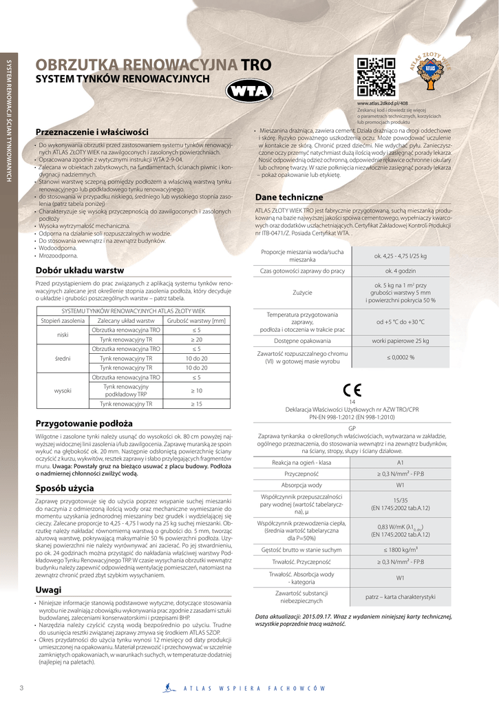 SYSTEM RENOWACJI ŚCIAN TYNKOWANYCH OBRZUTKA RENOWACYJNA TRO SYSTEM TYNKÓW RENOWACYJNYCH www.atlas.2dkod.pl/408 Zeskanuj kod i dowiedz się więcej o parametrach technicznych, korzyściach lub promocjach produktu Przeznaczenie i właściwości • Do wykonywania obrzutki przed zastosowaniem systemu tynków renowacyjnych ATLAS ZŁOTY WIEK na zawilgoconych i zasolonych powierzchniach. • Opracowana zgodnie z wytycznymi instrukcji WTA 2-9-04. • Zalecana w obiektach zabytkowych, na fundamentach, ścianach piwnic i kondygnacji nadziemnych. • Stanowi warstwę sczepną pomiędzy podłożem a właściwą warstwą tynku renowacyjnego lub podkładowego tynku renowacyjnego. • do stosowania w przypadku niskiego, średniego lub wysokiego stopnia zasolenia (patrz tabela poniżej) • Charakteryzuje się wysoką przyczepnością do zawilgoconych i zasolonych podłoży • Wysoka wytrzymałość mechaniczna. • Odporna na działanie soli rozpuszczalnych w wodzie. • Do stosowania wewnątrz i na zewnątrz budynków. • Wodoodporna. • Mrozoodporna. Dobór układu warstw Przed przystąpieniem do prac związanych z aplikacją systemu tynków renowacyjnych zalecane jest określenie stopnia zasolenia podłoża, który decyduje o układzie i grubości poszczególnych warstw – patrz tabela. SYSTEMU TYNKÓW RENOWACYJNYCH ATLAS ZŁOTY WIEK ATLAS ZŁOTY WIEK TRO jest fabrycznie przygotowaną, suchą mieszanką produkowaną na bazie najwyższej jakości spoiwa cementowego, wypełniaczy kwarcowych oraz dodatków uszlachetniających. Certyfikat Zakładowej Kontroli Produkcji nr ITB-0471/Z. Posiada Certyfikat WTA. . Proporcje mieszania woda/sucha mieszanka ok. 4,25 - 4,75 l/25 kg Czas gotowości zaprawy do pracy ok. 4 godzin Zużycie ok. 5 kg na 1 m2 przy grubości warstwy 5 mm i powierzchni pokrycia 50 % od +5 °C do +30 °C Grubość warstwy [mm] Obrzutka renowacyjna TRO ≤5 Temperatura przygotowania zaprawy, podłoża i otoczenia w trakcie prac Dostępne opakowania worki papierowe 25 kg Zawartość rozpuszczalnego chromu (VI) w gotowej masie wyrobu ≤ 0,0002 % Tynk renowacyjny TR ≥ 20 Obrzutka renowacyjna TRO ≤5 Tynk renowacyjny TR 10 do 20 Tynk renowacyjny TR 10 do 20 Obrzutka renowacyjna TRO ≤5 Tynk renowacyjny podkładowy TRP ≥ 10 Tynk renowacyjny TR ≥ 15 średni wysoki Przygotowanie podłoża Wilgotne i zasolone tynki należy usunąć do wysokości ok. 80 cm powyżej najwyższej widocznej linii zasolenia i/lub zawilgocenia. Zaprawę murarską ze spoin wykuć na głębokość ok. 20 mm. Następnie odsłoniętą powierzchnię ściany oczyścić z kurzu, wykwitów, resztek zaprawy i słabo przylegających fragmentów muru. Uwaga: Powstały gruz na bieżąco usuwać z placu budowy. Podłoża o nadmiernej chłonności zwilżyć wodą. Sposób użycia Zaprawę przygotowuje się do użycia poprzez wsypanie suchej mieszanki do naczynia z odmierzoną ilością wody oraz mechaniczne wymieszanie do momentu uzyskania jednorodnej mieszaniny bez grudek i wydzielającej się cieczy. Zalecane proporcje to 4,25 - 4,75 l wody na 25 kg suchej mieszanki. Obrzutkę należy nakładać równomierną warstwą o grubości do. 5 mm, tworząc ażurową warstwę, pokrywającą maksymalnie 50 % powierzchni podłoża. Uzyskanej powierzchni nie należy wyrównywać ani zacierać. Po jej stwardnieniu, po ok. 24 godzinach można przystąpić do nakładania właściwej warstwy Podkładowego Tynku Renowacyjnego TRP. W czasie wysychania obrzutki wewnątrz budynku należy zapewnić odpowiednią wentylację pomieszczeń, natomiast na zewnątrz chronić przed zbyt szybkim wysychaniem. Uwagi • Niniejsze informacje stanowią podstawowe wytyczne, dotyczące stosowania wyrobu nie zwalniają z obowiązku wykonywania prac zgodnie z zasadami sztuki budowlanej, zaleceniami konserwatorskimi i przepisami BHP. • Narzędzia należy czyścić czystą wodą bezpośrednio po użyciu. Trudne do usunięcia resztki związanej zaprawy zmywa się środkiem ATLAS SZOP. • Okres przydatności do użycia tynku wynosi 12 miesięcy od daty produkcji umieszczonej na opakowaniu. Materiał przewozić i przechowywać w szczelnie zamkniętych opakowaniach, w warunkach suchych, w temperaturze dodatniej (najlepiej na paletach). 3 Dane techniczne Zalecany układ warstw Stopień zasolenia niski • Mieszanina drażniąca, zawiera cement. Działa drażniąco na drogi oddechowe i skórę. Ryzyko poważnego uszkodzenia oczu. Może powodować uczulenie w kontakcie ze skórą. Chronić przed dziećmi. Nie wdychać pyłu. Zanieczyszczone oczy przemyć natychmiast dużą ilością wody i zasięgnąć porady lekarza. Nosić odpowiednią odzież ochronną, odpowiednie rękawice ochronne i okulary lub ochronę twarzy. W razie połknięcia niezwłocznie zasięgnąć porady lekarza – pokaż opakowanie lub etykietę. 14 Deklaracja Właściwości Użytkowych nr AZW TRO/CPR PN-EN 998-1:2012 (EN 998-1:2010) GP Zaprawa tynkarska o określonych właściwościach, wytwarzana w zakładzie, ogólnego przeznaczenia, do stosowania wewnątrz i na zewnątrz budynków, na ściany, stropy, słupy i ściany działowe. Reakcja na ogień - klasa A1 Przyczepność ≥ 0,3 N/mm2 - FP:B Absorpcja wody W1 Współczynnik przepuszczalności pary wodnej (wartość tabelaryczna), μ 15/35 (EN 1745:2002 tab.A.12) Współczynnik przewodzenia ciepła, (średnia wartość tabelaryczna dla P=50%) 0,83 W/mK (λ10, dry) (EN 1745:2002 tab.A.12) Gęstość brutto w stanie suchym ≤ 1800 kg/m3 Trwałość. Przyczepność ≥ 0,3 N/mm2 - FP:B Trwałość. Absorbcja wody - kategoria W1 Zawartość substancji niebezpiecznych patrz – karta charakterystyki Data aktualizacji: 2015.09.17. Wraz z wydaniem niniejszej karty technicznej, wszystkie poprzednie tracą ważność.