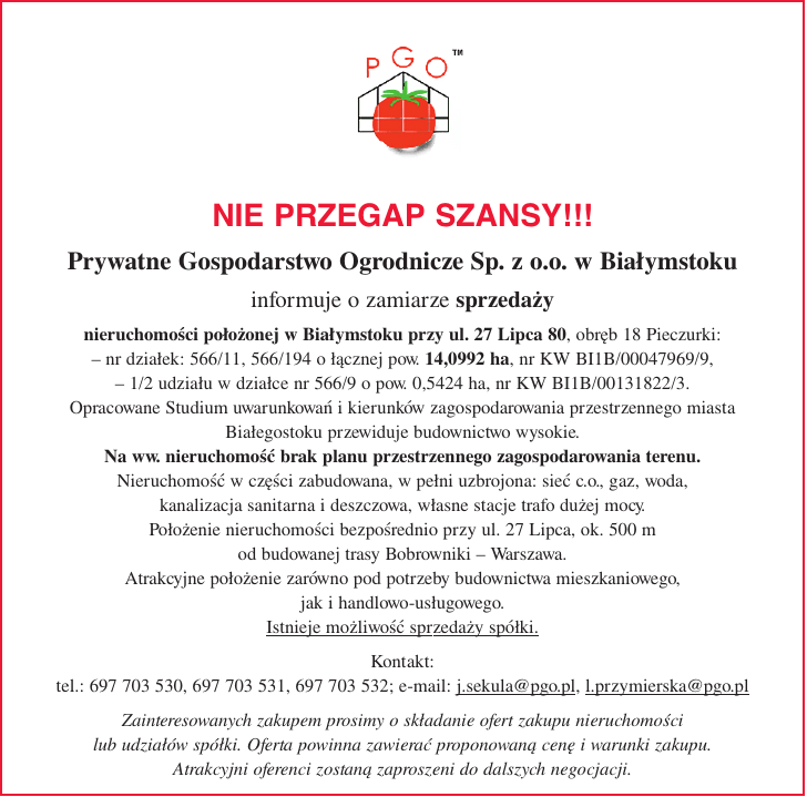 NIE PRZEGAP SZANSY!!! Prywatne Gospodarstwo Ogrodnicze Sp. z o.o. w Białymstoku informuje o zamiarze sprzedaży nieruchomości położonej w Białymstoku przy ul. 27 Lipca 80, obręb 18 Pieczurki: – nr działek: 566/11, 566/194 o łącznej pow. 14,0992 ha, nr KW BI1B/00047969/9, – 1/2 udziału w działce nr 566/9 o pow. 0,5424 ha, nr KW BI1B/00131822/3. Opracowane Studium uwarunkowań i kierunków zagospodarowania przestrzennego miasta Białegostoku przewiduje budownictwo wysokie. Na ww. nieruchomość brak planu przestrzennego zagospodarowania terenu. Nieruchomość w części zabudowana, w pełni uzbrojona: sieć c.o., gaz, woda, kanalizacja sanitarna i deszczowa, własne stacje trafo dużej mocy. Położenie nieruchomości bezpośrednio przy ul. 27 Lipca, ok. 500 m od budowanej trasy Bobrowniki – Warszawa. Atrakcyjne położenie zarówno pod potrzeby budownictwa mieszkaniowego, jak i handlowo-usługowego. Istnieje możliwość sprzedaży spółki. Kontakt: tel.: 697 703 530, 697 703 531, 697 703 532; e-mail: [email protected], [email protected] Zainteresowanych zakupem prosimy o składanie ofert zakupu nieruchomości lub udziałów spółki. Oferta powinna zawierać proponowaną cenę i warunki zakupu. Atrakcyjni oferenci zostaną zaproszeni do dalszych negocjacji.