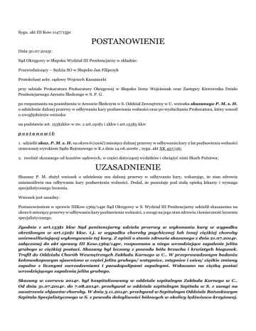 Sygn. akt III Kow.1147/15pr POSTANOWIENIE Dnia 30.07.2015r. Sąd Okręgowy w Słupsku Wydział III Penitencjarny w składzie: Przewodniczący – Sędzia SO w Słupsku Jan Filipczyk Protokolant sekr. sądowy Wojciech Kazaniecki przy udziale Prokuratora Prokuratury Okręgowej w Słupsku Ireny Wojcieszak oraz Zastępcy Kierownika Działu Penitencjarnego Aresztu Śledczego w S. P. G. po rozpoznaniu na posiedzeniu w Areszcie Śledczym w S. Oddział Zewnętrzny w U. wniosku skazanego P. M. s. H. o udzielenie dalszej przerwy w odbywaniu kary pozbawienia wolności oraz po wysłuchaniu Prokuratora, który wnosił o uwzględnienie wniosku na podstawie art. 153§1kkw w zw. z art.150§1 i 2kkw i art.153§5 kkw p o s t a n o w i ł: 1. udzielić skaz. P. M. s. H. na okres 6 (sześć) miesięcy dalszej przerwy w odbywaniu kary 2 lat pozbawienia wolności orzeczonej wyrokiem Sądu Rejonowego w K.z dnia 14.06.2006r., sygn. akt XK 457/06; 2. zwolnić skazanego od kosztów sądowych, w części dotyczącej wydatków i obciążyć nimi Skarb Państwa; UZASADNIENIE Skazany P. M. złożył wniosek o udzielenie mu dalszej przerwy w odbywaniu kary, wskazując, że stan zdrowia uniemożliwia mu odbywanie kary pozbawienia wolności. Dodał, że pozostaje pod stałą opieką lekarzy i wymaga specjalistycznego leczenia. Wniosek jest zasadny. Postanowieniem w sprawie IIIKow.1369/14pr Sąd Okręgowy w S. Wydział III Penitencjarny udzielił skazanemu na okres 6 miesięcy przerwy w odbywaniu kary pozbawienia wolności, z uwagi na jego stan zdrowia i konieczność leczenia specjalistycznego. Zgodnie z art.153§1 kkw Sąd penitencjarny udziela przerwy w wykonaniu kary w wypadku określonym w art.150§1 kkw. t.j. w wypadku choroby psychicznej lub innej ciężkiej choroby uniemożliwiającej wykonywanie tej kary. Z opinii o stanie zdrowia skazanego z dnia 21.07.2014r. załączonej do akt sprawy III Kow.1369/14pr, rozpoznano u niego wrzodziejące zapalenie jelita grubego w ciężkiej postaci. Skazany był leczony z powodu bólu brzucha i krwistych biegunek. Trafił do Oddziału Chorób Wewnętrznych Zakładu Karnego w C.. W przeprowadzonym badaniu kolonoskopowym ujawniono w części jelita grubego/ wstępnice, zstępnice i esica/ ciężkie zmiany zapalne z licznymi owrzodzeniami i pseudopolipami zapalnymi. Wskazano na ciężką postać wrzodziejącego zapalenia jelita grubego. Skazany w czerwcu 2014r. był hospitalizowany w oddziale szpitalnym Zakładu Karnego w C.. Od dnia 31.07.2014r. do 7.08.2014r. przebywał w oddziale szpitalnym Szpitala w S. z uwagi na zaostrzenie objawów choroby. W dniu 3.11.2014r. przebywał w Szpitalnym Oddziale Ratunkowym Szpitala Specjalistycznego w S. z powodu dolegliwości bólowych w okolicy lędźwiowo-krzyżowej. Wypisany został z zaleceniem kontynuowania leczenia w poradni ortopedycznej. Obecnie, skazany objęty jest stałą opieką lekarza rodzinnego. Otrzymał też skierowanie do poradni gastroenterologicznej. Nadto, skazany aktualnie pozostaje w okresie intensywnego leczenia także sterydami i nie może być leczony w warunkach więziennych zwłaszcza wobec dużego nasilenia zmian chorobowych. Jak wynika z ustaleń kuratora, nie można wykluczyć, że w bliskiej przyszłości zajdzie konieczność tzw. totalnej kolektomii tzn. całkowitego usunięcia skazanemu jelita grubego. Na dzień 3.08.2015r. skazany ma wyznaczony termin badania kolonoskopii w poradni specjalistycznej. W tej sytuacji, zdaniem Sądu należy stwierdzić, iż skazany wymaga dalszej, fachowej opieki medycznej, a specjalistyczne leczenie nie jest możliwe do prowadzenia w warunkach więziennej służby zdrowia. Mając na uwadze powyższe okoliczności należy bez wątpienia uznać, że wciąż zachodzi przesłanka wynikająca z treści art.150§1 i 2 kkw, a dotycząca ciężkiej choroby uniemożliwiającej wykonywanie kary, uzasadniająca udzielenie skazanemu dalszej przerwy w odbywaniu kary pozbawienia wolności. Dlatego też, uznając wniosek skazanego za zasadny, należało postanowić jak wyżej. O kosztach postępowania przed Sądem orzeczono na podstawie przepisu art.626§1 kpk w zw. z art.624§1 kpk w zw. z art.1§2kkw.