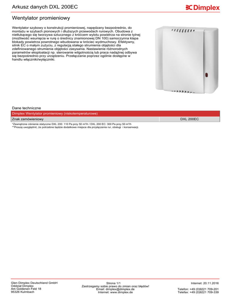 Arkusz danych DXL 200EC Wentylator promieniowy Wentylator szybowy o konstrukcji promieniowej, napędzany bezpośrednio, do montażu w szybach pionowych i dłuższych przewodach rurowych. Obudowa z nietłukącego się tworzywa sztucznego z króćcem wylotu powietrza na stronie tylnej (możliwość wsunięcia w rurę o średnicy znamionowej DN 100) samoczynna klapa blokady powietrza powrotnego wbudowana w króciec wydmuchowy. Efektywny, silnik EC o małym zużyciu, z regulacją stałego strumienia objętości dla zdefiniowanego strumienia objętości zasysania. Nastawienie różnorodnych parametrów eksploatacji np. sterowanie wilgotnością lub praca nadążnej odbywa się bezpośrednio przy urządzeniu. Przełączanie poprzez ogólnie dostępne w handlu włączniki/wyłączniki. Dane techniczne Dimplex Wentylator promieniowy (niskotemperaturowe) Znak zamówieniowy DXL 200EC *Zewnętrzne ciśnienie statyczne DXL 200: 110 Pa przy 50 m³/h / DXL 200 EC: 300 Pa przy 50 m³/h **Proszę uwzględnić, że potrzebne będzie dodatkowe miejsce dla przyłączenia rur, obsługi i konserwacji. Glen Dimplex Deutschland GmbH Oddział Dimplex Am Goldenen Feld 18 95326 Kulmbach Strona 1/1 Zastrzegamy sobie prawo do zmian oraz błędów! Email: [email protected] Internet: www.dimplex.de Internet: 20.11.2016 Telefon: +49 (0)9221 709-201 Telefax: +49 (0)9221 709-339