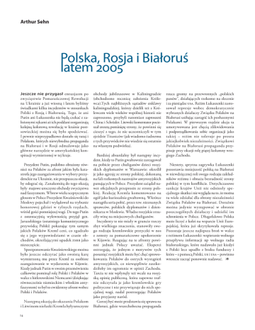 Arthur Sehn Polska, Rosja i Białoruś latem Jeszcze nie przygasł entuzjazm po zwycięstwie omarańczowej ewolucji na krainie a już wiosną i latem byliśmy świadkami kilku incydentów w stosunkach olski z osją i iałorusią ego że ani utin ani ukaszenka nie będą czekać z za łożonymi rękami aż ich poddani zorganizują kolejną kolorową rewolucję w krainie post sowieckiej można się było spodziewać pewnie nieprzypadkowo dostało się tutaj i olakom których niewybredna propaganda na iałorusi i w osji odmalowuje jako główne narzędzie w amerykańskiej kon spiracji wymierzonej w tej kraje rezydent utin podobno obrażony rów nież na olaków za afront jakim była kata strofa jego zaangażowania w wybory prezy denckie na krainie nie przepuszcza okazji by odegrać się anakomitą do tego okazją były majowe uroczyste obchody zwycięstwa nad faszyzmem brew wielu sceptycznym głosom w olsce rezydent waśniewski do oskwy pojechał i wylądował na trybunie honorowej gdzieś w tylnych rzędach wśród gości pomniejszej wagi o tego utin z ostentacyjnią wylewnością przyjął gen aruzelskiego ostatniego komunistycznego przywódcę olski pokazując tym samym jakich olaków reml ceni co zgadzało się z jego wypowiedziami w czasie ob chodów określającymi upadek jako nieszczęście postponowanie waśniewskiego można było jeszcze odczytać jako swoistą karę wymierzoną mu przez reml za osobiste zaangażowanie w wydarzenia w ijowie iedy jednak utin w swoim przemówieniu całkowite pominął rolę olski i olaków w walce z hitlerowskimi iemcami dziękując równocześnie niemieckim i włoskim anty faszystom to był to ewidentny afront wobec olski i olaków astępną okazją do okazania olakom i itwinom niełaski remla były uroczyste obchody jubileuszowe w aliningradzie obchodzono rocznicę założenia róle wcaych najbliższych sąsiadów enklawy kaliningradzkiej którzy dzielili też z ró lewcem wiele wieków wspólnej historii nie zaproszono przybyli natomiast zaproszeni hirac i chräder itewski komentator pocie szał zresztą pominiętę strony że powinni się cieszyć z tego że nie uczestniczyli w tym zjeździe itaniców jak wiadomo żadnemu z tych przywódców nie wiedzie się ostatnio na własnym podwórku ardziej absurdalny był następny incy dent kiedy to utin gwałtownie zareagował na pobicie przez chuliganów dzieci rosyj skich dyplomatów w arszawie określił je jako agresję ze strony polskiej dokonaną na fali rzekomych nastrojów antyrosyjskich panujących w olsce rezydent zażądał na wet oicjalnych przeprosin ze strony pols kiej eakcję remla komentowano na ogół jako kuriozalnie gwałtowną krótce nastąpiła seria pobić przez tzw nieznanych sprawców polskich dyplomatów i dzien nikarza w oskwie ładze rosyjskie zrzu ciły winę na miejscowych chuliganów ncydenty te nie miały w gruncie rzeczy zbyt wielkiego znaczenia stanowiły swe go rodzaju kremlowskie prztyczki w nos z zemsty za pomarańczowe upokorzenie w ijowie eagując na te afronty powi nni jednak olacy uważać ksperci ostrzegają że jednym z motywów tych posunięć rosyjskich może być chęć sprowo kowania olaków do ostrych wystąpień antyrosyjskich co niewątpliwie zaszko dziłoby im ogromnie w opinii achodu arcia te nie wpłynęły też wcale na rosyj ską opinię publiczną która zapewne traf nie odczytała je jako kremlowskie gry polityczne i nie przywiązuje do nich spe cjalnej wagi nadal postrzegając olaków jako przyjazny naród orzej być może przdstawia się sprawa na iałorusi gdzie wszechobecna propaganda rzuca gromy na przewrotnych polskich panów działających rzekomo na zlecenie i za pieniądze eżim ukaszenki zasto sował represje wobec demokratycznie wybranych działaczy wiązku olaków na iałorusi usiłując zastąpić ich posłusznymi olakami pierwszym rzędzie akcja ta umotywowana jest chęcią zlikwidowania i podporządkowania sobie organizacji jako takiej – reżim nie toleruje po prostu jakiejkolwiek niezależności wiązkowi olaków na iałorusi propaganda przy pisuje przy okazji rolę piątej kolumny wro giego achodu iestety sprytna zagrywka ukaszenki pozostawia mniejszość polską na iałorusi w niewdzięcznej roli swego rodzaju zakład ników reżimu i obnaża bezradność strony polskiej w tym konlikcie otychczasowe sankcje krajów nii nie odniosły spe cjalnego skutku i nie wygląda na to że można tu wiele zdziałać dla obrony niezależności wiązku olaków na iałorusi oraźnie można jedynie występować w obronie poszczególnych działaczy i udzielić im schronienia w olsce ługofalowo olska może liczyć z kolei na wsparcie nii uro pejskiej która już skrytykowała represje ozostaje jeszcze najlepsza broń w walce z reżimem ukaszenki wspieranie wolnego przepływu informacji np wolnego radia białoruskiego które nadawało już kiedyś z olski lecz upadło z braku funduszy i które – z pomocą olski i – powinno wreszcie zacząć ponownie nadawać Arthur Sehn Polen, Ryssland och Vitryssland, sommaren Än har inte entusiasmen efter den orange revolutionen i kraina lagt sig och redan under våren och sommaren ick vi bevittna ett par incidenter i olens relationer till yssland och itryssland tt varken utin eller ukasjenka tänker sitta med korslagda armar och vänta på att deras undersåtar ska organisera nästa färgglada revolution i det postsovjetiska landet var väntat ch säkert är det ingen tillfällighet att även polackerna har fått se på annat eras anspråkslösa pro paganda i itryssland och yssland fram ställs som det huvudsakliga verktyget i s konspiration mot dessa länder resident utin som även lär vara sur på polackerna för den nesa hans katastro fala engagemang i presidentvalen i kraina innebar försitter inte ett tillfälle att ge igen ägtidlighållandet i maj av segern äver fascismen var ett utmärkt tillfälle rots många skeptiska röster i olen åkte president wasniewski till oskva och hamnade bland mindre