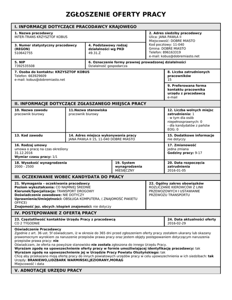 ZGŁOSZENIE OFERTY PRACY I. INFORMACJE DOTYCZĄCE PRACODAWCY KRAJOWEGO 1. Nazwa pracodawcy INTER-TRANS KRZYSZTOF KOBUS 2. Adres siedziby pracodawcy Ulica: JANA PAWŁA II Miejscowość: DOBRE MIASTO Kod pocztowy: 11-040 Gmina: DOBRE MIASTO Telefon: 896163319 e-mail: [email protected] 3. Numer statystyczny pracodawcy (REGON) 510642755 4. Podstawowy rodzaj działalności wg PKD 49.31.Z 5. NIP 7392535508 6. Oznaczenie formy prawnej prowadzonej działalności Działalność gospodarcza 7. Osoba do kontaktu: KRZYSZTOF KOBUS Telefon: 663929609 e-mail: [email protected] 8. Liczba zatrudnionych pracowników 15 9. Preferowana forma kontaktu pracownika urzędu z pracodawcą e-mail II. INFORMACJE DOTYCZĄCE ZGŁASZANEGO MIEJSCA PRACY 10. Nazwa zawodu pracownik biurowy 11.Nazwa stanowiska pracownik biurowy 12. Liczba wolnych miejsc zatrudnienia: 1 - w tym dla osób niepełnosprawnych: 0 - dla kandydatów z państw EOG: 0 13. Kod zawodu 14. Adres miejsca wykonywania pracy JANA PAWŁA II 15, 11-040 DOBRE MIASTO 15. Dodatkowe informacje nie dotyczy 16. Rodzaj umowy umowa o pracę na czas określony 31.12.2016 Wymiar czasu pracy: 1/1 18. Wysokość wynagrodzenia 2000 - 2500 17. Zmianowość jedna zmiana Godziny pracy: 9-17 19. System wynagrodzenia MIESIĘCZNY 20. Data rozpoczęcia zatrudnienia 2016-01-05 III. OCZEKIWANIE WOBEC KANDYDATA DO PRACY 21. Wymagania – oczekiwania pracodawcy Poziom wykształcenia: CO NAJMNIEJ ŚREDNIE Kierunek/Specjalizacja: TRANSPORT DROGOWY Doświadczenie zawodowe: NIE DOTYCZY Uprawnienia/Umiejętności: OBSŁUGA KOMPUTERA, ( ZNAJOMOŚĆ PAKIETU OFFICE) Znajomość jęz. obcych /stopień znajomości: nie dotyczy 22. Ogólny zakres obowiązków ROZLICZANIE KIEROWCÓW Z LINII PRZEWOZOWYCH I USTAWIANIE PRZEWOZU TRANSPORTU IV. POSTĘPOWANIE Z OFERTĄ PRACY 23. Częstotliwość kontaktów Urzędu Pracy z pracodawcą CO 2 TYGODNIE 24. Data aktualności oferty 2016-02-29 Oświadczenie Pracodawcy Zgodnie z art. 36 ust. 5f oświadczam, iż w okresie do 365 dni przed zgłoszeniem oferty pracy zostałem ukarany lub skazany prawomocnym wyrokiem za naruszenie przepisów prawa pracy oraz jestem objęty postępowaniem dotyczącym naruszenia przepisów prawa pracy: nie Oświadczam, że oferta na powyższe stanowisko nie została zgłoszona do innego Urzędu Pracy. Wyrażam zgodę na upowszechnienie oferty pracy w formie umożliwiającej identyfikację pracodawcy: tak Wyrażam zgodę na upowszechnienie jej w Urzędzie Pracy Powiatu Olsztyńskiego: tak Chcę aby przekazano moją ofertę pracy do innych powiatowych urzędów pracy w celu upowszechnienia w ich siedzibach: tak Urzędy: BRANIEWO,LIDZBARK WARMIŃSKI,JEZIORANY,MORĄG Miejscowość i data V. ADNOTACJE URZĘDU PRACY 25. Data przyjęcia zgłoszenia .................. 26. Numer zgłoszenia ofpr/...../.............. stpr/...../.............. ........................... 27. Imię i nazwisko pracownika przyjmującego ofertę Załącznik do oferty pracy 1. Poinformowano pracodawcę o ilości osób spełniających wymagania określone w ofercie pracy liczba osób ……………………………………………………………………………………………………………………………….... ……………………………………………………………………………………………………………………………….... …………………………….. data i podpis pracownika 2. Ofertę przekazano do upowszechnienia (nazwa PUP) ……………………………………………………………………………………… …………………………….. data i podpis pracownika 3. Ofertę przekazano całkowicie/częściowo do realizacji do ……………………………………………………………………........................ na wniosek ……………………………………………………… poinformowano o powyższym pracodawcę. …………………………….. data i podpis pracownika Urząd w którym udostępniono ofertę poinformował o wydaniu skierowania (ilość wydanych skierowań) ……………………. oraz o podjęciu pracy przez osobę skierowaną (wpisać tak lub nie) ………………. . …………………………….. data i podpis pracownika przyjmującego informację 4. Realizacja i aktualizacja ofert pracy oraz ustalenia z pracodawcą WEZWANE/SKIEROWANE OSOBY AKTUALIZACJE/INNE USTALENIA 1. data 2. podpis 3. 4. 5. 6. 7. 8. 9. 10. 11. 12. 13. 5. Ofertę zamknięto dnia ………………… z powodu ……………………………………………………………………..………….…………………………………………………………………………………………… ……............................... …………………………….. data i podpis pracownika