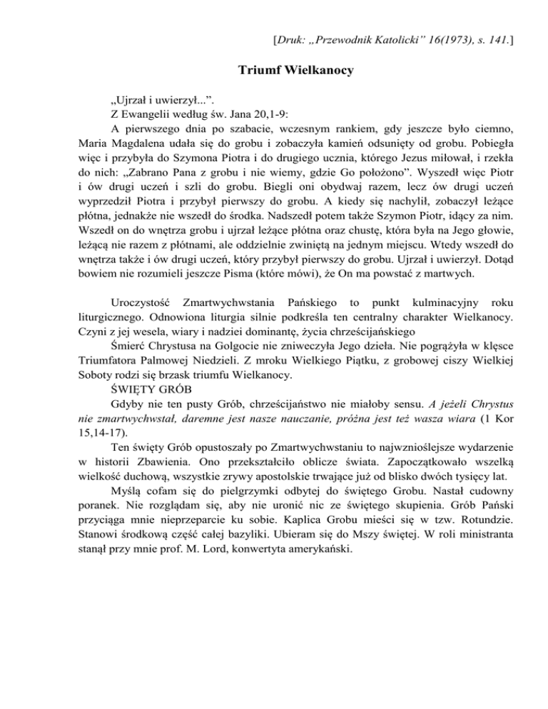 [Druk: „Przewodnik Katolicki” 16(1973), s. 141.] Triumf Wielkanocy „Ujrzał i uwierzył...”. Z Ewangelii według św. Jana 20,1-9: A pierwszego dnia po szabacie, wczesnym rankiem, gdy jeszcze było ciemno, Maria Magdalena udała się do grobu i zobaczyła kamień odsunięty od grobu. Pobiegła więc i przybyła do Szymona Piotra i do drugiego ucznia, którego Jezus miłował, i rzekła do nich: „Zabrano Pana z grobu i nie wiemy, gdzie Go położono”. Wyszedł więc Piotr i ów drugi uczeń i szli do grobu. Biegli oni obydwaj razem, lecz ów drugi uczeń wyprzedził Piotra i przybył pierwszy do grobu. A kiedy się nachylił, zobaczył leżące płótna, jednakże nie wszedł do środka. Nadszedł potem także Szymon Piotr, idący za nim. Wszedł on do wnętrza grobu i ujrzał leżące płótna oraz chustę, która była na Jego głowie, leżącą nie razem z płótnami, ale oddzielnie zwiniętą na jednym miejscu. Wtedy wszedł do wnętrza także i ów drugi uczeń, który przybył pierwszy do grobu. Ujrzał i uwierzył. Dotąd bowiem nie rozumieli jeszcze Pisma (które mówi), że On ma powstać z martwych. Uroczystość Zmartwychwstania Pańskiego to punkt kulminacyjny roku liturgicznego. Odnowiona liturgia silnie podkreśla ten centralny charakter Wielkanocy. Czyni z jej wesela, wiary i nadziei dominantę, życia chrześcijańskiego Śmierć Chrystusa na Golgocie nie zniweczyła Jego dzieła. Nie pogrążyła w klęsce Triumfatora Palmowej Niedzieli. Z mroku Wielkiego Piątku, z grobowej ciszy Wielkiej Soboty rodzi się brzask triumfu Wielkanocy. ŚWIĘTY GRÓB Gdyby nie ten pusty Grób, chrześcijaństwo nie miałoby sensu. A jeżeli Chrystus nie zmartwychwstał, daremne jest nasze nauczanie, próżna jest też wasza wiara (1 Kor 15,14-17). Ten święty Grób opustoszały po Zmartwychwstaniu to najwznioślejsze wydarzenie w historii Zbawienia. Ono przekształciło oblicze świata. Zapoczątkowało wszelką wielkość duchową, wszystkie zrywy apostolskie trwające już od blisko dwóch tysięcy lat. Myślą cofam się do pielgrzymki odbytej do świętego Grobu. Nastał cudowny poranek. Nie rozglądam się, aby nie uronić nic ze świętego skupienia. Grób Pański przyciąga mnie nieprzeparcie ku sobie. Kaplica Grobu mieści się w tzw. Rotundzie. Stanowi środkową część całej bazyliki. Ubieram się do Mszy świętej. W roli ministranta stanął przy mnie prof. M. Lord, konwertyta amerykański. Wchodzimy do Grobu. Chciałoby się spełnić rozkaz Boży dany kiedyś Mojżeszowi. Zdejm obuwie z nóg twoich; miejsce bowiem, na którym stoisz, ziemią Świętą jest (Wj. 3,5). Msza św. na Grobie Zwycięzcy śmierci! Formularz mszalny zawsze ten sam o Zmartwychwstaniu. W sercu Alleluja i bezkresny poryw ducha i serdeczna tęsknota za czymś, co kiedyś tak bliskim tu było. Po Mszy świętej mój ministrant mówi wzruszony: „Dziś to chyba najuroczystsza Wielkanoc. Na pewno nie zapomnimy o niej do śmierci”. Długo modlimy się przy Grobie. W duchu oglądamy te nieprzeliczone rzesze pielgrzymów, co tu od wieków klękają w głębokiej zadumie. Znalazł się wśród nich również nasz wieszcz Juliusz Słowacki. A oto co opowiedział w swym liście do matki z dnia 19 lutego 1837 roku: „Noc u Grobu Chrystusa przepędzona zostawiła mi mocne wrażenie na zawsze. O godzinie siódmej wieczór zamknięto kościół, zostałem sam i rzuciłem się z wielkim płaczem na kamień Grobu. Miałem Biblię, którą czytałem do jedenastej w nocy. O drugiej ksiądz-rodak wyszedł ze Mszą, a ja, klęcząc na tym miejscu, gdzie Anioł biały powiedział Magdalenie: «Nie ma Go tu, zmartwychwstał», słuchałem całej Mszy z głębokim uczuciem. O trzeciej nad ranem znużony, poszedłem do klasztoru i spałem snem dziecka, które się zmęczy łzami”. ŚWIĘTO WIARY W dzisiejszej Ewangelii św. Jan pisze o sobie, że wszedłszy do Grobu ujrzał to i uwierzył. Dotąd bowiem nie rozumieli Pisma, które mówi. że On musi zmartwychwstać. Wynika z tych słów, że Apostołowie przezywali wpierw pewne wahania. Mieli wątpliwości, czy Jezus faktycznie żyje. Dowodem tego wahania jest scena z Tomaszem. Chrystus każe niewiernemu Tomaszowi włożyć palec w rany swoje. Nie bądź niewierny, ale wierny. A potem dodaje: Żeś Mnie ujrzał, Tomaszu, uwierzyłeś. Błogosławieni, którzy nie widzieli, a uwierzyli (J 20,29). Zmartwychwstanie jest więc fundamentem naszej wiary. Od tego tez momentu zaczyna się ewangelizacja odkupionego świata. Kiedy św. Piotr objaśnia Dobrą Nowinę Korneliuszowi, kładzie szczególny nacisk na fakt Zmartwychwstania oraz na własne doświadczenie Jego życia po śmierci krzyżowej. A potem dodaje: Każdy kto w Niego wierzy, otrzymuje odpuszczenie grzechów przez imię Jego (Dz 10,43). Zjednoczenie z Panem życia przez wiarę i miłość powoduje usunięcie winy moralnej z człowieka. Jeśli z wiarą przeżywać będziemy tajemnice wielkanocne, Chrystus udzieli nam łask. jak udzielał uczniom po Zmartwychwstaniu. Chrystus żyje w naszych duszach i działa ustawicznie według stopnia naszej wiary. ŚWIĘTO NADZIEI Każde szczęście ludzkie, choćby najdoskonalsze, przyćmiewa cień obawy przed jego utratą. Ziemska nadzieja nigdy nie dorównuje naszym oczekiwaniom. I dlatego Apostoł stwierdza z naciskiem, że tylko nadzieja zrodzona z wiary jest żywa Taką właśnie żywą nadzieję zawdzięczamy Zmartwychwstałemu. On zdaje się mówić: „Dziś zajaśniał dla mnie blask wiecznego triumfu, ale straszna była noc wielkopiątkowa. Dziś w czarownych tęczach błyszczy moje zwycięstwo, ale okupione było morzem cierpienia i krwawej udręki. Każdy, kto razem ze mną odbywa drogę na wzgórze kalwaryjskie, będzie triumfował wespół ze mną w Chwale Ojca”. Zmartwychwstały utrwala w naszych sercach pewność zwycięstwa, sensowność życia, wyrywa nas z wątpień i sceptycyzmu. Przed nami jasno wytyczony cel. Nie lękamy się też konfrontacj