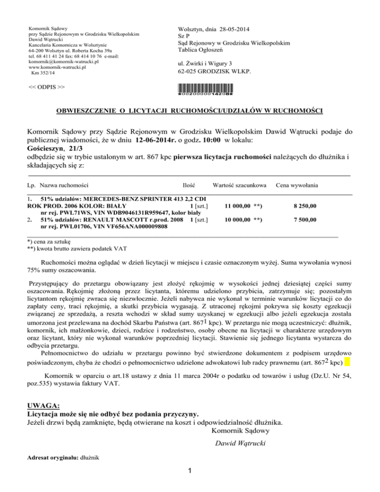 Komornik Sądowy przy Sądzie Rejonowym w Grodzisku Wielkopolskim Dawid Wątrucki Kancelaria Komornicza w Wolsztynie 64-200 Wolsztyn ul. Roberta Kocha 39a tel. 68 411 41 24 fax: 68 414 10 76 e-mail: [email protected] www.komornik-watrucki.pl Km 352/14 Wolsztyn, dnia 28-05-2014 Sz P Sąd Rejonowy w Grodzisku Wielkopolskim Tablica Ogłoszeń << ODPIS >> *0020000014208* ul. Żwirki i Wigury 3 62-025 GRODZISK WLKP. OBWIESZCZENIE O LICYTACJI RUCHOMOŚCI/UDZIAŁÓW W RUCHOMOŚCI Komornik Sądowy przy Sądzie Rejonowym w Grodzisku Wielkopolskim Dawid Wątrucki podaje do publicznej wiadomości, że w dniu 12-06-2014r. o godz. 10:00 w lokalu: Gościeszyn, 21/3 odbędzie się w trybie ustalonym w art. 867 kpc pierwsza licytacja ruchomości należących do dłużnika i składających się z: ____________________________________________________________________________________________________ Lp. Nazwa ruchomości Ilość Wartość szacunkowa Cena wywołania _____________________________________________________________________________________________________ 1. 51% udziałów: MERCEDES-BENZ SPRINTER 413 2,2 CDI ROK PROD. 2006 KOLOR: BIAŁY 1 [szt.] 11 000,00 **) 8 250,00 nr rej. PWL71WS, VIN WDB9046131R959647, kolor biały 2. 51% udziałów: RENAULT MASCOTT r.prod. 2008 1 [szt.] 10 000,00 **) 7 500,00 nr rej. PWL01706, VIN VF656ANA000009808 _______________________________________________________________________________________________________________________ *) cena za sztukę **) kwota brutto zawiera podatek VAT Ruchomości można oglądać w dzień licytacji w miejscu i czasie oznaczonym wyżej. Suma wywołania wynosi 75% sumy oszacowania. Przystępujący do przetargu obowiązany jest złożyć rękojmię w wysokości jednej dziesiątej części sumy oszacowania. Rękojmię złożoną przez licytanta, któremu udzielono przybicia, zatrzymuje się; pozostałym licytantom rękojmię zwraca się niezwłocznie. Jeżeli nabywca nie wykonał w terminie warunków licytacji co do zapłaty ceny, traci rękojmię, a skutki przybicia wygasają. Z utraconej rękojmi pokrywa się koszty egzekucji związanej ze sprzedażą, a reszta wchodzi w skład sumy uzyskanej w egzekucji albo jeżeli egzekucja została umorzona jest przelewana na dochód Skarbu Państwa (art. 8671 kpc). W przetargu nie mogą uczestniczyć: dłużnik, komornik, ich małżonkowie, dzieci, rodzice i rodzeństwo, osoby obecne na licytacji w charakterze urzędowym oraz licytant, który nie wykonał warunków poprzedniej licytacji. Stawienie się jednego licytanta wystarcza do odbycia przetargu. Pełnomocnictwo do udziału w przetargu powinno być stwierdzone dokumentem z podpisem urzędowo poświadczonym, chyba że chodzi o pełnomocnictwo udzielone adwokatowi lub radcy prawnemu (art. 8672 kpc) Komornik w oparciu o art.18 ustawy z dnia 11 marca 2004r o podatku od towarów i usług (Dz.U. Nr 54, poz.535) wystawia faktury VAT. UWAGA: Licytacja może się nie odbyć bez podania przyczyny. Jeżeli drzwi będą zamknięte, będą otwierane na koszt i odpowiedzialność dłużnika. Komornik Sądowy Dawid Wątrucki Adresat oryginału: dłużnik 1 Do wiadomości: 1. radca prawny Anna Gudańska Konkwista Sp. z o.o., 60-225 Poznań 2. Sąd Rejonowy w Grodzisku Wielkopolskim Tablica Ogłoszeń, 62-025 GRODZISK WLKP. 3. Sąd Rejonowy w Grodzisku Wlkp. Wydział Zamiejscowy w Wolsztynie Administracja-Tablica Ogłoszeń, 64-200 Wolsztyn 4. GE Money Bank S.A., 80-894 Gdańsk 5. a/a 2