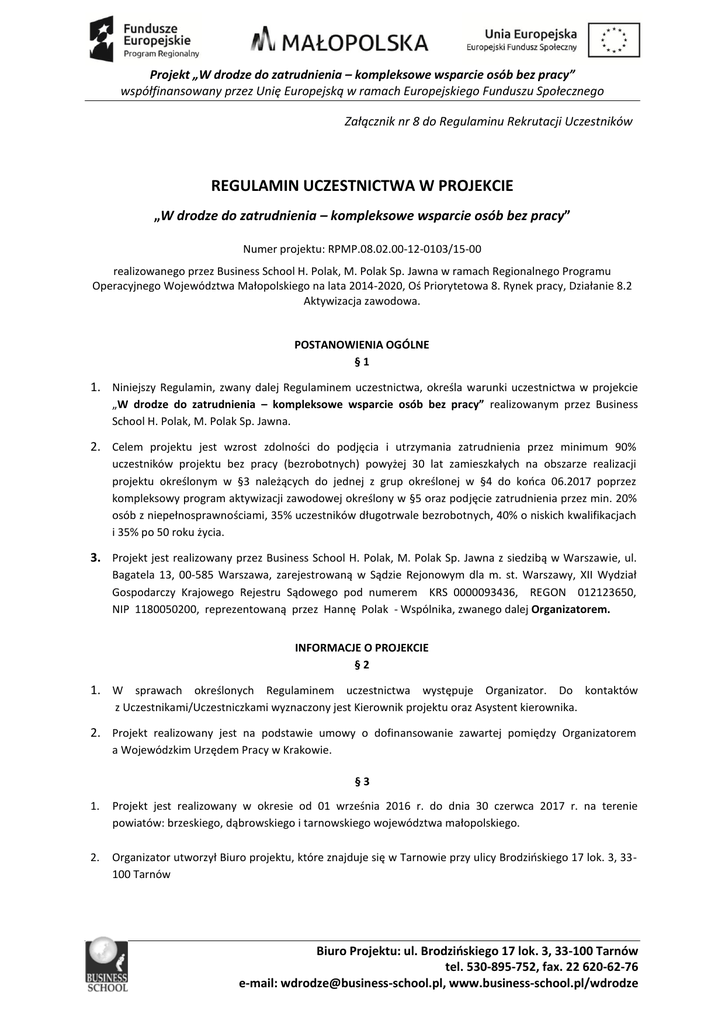 Projekt „W drodze do zatrudnienia – kompleksowe wsparcie osób bez pracy” współfinansowany przez Unię Europejską w ramach Europejskiego Funduszu Społecznego Załącznik nr 8 do Regulaminu Rekrutacji Uczestników REGULAMIN UCZESTNICTWA W PROJEKCIE „W drodze do zatrudnienia – kompleksowe wsparcie osób bez pracy” Numer projektu: RPMP.08.02.00-12-0103/15-00 realizowanego przez Business School H. Polak, M. Polak Sp. Jawna w ramach Regionalnego Programu Operacyjnego Województwa Małopolskiego na lata 2014-2020, Oś Priorytetowa 8. Rynek pracy, Działanie 8.2 Aktywizacja zawodowa. POSTANOWIENIA OGÓLNE §1 1. Niniejszy Regulamin, zwany dalej Regulaminem uczestnictwa, określa warunki uczestnictwa w projekcie „W drodze do zatrudnienia – kompleksowe wsparcie osób bez pracy” realizowanym przez Business School H. Polak, M. Polak Sp. Jawna. 2. Celem projektu jest wzrost zdolności do podjęcia i utrzymania zatrudnienia przez minimum 90% uczestników projektu bez pracy (bezrobotnych) powyżej 30 lat zamieszkałych na obszarze realizacji projektu określonym w §3 należących do jednej z grup określonej w §4 do końca 06.2017 poprzez kompleksowy program aktywizacji zawodowej określony w §5 oraz podjęcie zatrudnienia przez min. 20% osób z niepełnosprawnościami, 35% uczestników długotrwale bezrobotnych, 40% o niskich kwalifikacjach i 35% po 50 roku życia. 3. Projekt jest realizowany przez Business School H. Polak, M. Polak Sp. Jawna z siedzibą w Warszawie, ul. Bagatela 13, 00-585 Warszawa, zarejestrowaną w Sądzie Rejonowym dla m. st. Warszawy, XII Wydział Gospodarczy Krajowego Rejestru Sądowego pod numerem KRS 0000093436, REGON 012123650, NIP 1180050200, reprezentowaną przez Hannę Polak - Wspólnika, zwanego dalej Organizatorem. INFORMACJE O PROJEKCIE §2 1. W sprawach określonych Regulaminem uczestnictwa występuje Organizator. Do kontaktów z Uczestnikami/Uczestniczkami wyznaczony jest Kierownik projektu oraz Asystent kierownika. 2. Projekt realizowany jest na podstawie umowy o dofinansowanie zawartej pomiędzy Organizatorem a Wojewódzkim Urzędem Pracy w Krakowie. §3 1. Projekt jest realizowany w okresie od 01 września 2016 r. do dnia 30 czerwca 2017 r. na terenie powiatów: brzeskiego, dąbrowskiego i tarnowskiego województwa małopolskiego. 2. Organizator utworzył Biuro projektu, które znajduje się w Tarnowie przy ulicy Brodzińskiego 17 lok. 3, 33100 Tarnów Biuro Projektu: ul. Brodzińskiego 17 lok. 3, 33-100 Tarnów tel. 530-895-752, fax. 22 620-62-76 e-mail: [email protected], www.business-school.pl/wdrodze Projekt „W drodze do zatrudnienia – kompleksowe wsparcie osób bez pracy” współfinansowany przez Unię Europejską w ramach Europejskiego Funduszu Społecznego WARUNKI UCZESTNICTWA W PROJEKCIE §4 1. Wsparciem w ramach Projektu może zostać objęta osoba, która: a) jest osobą bez pracy (bezrobotną) w wieku powyżej 30 lat b) jest mieszkańcem województwa małopolskiego powiatu: brzeskiego, dąbrowskiego lub tarnowskiego w rozumieniu Kodeksu Cywilnego, c) należy do co najmniej 1 z grup znajdujących się w najtrudniejszej sytuacji na rynku pracy: i. osoba o niskich kwalifikacjach ii. osoba długotrwale bezrobotna iii. osoba po 50 roku życia iv. osoba z niepełnosprawnościami Weryfikacja nastąpi na podstawie przedłożonych oświadczeń/zaświadczeń. 2. Grupa docelowa projektu liczy 60 osób, w tym 40 kobiet i 20 mężczyzn. Nabór będzie prowadzony od: 09.2016 r. do 11.2016 r. (średnio 20 osób na miesiąc). 3. Uczestnictwo w projekcie rozpoczyna się w dniu udzielenia pierwszego wsparcia (np. początek zajęć) co nie uchybia wzajemnym obowiązkom stron wynikającym z umowy oraz deklaracji uczestnictwa obowiązującym od dnia zawarcia porozumienia. §5 Wsparcie w ramach Projektu obejmuje: 1. Obligatoryjną dla wszystkich Uczestników (40 Kobiet i 20 Mężczyzn) identyfikację indywidualnych potrzeb (IPD), na którą składają się: a) Spotkanie informacyjne – zostanie zorganizowane przed rozpoczęciem IPD, przewidziane jest 1 spotkanie trwające 6h dla 6 grup (10 osób każda), zakres: informacje na temat rynku pracy, działania w projekcie, cele i założenia IPD, budowanie motywacji. b) Identyfikacja indywidualnych potrzeb – Indywidualny Plan Działania (IPD – (obligatoryjne dla wszystkich 60 Uczestników projektu) przewidziane jest średnio dla Uczestnika 16h zegarowych spotkań indywidualnych (średnio 6 spotkań po 2-3h) oraz 10h spotkań grupowych (2 spotkania po 5h lekcyjnych), podczas których ustalany będzie Indywidualny Plan Działania m. in.: diagnoza potrzeb, sytuacji, zasobów i potencjałów, określenie predyspozycji, słabych i mocnych stron, bilans kompetencji. Zajęcia mogą odbywać się w miastach powiatowych objętych wsparciem lub/i w Tarnowie, terminy spotkań ustalane między poniedziałkiem a sobotą, w godzinach uzgodnionych z Uczestnikiem. Uczestnicy otrzymają segregator IPD z materiałami szkoleniowymi (skrypt), notatnik, długopis, zwrot kosztów dojazdu, a na zajęciach grupowych dodatkowo poczęstunek. 2. Wsparcie psychologiczno-doradcze – w ramach wsparcia przewidziane jest: a) Indywidualne wsparcie psychologiczne/poradnictwo zawodowe (w zależności od potrzeb zdiagnozowanych w IPD) – przewidziane są średnio 4 spotkania po 2h zegarowe (średnio 8h/osobę) dla 60 osób. Zakres: wspierany będzie procesu aktywizacji, motywacja, wiara we własne możliwości samoocena, potrzeby i wartości, kompetencje i zasoby, wspomaganie procesu poszukiwania pracy. Zajęcia mogą odbywać się w miastach powiatowych objętych wsparciem lub/i w Tarnowie, terminy spotkań ustalane będą między poniedziałkiem a sobotą, w godzinach uzgodnionych z Uczestnikiem. Dla Uczestników przewidziano zwrot kosztów dojazdu. c) Warsztaty poradnictwa zawodowego – przewidziane są dla osób, u których diagnoza IPD wskaże na konieczność wzmocnienia poszczególnych kompetencji, nabycie umiejętnośc