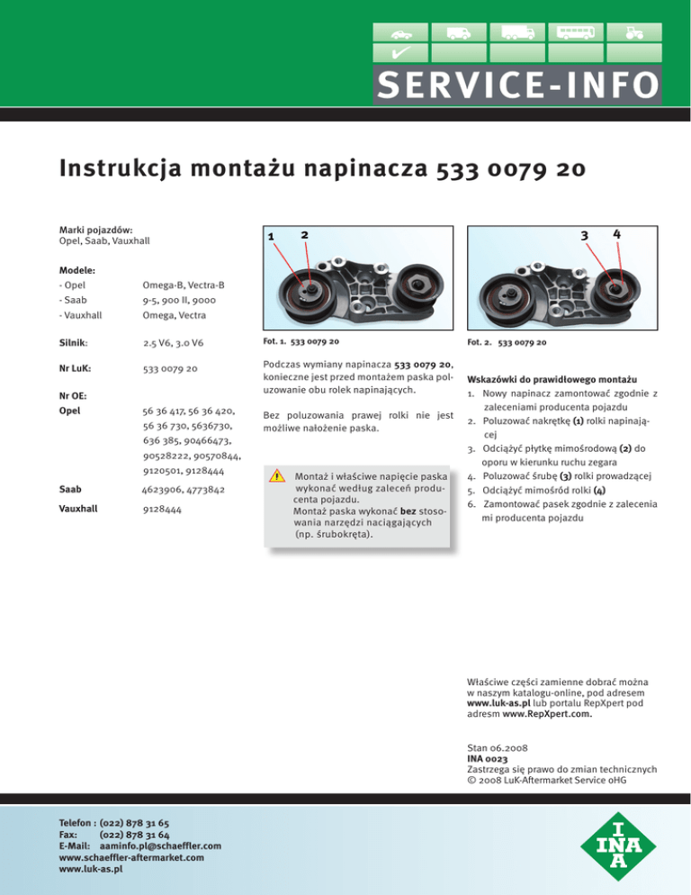 Instrukcja montażu napinacza 533 0079 20 Marki pojazdów: Opel, Saab, Vauxhall Modele: - Opel Omega-B, Vectra-B - Saab 9-5, 900 II, 9000 - Vauxhall Omega, Vectra Silnik: 2.5 V6, 3.0 V6 Fot. 1. 533 0079 20 Nr LuK: 533 0079 20 Podczas wymiany napinacza 533 0079 20, konieczne jest przed montażem paska poluzowanie obu rolek napinających. 56 36 417, 56 36 420, Bez poluzowania prawej rolki nie jest możliwe nałożenie paska. Nr OE: Opel 56 36 730, 5636730, 636 385, 90466473, 90528222, 90570844, 9120501, 9128444 Saab 4623906, 4773842 Vauxhall 9128444 Montaż i właściwe napięcie paska wykonać według zaleceń producenta pojazdu. Montaż paska wykonać bez stosowania narzędzi naciągających (np. śrubokręta). Fot. 2. 533 0079 20 Wskazówki do prawidłowego montażu 1. Nowy napinacz zamontować zgodnie z zaleceniami producenta pojazdu 2. Poluzować nakrętkę (1) rolki napinającej 3. Odciążyć płytkę mimośrodową (2) do oporu w kierunku ruchu zegara 4. Poluzować śrubę (3) rolki prowadzącej 5. Odciążyć mimośród rolki (4) 6. Zamontować pasek zgodnie z zalecenia mi producenta pojazdu Właściwe części zamienne dobrać można w naszym katalogu-online, pod adresem www.luk-as.pl lub portalu RepXpert pod adresm www.RepXpert.com. Stan 06.2008 INA 0023 Zastrzega się prawo do zmian technicznych © 2008 LuK-Aftermarket Service oHG Telefon :(022) 878 31 65 Fax: (022) 878 31 64 E-Mail: [email protected] www.schaeffler-aftermarket.com www.luk-as.pl