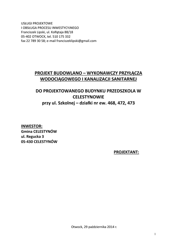 USŁUGI PROJEKTOWE I OBSŁUGA PROCESU INWESTYCYJNEGO Franciszek Lipski, ul. Kołłątaja 88/18 05-402 OTWOCK, tel. 510 175 332 fax 22 789 30 58; e-mail [email protected] PROJEKT BUDOWLANO – WYKONAWCZY PRZYŁĄCZA WODOCIĄGOWEGO I KANALIZACJI SANITARNEJ DO PROJEKTOWANEGO BUDYNKU PRZEDSZKOLA W CELESTYNOWIE przy ul. Szkolnej – działki nr ew. 468, 472, 473 INWESTOR: Gmina CELESTYNÓW ul. Regucka 3 05-430 CELESTYNÓW PROJEKTANT: Otwock, 29 października 2014 r. 1 Zawartość opracowania Projektu budowlano – wykonawczego przyłącza wodociągowego i kanalizacji sanitarnej do projektowanego budynku przedszkola w Celestynowie przy ul. Szkolnej, dz. nr ew. 468, 472, 473 1. Opis techniczny a) Kopia uprawnień projektanta oraz zaświadczenie o przynależności do Izby Inżynierów i Techników Budownictwa. b) Oświadczenie o zgodności rozwiązań projektowych z obowiązującymi przepisami i zasadami wiedzy technicznej. c) Uzgodnienie trasy przyłączy przez Naradę Koordynacyjną w Starostwie Powiatowym. d) Warunki techniczne podłączenia wydane przez Gospodarkę Komunalną w Celestynowie. 2. Rysunki 1) Plan zagospodarowania 1:500 2) Profil przyłącza wodociągowego 1:100/1:100 3) Profil przyłączy kanalizacji sanitarnej 1:100/1:200 4) Rzut parteru 1:100 2 OPIS TECHNICZNY Do Projektu budowlano – wykonawczego przyłącza wodociągowego i kanalizacji sanitarnej do projektowanego budynku przedszkola w Celestynowie przy ul. Szkolnej, dz. nr ew. 468, 472, 473 1. Podstawa opracowania - zlecenie inwestora – Gmina Celestynów, - mapa do celów projektowych 1:500, - obowiązujące przepisy, - wytyczne do projektowania wydane przez Gospodarkę Komunalną w Celestynowie. 2. Zakres opracowania Opracowanie zawiera projekt przyłączy kanalizacji sanitarnej odprowadzających ścieki bytowo-gospodarcze z projektowanego budynku przedszkola położonego na terenie nieruchomości ozn. dz. nr ew. 468, 472 i 473 w Celestynowie oraz przyłącza wodociągowego doprowadzającego wodę do w/w budynku. 3. Charakterystyka obiektu Projektowane przyłącze wodociągowe doprowadzać będzie wodę dla celów bytowogospodarczych do projektowanego budynku przedszkola z istniejącej sieci wodociągowej PVC Ø 110 mm zlokalizowanej w ul. Szkolnej. Projektowane przyłącza kanalizacji sanitarnej odprowadzać będą grawitacyjnie ścieki z projektowanego budynku przedszkola do istniejącej studni zaworowej DN 1000 mm zlokalizowanej na terenie nieruchomości ozn. dz. nr ew. 468. 3 4. Opis rozwiązań technicznych 4.1 Przyłącze wodociągowe Przewiduje się doprowadzenie wody do projektowanego budynku poprzez przyłącze wodociągowe wykonane z rur PE 100 SDR 11 (PN16) Ø 63 x 5,8 mm. Włączenie do istniejącej sieci wodociągowej wykonać za pomocą żeliwnego trójnika kołnierzowego DN 100/50/100 mm. Uzbrojenie przyłącza stanowić będzie zasuwa żeliwna kołnierzowa, miekkouszczelniająca DN 50 typ E znajdująca się bezpośrednio za miejscem włączenia do sieci. Na przedłużeniu wrzeciona zasuwy zamontować trzpień wprowadzony do sztywnej żeliwnej skrzynki ulicznej, prowadzony w obudowie ochronnej. Koniec trzpienia powinien się znajdować na głębokości 20 cm od powierzchni terenu. Obudowę zasuwy odcinającej należy umocnić w promieniu 30 cm za pomocą prefabrykowanych płyt betonowych. W celu stabilizacji przewodu wodociągowego pod zasuwą należy wykonać płytę podporową z betonu C12/15 o wymiarach 50x50x20 cm. Między płytą podporową a przewodem zastosować warstwę folii PE. Połączenia kołnierzowe zabezpieczyć antykorozyjnie np. taśmą DENSO. W miejscu przejścia przyłącza pod drogą gminną zastosować rurę osłonową PE Ø 110 x 10,0 mm SDR 17 PN 16. W rurze osłonowej należy przeciągnąć rurę przewodową ułożoną na płozach ślizgowych z zabezpieczeniem końców rury osłonowej manszetami gumowymi mocowanymi za pomocą obejm ściągających ze stali nierdzewnej. 4.2 Przyłącza kanalizacji sanitarnej Przewiduje się odprowadzenie ścieków sanitarnych z projektowanego budynku przedszkola poprzez przyłącze prowadzone w pasie zieleni. Zaprojektowano przyłącze z rur kielichowych PVC Ø 160 x 4,7 mm klasy „S” o sztywności SN 8 łączonych na uszczelki gumowe. W punkcie ozn. nr 1 na profilu podłużnym przyłącza kanalizacyjnego należy dokonać przebudowy studni kanalizacyjnej z Ø 315 na PP Ø 425 (kineta typu zbiorczego, przyłącza Ø 160 mm) oraz dokonać wymiany istniejącego odcinka przyłącza na długości 17,00 m. Włączenia do studni kanalizacyjnej dokonać należy za pomocą istniejącego króćca bosego PVC Ø 160 mm. 4 Uwaga: W pierwszej kolejności należy dokonać odkrywki istniejących sieci wodociągowych zlokalizowanych na terenie nieruchomości ozn. dz. nr ew. 468 celem ewentualnej korekty spadku hydraulicznego. Prace w obrębie sieci wodociągowych wykonywać ręcznie oraz pod nadzorem przedstawiciela Gospodarki Komunalnej w Celestynowie. Uzbrojenie przyłącza stanowią studnie rewizyjne PP Ø 315 i 425 mm z włazami żeliwnymi klasy A15. Studnie stawiać na podłożu piaskowo - żwirowym o grubości 15cm zagęszczonym do współczynnika 95% ZPPr. Poziom górnej powierzchni włazów kanalizacyjnych powinien być równy z powierzchnią terenu. Kanały i studzienki kanalizacyjne należy układać i posadawiać w odwodnionym wykopie zgodnie z „Instrukcją montażową” producenta rur i studzienek. Przepływ obliczeniowy przyłącza kanalizacyjnego K = 0,7 dm3/s L.p Nazwa przyboru Ilość [szt.] ΣAWs AWs 1 WC 31 2,5 77,5 2 Umywalka 40 0,5 20 3 Zlewozmywak 6 1,0 6 4 Natrysk 5 1,0 5 5 Wpust DN 100 14 2,0 28 ΣAWs 136,5 qs = 8,17 dm3/s Dla danego przepływu obliczeniowego prędkość wyniesie 1,07 m/s przy napełnieniu 44% całego przekroju poprzecznego (dla spadku równego 1,5%). 5 Roboty ziemne W przypadku występowania gruntów piaszczystych dopuszcza się niestosowanie podsypki piaskowej i układanie wodociągu w gruncie rodzimym. W razie nadmie