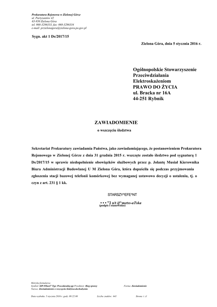 Prokuratura Rejonowa w Zielonej Górze ul. Partyzantów 42 65-950 Zielona Góra tel. 068-3286333, fax: 068-3286334 e-mail: [email protected] Sygn. akt 1 Ds/2017/15 Zielona Góra, dnia 5 stycznia 2016 r. Ogólnopolskie Stowarzyszenie Przeciwdziałania Elektroskażeniom PRAWO DO ŻYCIA ul. Bracka nr 16A 44-251 Rybnik ZAWIADOMIENIE o wszczęciu śledztwa Sekretariat Prokuratury zawiadamia Państwa, jako zawiadamiającego, że postanowieniem Prokuratora Rejonowego w Zielonej Górze z dnia 31 grudnia 2015 r. wszczęte zostało śledztwo pod sygnaturą 1 Ds/2017/15 w sprawie niedopełnienie obowiązków służbowych przez p. Jolantę Musiał Kierownika Biura Administracji Budowlanej U M Zielona Góra, która dopuściła się podczas przyjmowania zgłoszenia stacji bazowej telefonii komórkowej bez wymaganej ustawowo decyzji o ustaleniu, tj. o czyn z art. 231 § 1 kk. STARSZY^EFE^NT • • • ”2 o/t if^metss-aTska (podpis i stanowisko) Metryka formularza: Symbol: SIP-PZawl7 Typ: Proceduralny-pp Przedmiot: Bieg sprawy Nazwa: Zawiadomienie o wszczęciu śledztwa-dochodzenia Data wydruku: 5 stycznia 2016 r. godz. 09:22:00 Liczba znaków: 641 Forma: Zawiadomienie Strona i z1