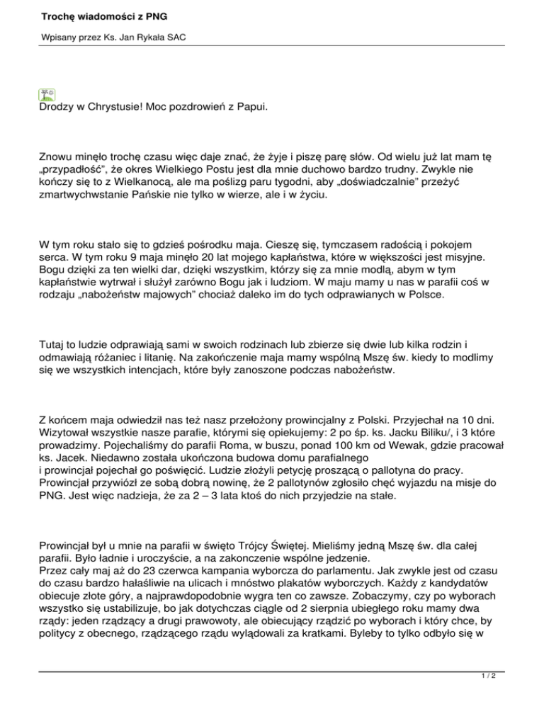 Trochę wiadomości z PNG Wpisany przez Ks. Jan Rykała SAC Drodzy w Chrystusie! Moc pozdrowień z Papui. Znowu minęło trochę czasu więc daje znać, że żyje i piszę parę słów. Od wielu już lat mam tę „przypadłość”, że okres Wielkiego Postu jest dla mnie duchowo bardzo trudny. Zwykle nie kończy się to z Wielkanocą, ale ma poślizg paru tygodni, aby „doświadczalnie” przeżyć zmartwychwstanie Pańskie nie tylko w wierze, ale i w życiu. W tym roku stało się to gdzieś pośrodku maja. Cieszę się, tymczasem radością i pokojem serca. W tym roku 9 maja minęło 20 lat mojego kapłaństwa, które w większości jest misyjne. Bogu dzięki za ten wielki dar, dzięki wszystkim, którzy się za mnie modlą, abym w tym kapłaństwie wytrwał i służył zarówno Bogu jak i ludziom. W maju mamy u nas w parafii coś w rodzaju „nabożeństw majowych” chociaż daleko im do tych odprawianych w Polsce. Tutaj to ludzie odprawiają sami w swoich rodzinach lub zbierze się dwie lub kilka rodzin i odmawiają różaniec i litanię. Na zakończenie maja mamy wspólną Mszę św. kiedy to modlimy się we wszystkich intencjach, które były zanoszone podczas nabożeństw. Z końcem maja odwiedził nas też nasz przełożony prowincjalny z Polski. Przyjechał na 10 dni. Wizytował wszystkie nasze parafie, którymi się opiekujemy: 2 po śp. ks. Jacku Biliku/, i 3 które prowadzimy. Pojechaliśmy do parafii Roma, w buszu, ponad 100 km od Wewak, gdzie pracował ks. Jacek. Niedawno została ukończona budowa domu parafialnego i prowincjał pojechał go poświęcić. Ludzie złożyli petycję proszącą o pallotyna do pracy. Prowincjał przywiózł ze sobą dobrą nowinę, że 2 pallotynów zgłosiło chęć wyjazdu na misje do PNG. Jest więc nadzieja, że za 2 – 3 lata ktoś do nich przyjedzie na stałe. Prowincjał był u mnie na parafii w święto Trójcy Świętej. Mieliśmy jedną Mszę św. dla całej parafii. Było ładnie i uroczyście, a na zakonczenie wspólne jedzenie. Przez cały maj aż do 23 czerwca kampania wyborcza do parlamentu. Jak zwykle jest od czasu do czasu bardzo hałaśliwie na ulicach i mnóstwo plakatów wyborczych. Każdy z kandydatów obiecuje złote góry, a najprawdopodobnie wygra ten co zawsze. Zobaczymy, czy po wyborach wszystko się ustabilizuje, bo jak dotychczas ciągle od 2 sierpnia ubiegłego roku mamy dwa rządy: jeden rządzący a drugi prawowoty, ale obiecujący rządzić po wyborach i który chce, by politycy z obecnego, rządzącego rządu wylądowali za kratkami. Byleby to tylko odbyło się w 1/2 Trochę wiadomości z PNG Wpisany przez Ks. Jan Rykała SAC pokojowy sposób. Pożyjemy zobaczymy. Pewnie będzie jak zwykle - trochę albo więcej zamieszania i oskarżen o korupcję itp. Taka to atmosfera szykuje się nam na przyszłe tygodnie. Pozdrawiam wszystkich serdecznie. Pamiętam w modlitwie i o nią proszę. Ks. Jan Rykała SAC 2/2