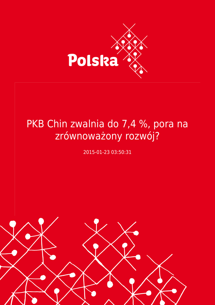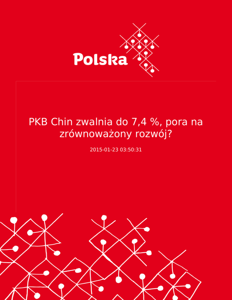 PKB Chin zwalnia do 7,4 %, pora na zrównoważony rozwój? 2015-01-23 03:50:31 2 Narodowe Biuro Statystyczne Chin, potwierdziło wcześniejsze prognozy: chińskie PKB w 2014 roku wzrosło zaledwie o 7,4%. Narodowe Biuro Statystyczne Chin, potwierdziło wcześniejsze prognozy: chińskie PKB w 2014 roku wzrosło zaledwie o 7,4%. Po raz pierwszy od kilkunastu lat nie udało się osiągnąć celu wyznaczonego jak co roku przez rząd. Międzynarodowy Fundusz Walutowy prognozuje, że chińskie PKB w 2015 może osiągnąć maximum 6,8%. Dynamika wzrostu jest najniższa od 24 lat, ale chińscy ekonomiści uspokajają- teraz rozwój będzie przebiegał wolniej , ale za to będzie bardziej zrównoważony. Zgodnie z przewidywaniami NBS, Chiny w najbliższym czasie czekają dwa wyzwania – korekta na rynku nieruchomości oraz narastające zadłużenie władz lokalnych. Jednocześnie podkreśla się, że na rynku nieruchomości mają miejsce bardzo widoczne pozytywne zmiany, a wspomniane zadłużenia są na poziomie, który łatwo kontrolować. NG/ Opr. na podst. „South China Morning Post” 3