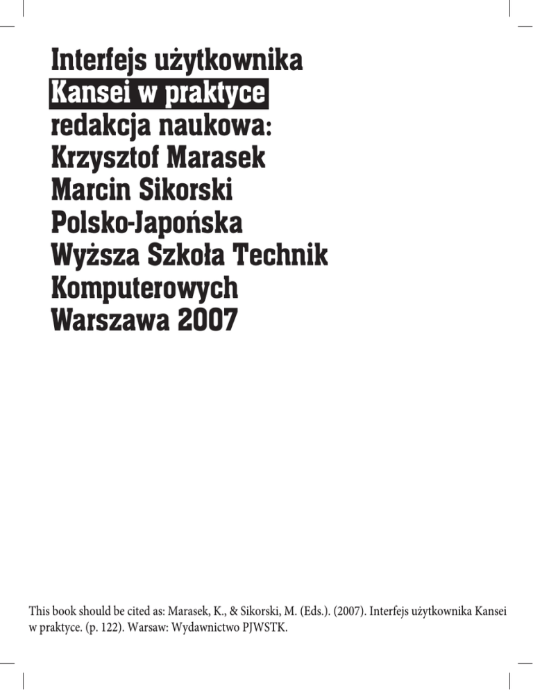 Interfejs użytkownika Kansei w praktyce redakcja naukowa: Krzysztof Marasek Marcin Sikorski Polsko-Japońska Wyższa Szkoła Technik Komputerowych Warszawa 2007 This book should be cited as: Marasek, K., & Sikorski, M. (Eds.). (2007). Interfejs użytkownika Kansei w praktyce. (p. 122). Warsaw: Wydawnictwo PJWSTK. > © Copyright by Wydawnictwo PJWSTK > Warszawa 2007 Wszystkie nazwy produktów są zastrzeżonymi nazwami handlowymi lub znakami towarowymi odpowiednich firm. Książki w całości lub części nie wolno powielać ani przekazywać w żaden sposób, nawet za pomocą nośników mechanicznych i elektronicznych (np. zapis magnetyczny) bez uzyskania pisemnej zgody Wydawnictwa > Redakcja naukowa dr hab. inż. Krzysztof Marasek dr hab. inż. Marcin Sikorski > Recenzenci dr hab. inż. Jerzy Grobelny dr hab. inż. Krzysztof Marasek dr hab. inż. Marcin Sikorski > Organizacja i redakcja techniczna mgr inż. Marcin Wichrowski > Opracowanie graficzne Aleksandra Machowiak, Daniel Mizieliński, www.hipopotamstudio.pl > Wydawnictwo Polsko-Japońskiej Wyższej Szkoły Technik Komputerowych ul. Koszykowa 86 02-008 Warszawa tel. 022-5844-526 email: [email protected] > ISBN 978-89244-62-4 > Oprawa miękka > Nakład: 200 egz. Spis treści 4 8 17 34 48 Słowo wstępne Rozdział 1/Kansei oraz japońskie tradycje projektowania Simon Shutte Towards a common Approach in Kansei Engineering Władysław Serwatowski Wabi sabi a kansei engineering Perspektywa historyczna – doświadczenia polskie Wojciech St. Mościbrodzki Kansei – biznes, nauka czy moda? Marcin Charkiewicz Kultura a użyteczność, czyli dlaczego Kansei powstało w Japonii? Rozdział 2/ Interfejs użytkownika w praktyce 58 66 76 84 96 103 112 Maciek Borówka Nowe trendy w interfejsach web Rafał Michalski, Jerzy Grobelny, Katarzyna Jach Wskaźniki aktywności wzrokowej w analizie przetwarzania przeduwagowego w procesach interakcyjnych Katarzyna Jach, Jerzy Grobelny, Rafał Michalski, Stanisław Rudnicki Zastosowanie testu Kruga w testowaniu prototypowym obcojęzycznych stron WWW Anna Bobkowska, Kamila Grabiec Integracja technik użyteczności i technik inżynierii oprogramowania w projekcie informatycznym Krzysztof Urbański, Szymon Błaszczyk User Experience w zero-budżetowych stronach internetowych Hubert Anyżewski, Bartosz Kuszewski Badanie Card Sorting na przykładzie tworzenia nawigacji dla Polskiej Organizacji Turystycznej Marcin Wichrowski Znaczenie barwy w interfejsie użytkownika Słowo wstępne > Wykorzystanie technik komputerowych do rozwiązywania coraz szerszego spektrum zagadnień i wynikająca stąd komplikacja techniczna oprogramowania sprawia, że problematyka prawidłowego zaprojektowania interfejsu użytkownika jest niezwykle istotna. Komputery wspomagają człowieka w niemal każdej formie działalności, ale systemy interaktywne stają się coraz bardziej złożone z technicznego punktu widzenia. Ze względu na powszechnośc korzystania z komputerów ich obsługa powinna być jak najłatwiejsza, jak najbardziej efektywna i przyjemna. > Z tego powodu dyscyplina zwana komunikacją człowiek-komputer (Human-Computer Interaction – HCI) rozwija się w wielu krajach dynamicznie, a prowadzone badania są ukierunkowane nie tylko na doskonalenie ergonomii interfejsu użytkownika oraz wysokiej użyteczności rozwiązań informatycznych. Liczy się w nich także, a może przede wszystkim, uzyskanie sukcesu rynkowego przez zapewnienie użytkownikowi wysokiej satysfakcji z produktu, włączając w to jego pozytywne odczucia emocjonalne. > Projektowanie zgodne z Kansei zdobywa coraz szersze uznanie w kręgach naukowych. Miarą tego zainteresowania są nowe konferencje naukowe na ten temat. I tak, na przykład, we wrześniu 2006 (po naszym seminarium) na uniwersytecie Aizu (Aizu-Wakamatsu, Fukushima, Japonia) odbyła się konferencja First International Conference on Kansei Engineering & Intelligent Systems, a w tym roku w Szwecji odbędzie się First European Conference on Affective Design and Kansei Engineering. Zapowiadane są kolejne konferencje, a od 2004 roku działa w Europe sieć naukowa ENGAGE łącząca uniwersytety i przemysłowe ośrodki badawcze zainteresowane wykorzystaniem emocji w projektowaniu. > Niniejsza publikacja stanowi drugie z kolei wydawnictwo „Interfejs użytkownika – Kansei w praktyce” (po wydaniu z 2006r.), które podejmuje próbę przedstawienia wybranych metod projektowania interfejsu użytkownika, jak i komunikacji człowiekkomputer w wykraczającym poza technikę, szerszym kontekście: organizacyjnym, społecznym i psychologicznym. > Poprzednia edycja zbioru artykułów pozwoliła środowisku osób zainteresowanych projektowaniem interakcji człowiek-komputer na poznanie źródeł pojęcia i etymologii słowa Kansei i dokonanie przeglądu aktualnie prowadzonych w Polsce prac z dziedziny projektowania i oceny jakości interfejsu dla użytkownika. W tym roku postanowiliśmy pogłębić prezentację japońskiej filozofii projektowania, pozostawiając referaty prezentujące kierunki badań nad użytecznością w naszym kraju. > Prezentowana publikacja zawiera artykuły zebrane i opracowane z inicjatywy Katedry Multimediów Polsko-Japońskiej Wyższej Szkoły Technik Komputerowych w Warszawie. > Publikacja została podzielona na dwie części: > Część I: Kansei i japońskie tradycje projektowania > Część II: Interfejs użytkownika w praktyce > W części I znajdują się artykuły dotyczące nawiązujące do podejścia Kansei oraz pozatechnicznych aspektów projektowania interakcji, głównie psychologicznych, kulturowych oraz emocjonalnych. Poza oryginalnymi artykułami polskich autorów, w tej części uwagę zwraca artykuł Simona Schütte z Linköping University, gdzie od 1999 roku działa grupa badawcza zajmująca się przenoszeniem podejścia projektowego Kansei do praktyki przemysłowej kraju tak kulturowo odmiennego od Japonii, jakim jest Szwecja. > Część II niniejszej publika