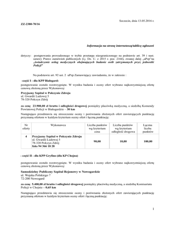 Szczecin, dnia 13.05.2016 r. ZZ-2380-70/16 Informacja na stronę internetową/tablicę ogłoszeń dotyczy: postępowania prowadzonego w trybie przetargu nieograniczonego na podstawie art. 39 i nast. ustawy Prawo zamówień publicznych (t.j. Dz. U. z 2015 r. poz. 2164), zwanej dalej „uPzp”na „świadczenie usług medycznych obejmujących badanie osób zatrzymanych przez jednostki Policji” Na podstawie art. 92 ust. 2 uPzp Zamawiający zawiadamia, że w zakresie : -część I - dla KPP Białogard: postępowanie zostało rozstrzygnięte. W wyniku badania i oceny ofert wybrano najkorzystniejszą ofertę cenową złożoną przez Wykonawcę: Przyjazny Szpital w Połczynie Zdroju ul. Gwardii Ludowej 5 78-320 Połczyn Zdrój za cenę 23.900,00 zł brutto i odległości drogowej pomiędzy placówką medyczną, a siedzibą Komendy Powiatowej Policji w Białogardzie – 30 km Następująco przedstawia się streszczenie oceny i porównania złożonych ofert zawierających punktację przyznaną ofertom w każdym kryterium oceny ofert i łączną punktację: Nr oferty 4 Wykonawca Przyjazny Szpital w Połczynie Zdroju ul. Gwardii Ludowej 5 78-320 Połczyn Zdrój faks 94 366 18 28 Liczba punktów wg kryterium cena Liczba punktów wg kryterium odległość drogowa Łączna liczba punktów 90,00 10,00 100,00 - część II - dla KPP Gryfino (dla KP Chojna) postępowanie zostało rozstrzygnięte. W wyniku badania i oceny ofert wybrano najkorzystniejszą ofertę cenową złożoną przez Wykonawcę: Samodzielny Publiczny Szpital Rejonowy w Nowogardzie ul. Wojska Polskiego 7 72-200 Nowogard za cenę 5.400,00 zł brutto i odległości drogowej pomiędzy placówką medyczną, a siedzibą Komisariatu Policji w Chojnie – 0,65 km Następująco przedstawia się streszczenie oceny i porównania złożonych ofert zawierających punktację przyznaną ofertom w każdym kryterium oceny ofert i łączną punktację: 1 Nr oferty 6 Wykonawca Samodzielny Publiczny Szpital Rejonowy w Nowogardzie ul. Wojska Polskiego 7 72-200 Nowogard faks 91 39 20 059 Liczba punktów wg kryterium cena Liczba punktów wg kryterium odległość drogowa Łączna liczba punktów 90,00 10,00 100,00 - część VI - dla KPP Pyrzyce: postępowanie zostało rozstrzygnięte. W wyniku badania i oceny ofert wybrano najkorzystniejszą ofertę cenową złożoną przez Wykonawcę: Szpital Powiatowy w Pyrzycach ul. Jana Pawła II nr 2 74-200 Pyrzyce za cenę 27.930,00 zł brutto i odległości drogowej pomiędzy placówką medyczną, a siedzibą Komendy Powiatowej Policji w Pyrzycach- 1 km Następująco przedstawia się streszczenie oceny i porównania złożonych ofert zawierających punktację przyznaną ofertom w każdym kryterium oceny ofert i łączną punktację: Nr oferty 2 Wykonawca Szpital Powiatowy w Pyrzycach ul. Jana Pawła II nr 2 74-200 Pyrzyce faks 91 579 32 27 Liczba punktów wg kryterium cena Liczba punktów wg kryterium odległość drogowa Łączna liczba punktów 90,00 10,00 100,00 - części VII – dla KPP Wałcz: postępowanie zostało rozstrzygnięte. W wyniku badania i oceny ofert wybrano najkorzystniejszą ofertę cenową złożoną przez Wykonawcę: 107 Szpital Wojskowy z Przychodnią Samodzielny Publiczny Zakład Opieki Zdrowotnej w Wałczu ul. Kołobrzeska 44 78-500 Wałcz za cenę 48.750,00 zł brutto i i odległości drogowej pomiędzy placówką medyczną, a siedzibą Komendy Miejskiej Policji w Szczecinie – 10 km Następująco przedstawia się streszczenie oceny i porównania złożonych ofert zawierających punktację przyznaną ofertom w każdym kryterium oceny ofert i łączną punktację: 2 Nr oferty Wykonawca 5 107 Szpital Wojskowy z Przychodnią Samodzielny Publiczny Zakład Opieki Zdrowotnej w Wałczu ul. Kołobrzeska 44 78-500 Wałcz faks 26 147 28 09 Liczba punktów wg kryterium cena Liczba punktów wg kryterium odległość drogowa Łączna liczba punktów 90,00 10,00 100,00 - część VIII- dla KMP Szczecin- tylko badania psychiatryczne: postępowanie zostało rozstrzygnięte. W wyniku badania i oceny ofert wybrano najkorzystniejszą ofertę cenową złożoną przez Wykonawcę: Samodzielny Publiczny Specjalistyczny Zakład Opieki Zdrowotnej „ZDROJE” ul. Mączna 4 70-780 Szczecin za cenę 5.400,00 zł brutto i odległości drogowej pomiędzy placówką medyczną, a siedzibą Komendy Miejską Policji w Szczecinie – 9,5 km Następująco przedstawia się streszczenie oceny i porównania złożonych ofert zawierających punktację przyznaną ofertom w każdym kryterium oceny ofert i łączną punktację: Nr oferty 3 Wykonawca Samodzielny Publiczny Specjalistyczny Zakład Opieki Zdrowotnej „ZDROJE” ul. Mączna 4 70-780 Szczecin Liczba punktów wg kryterium cena Liczba punktów wg kryterium odległość drogowa Łączna liczba punktów 90,00 10,00 100,00 faks 91 88 06 203 wyk. w 1 egz. wyk. A.G. 3