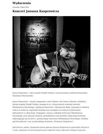 Wydarzenia Czwartek, 9 lipca 2015 Koncert Janusza Kasprowicza Janusz Kasprowicz – lider zespołu Projekt Volodia z towarzyszeniem multiinstrumentalisty Stanisława Marinczenko. Janusz Kasprowicz – muzyk, kompozytor, autor tekstów. Jest twórcą, liderem, wokalistą i basistą zespołu Projekt Volodia, znanego m.in. z brawurowych aranżacji utworów Włodzimierza Wysockiego, wspólnych koncertów z Mirosławem Baką, transmisji w radiowej Trójce ze studia im. Agnieszki Osieckiej oraz występów na ważnych wydarzeniach kulturalnych w całym kraju. Propagator, znawca i miłośnik twórczości Włodzimierza Wysockiego, juror podczas festiwali, pomysłodawca oraz dyrektor cyklicznego festiwalu odbywającego się od 2010 r. poświęconego twórczości Włodzimierza Wysockiego „Wołodia pod Szczelińcem” oraz wrocławskiego Festiwalu „Pieśniarze Niepokorni”. Specyficzna, męska, chropowata barwa głosowa Janusza Kasprowicza wprowadza słuchaczy w inne, odmienne od serwowanych przez większość stacji radiowych, klimaty muzyczne. Koncert duetu odbiega od stylistyki typowej dla występu bardów. Bogate instrumentarium, t. j. akordeon, buzuki, gitara basowa, mandolina i oczywiście gitary, zmienianie przez wykonawców, głównie Stanisława Marinczenko podczas koncertu, niebywale urozmaica brzmienie, które eliminuje monotonność występu, zwłaszcza podczas wirtuozerskich popisów multiinstrumentalisty. W programie: Włodzimierz Wysocki oraz rosyjskie pieśni błatne (bandyckie). Koncert zawiera utwory największego barda XX w. Włodzimierza Wysockiego oraz piosenki błatne, czyli rosyjskie więzienne, obozowe oraz opowiadające o życiu rosyjskiego półświatka. Utwory przetłumaczone na język polski przez cenionego poetę, autora tekstów i pieśniarza Romana Kołakowskiego. Każdy z powyższych koncertów wzbogacony jest również o piosenki autorskie, napisane przez Janusza Kasprowicza do własnych tekstów oraz wierszy Czesława Miłosza i Andrzeja Bursy.